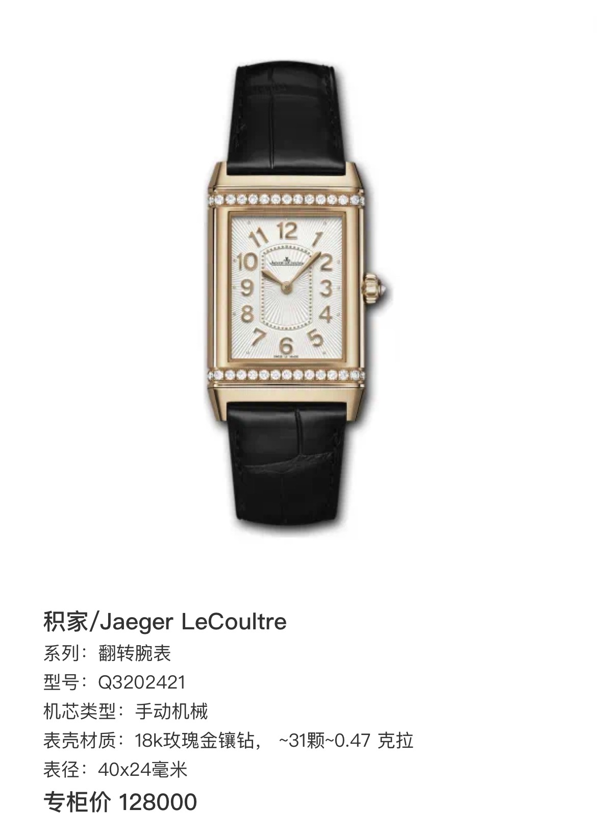 积家/Jaeger LeCoultre 翻转腕表 Q3202421 手动机械 18k玫瑰金镶钻, ~31颗~0.47 克拉 40x24毫米 专柜价128000 全新闲置 膜还在~