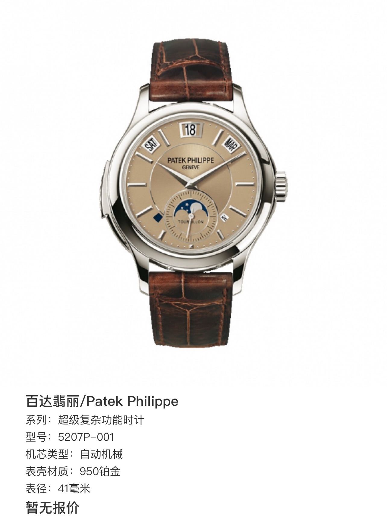 百达翡丽超级复杂功能时计5207P-001 三问陀飞轮 41mm表径 铂金材质 具有日期 星期 月份 年历 月相显示和万年历 陀飞轮 三问报时功能