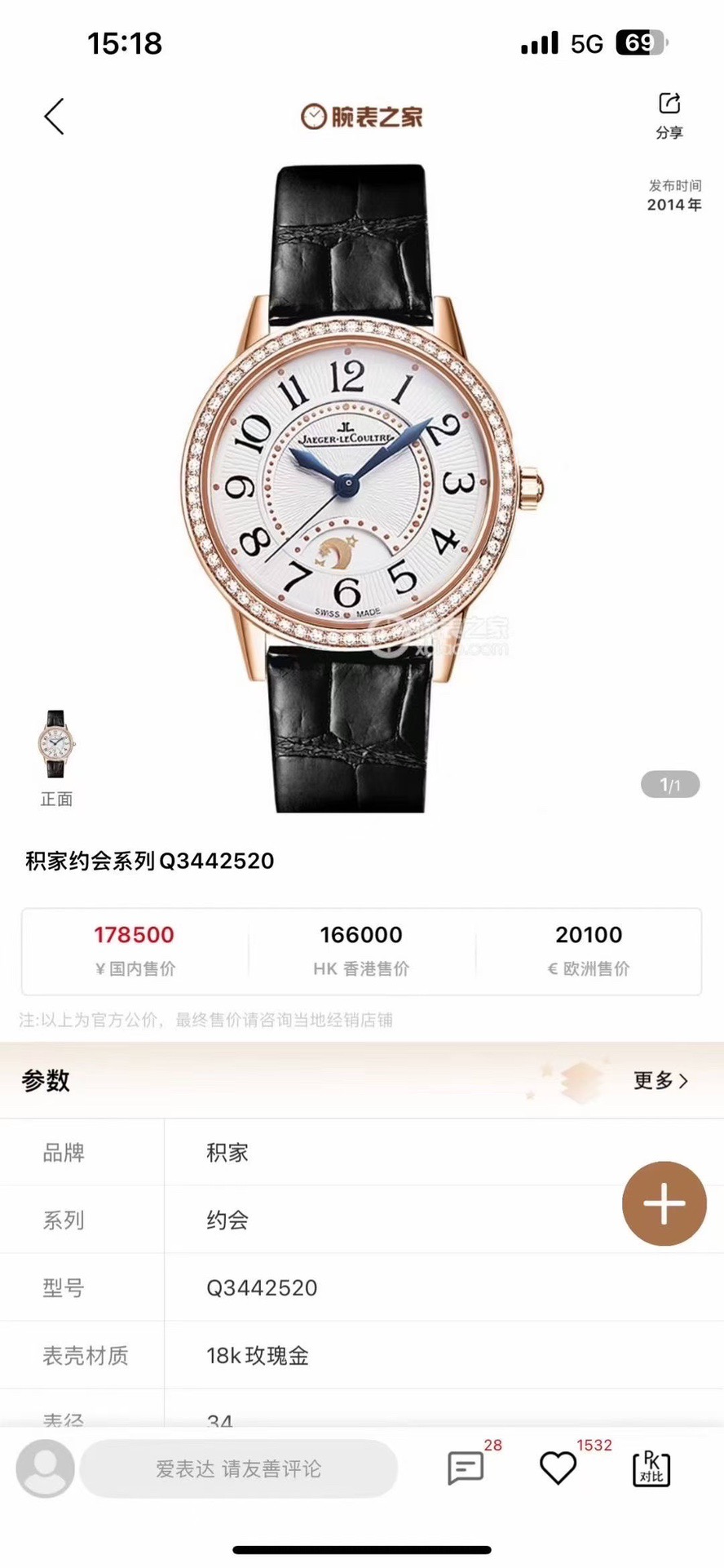积家/Jaeger LeCoultre 约会 Q3442520 自动机械 18k玫瑰金 34毫米 专柜价178500 积家 约会系列18k金自动机械女士腕表,表径34mm,18k金材质,原钻镶嵌,上手奢华精致,专柜178500,极品二手单表现好价~
