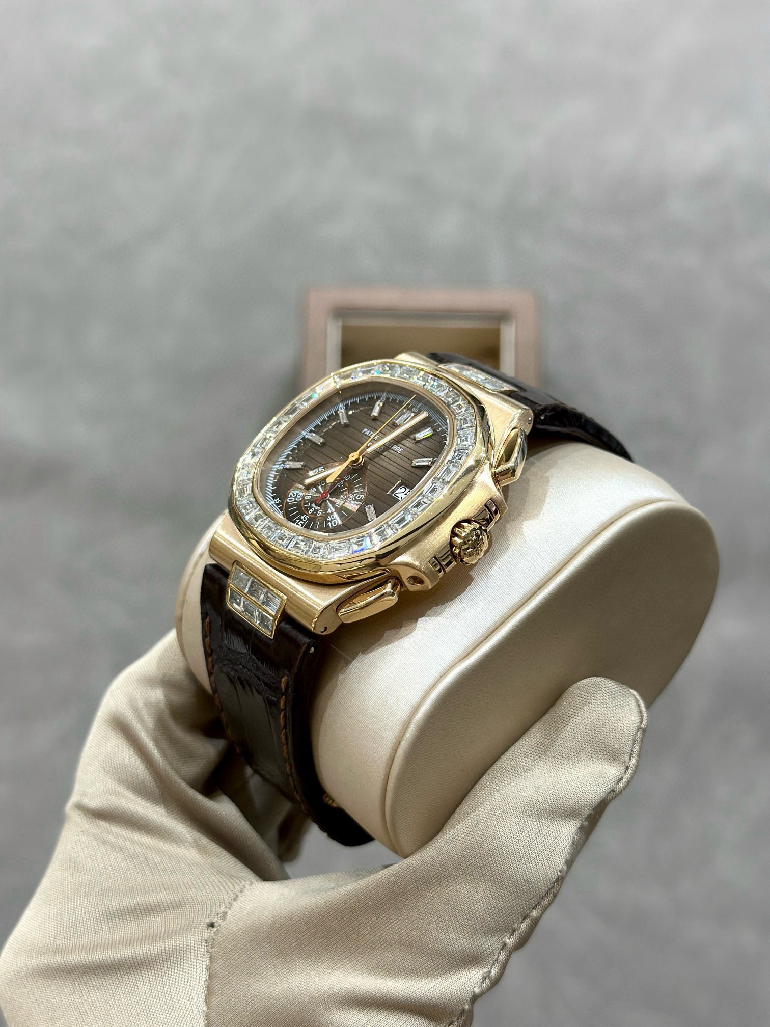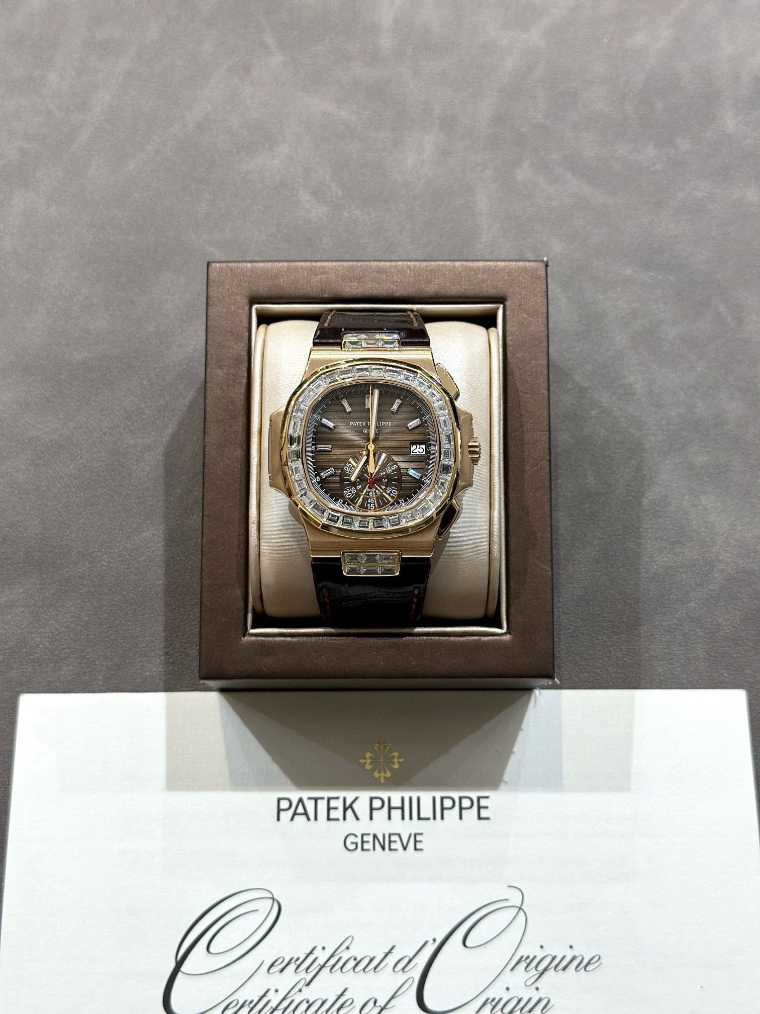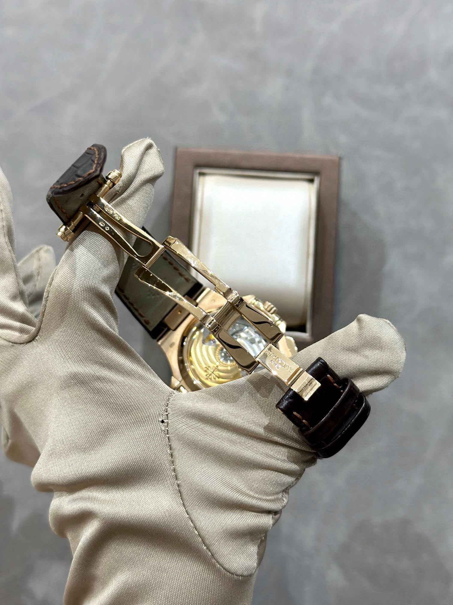 百达翡丽运动优雅系列5980R-001鹦鹉螺,表径40.5mm,自动机械,日期显示,计时功能,18k玫瑰金,后镶大T钻升级5980/10R,颜值更上一层楼,原钻4百多万,后钻现货2011年6月卡,好价在店。(附件表+保纸+皮套说明书)