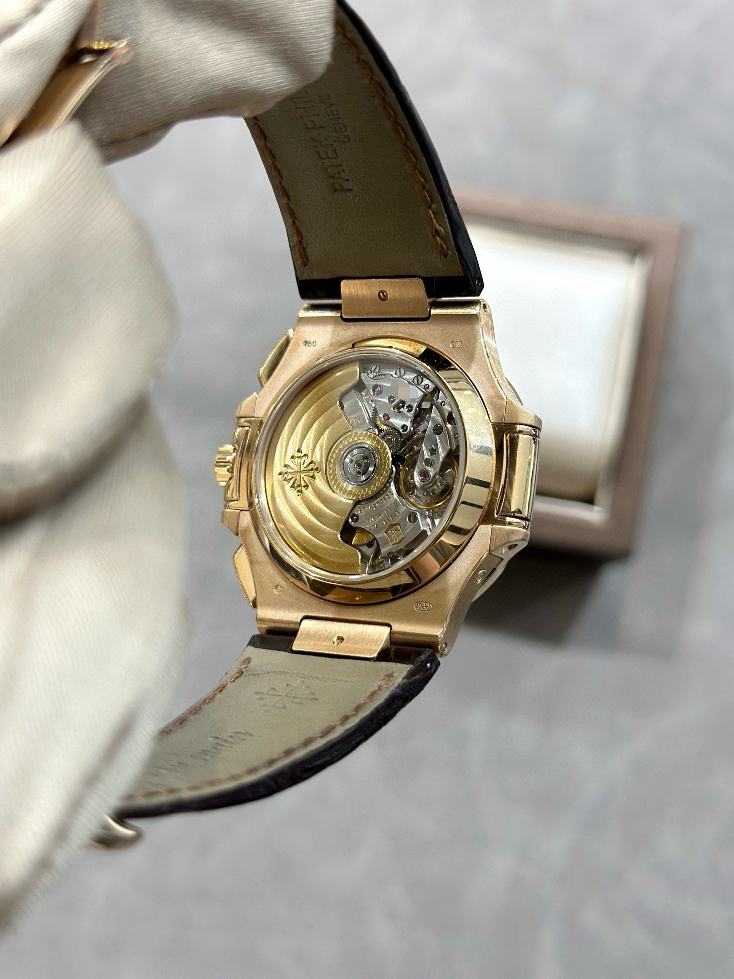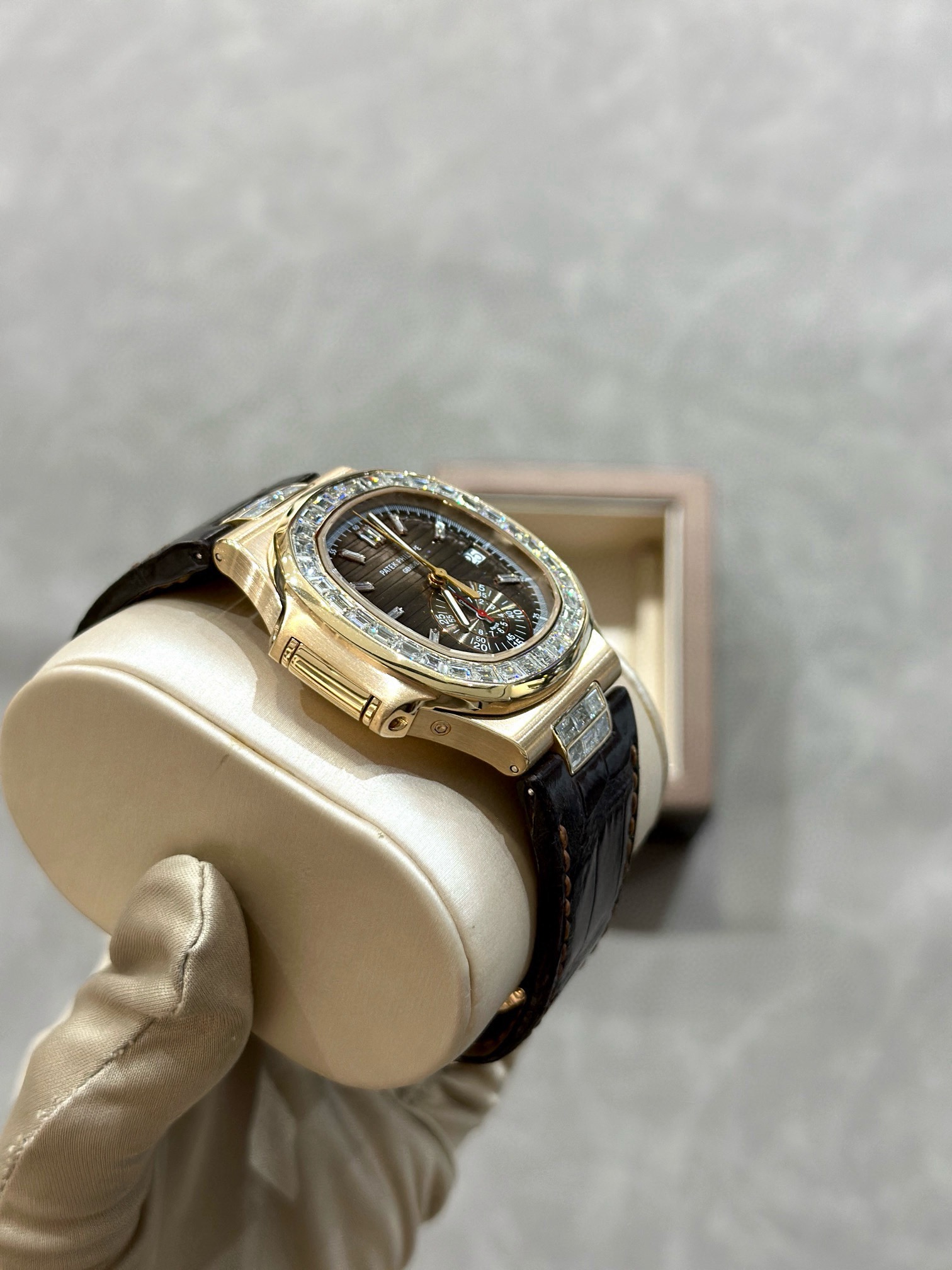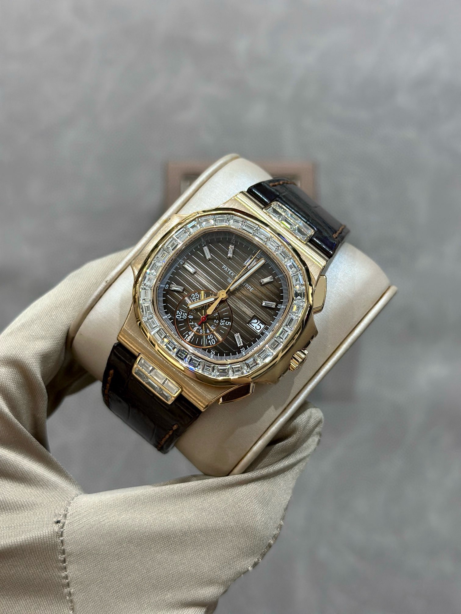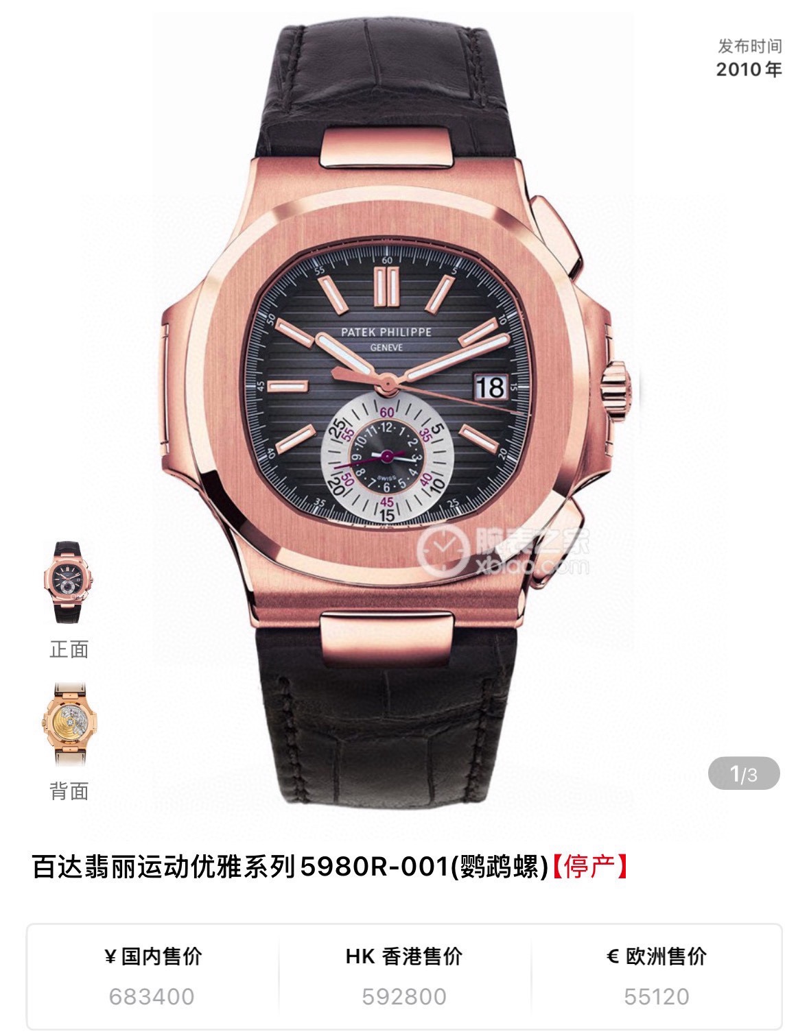 百达翡丽运动优雅系列5980R-001鹦鹉螺,表径40.5mm,自动机械,日期显示,计时功能,18k玫瑰金,后镶大T钻升级5980/10R,颜值更上一层楼,原钻4百多万,后钻现货2011年6月卡,好价在店。(附件表+保纸+皮套说明书)