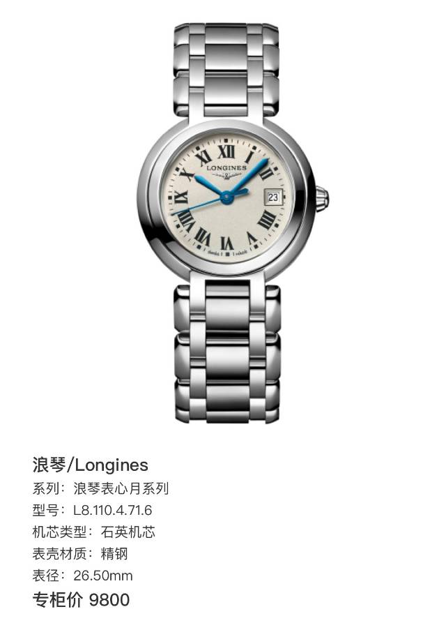 浪琴 心月系列 L8.110.4.71.6 石英机芯 精钢 26.5mm表径 24年全套 专柜价9800 现好价