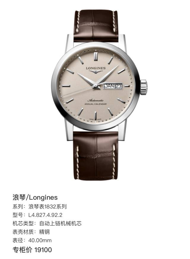 浪琴 1832系列 L4.827.4.92.2 自动上链机械机芯 精钢 40mm表径 专柜价19100 现好价
