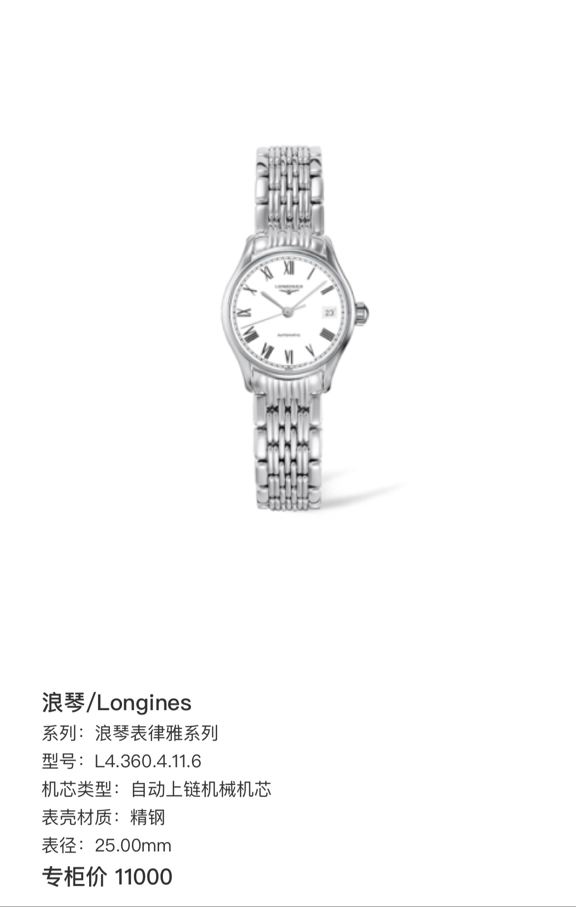 浪琴/Longines 浪琴表律雅系列 L4.360.4.11.6 自动上链机械机芯 精钢 25.00mm 专柜价11000~