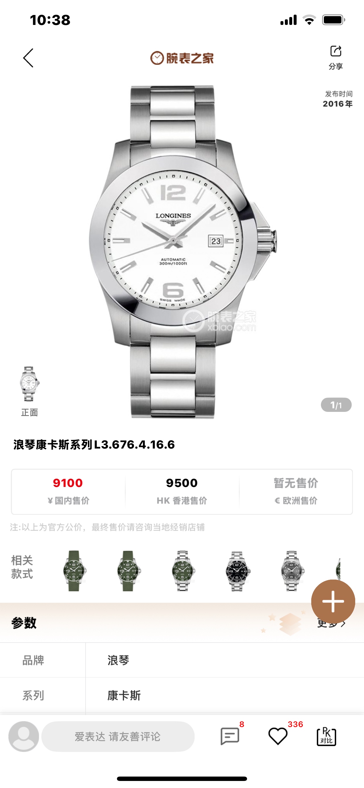 浪琴运动系列L3.676.4.16.6自动机械男士腕表,精钢材质,39mm表径,白盘夜光条刻,日期显示功能,公价9100,现好价