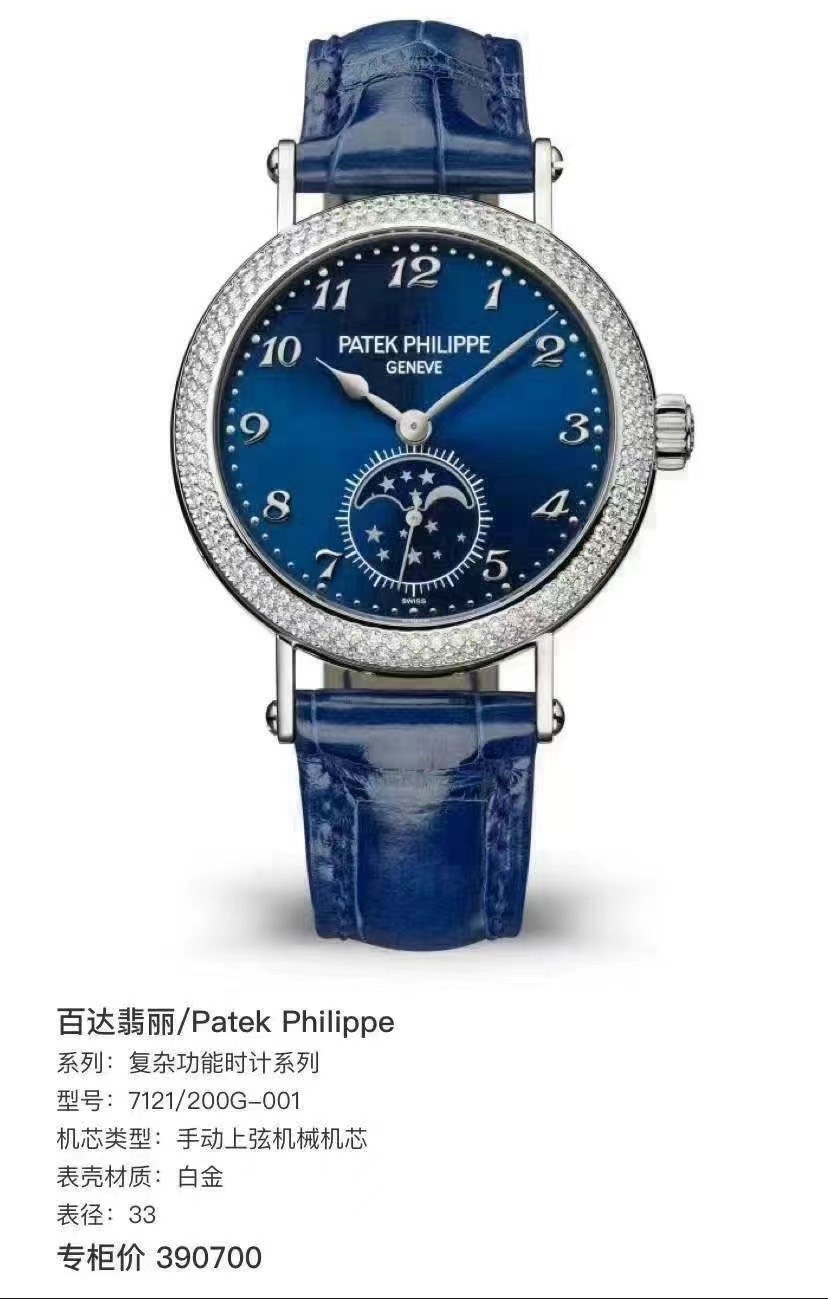 百达翡丽 复杂功能时计系列7121/200G-001 白金镶钻 手动机械 33表径 23年全套~