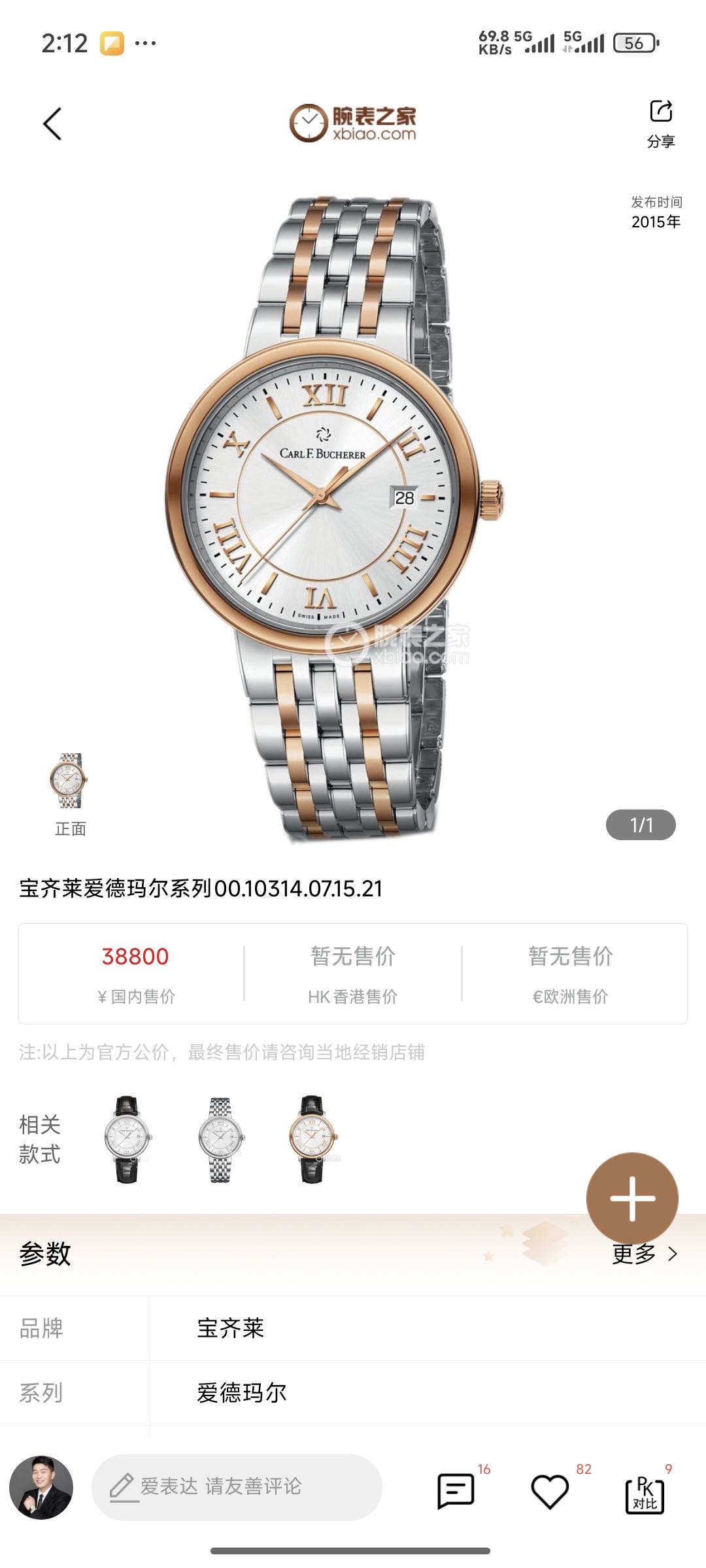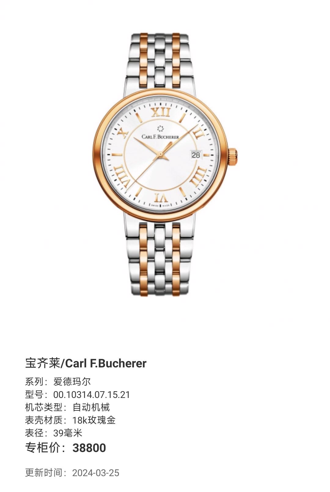 宝齐莱/Carl F.Bucherer 爱德玛尔 00.10314.07.15.21 自动机械 18k玫瑰金 39毫米 专柜价38800元 国行全新未使用品