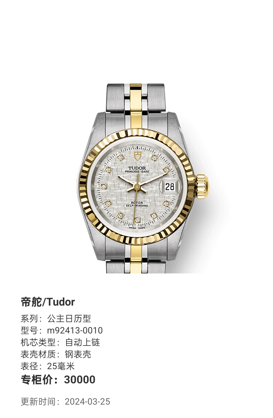 帝舵/Tudor 公主日历型 m92413-0010 自动上链 钢表壳 25毫米 专柜价30000~