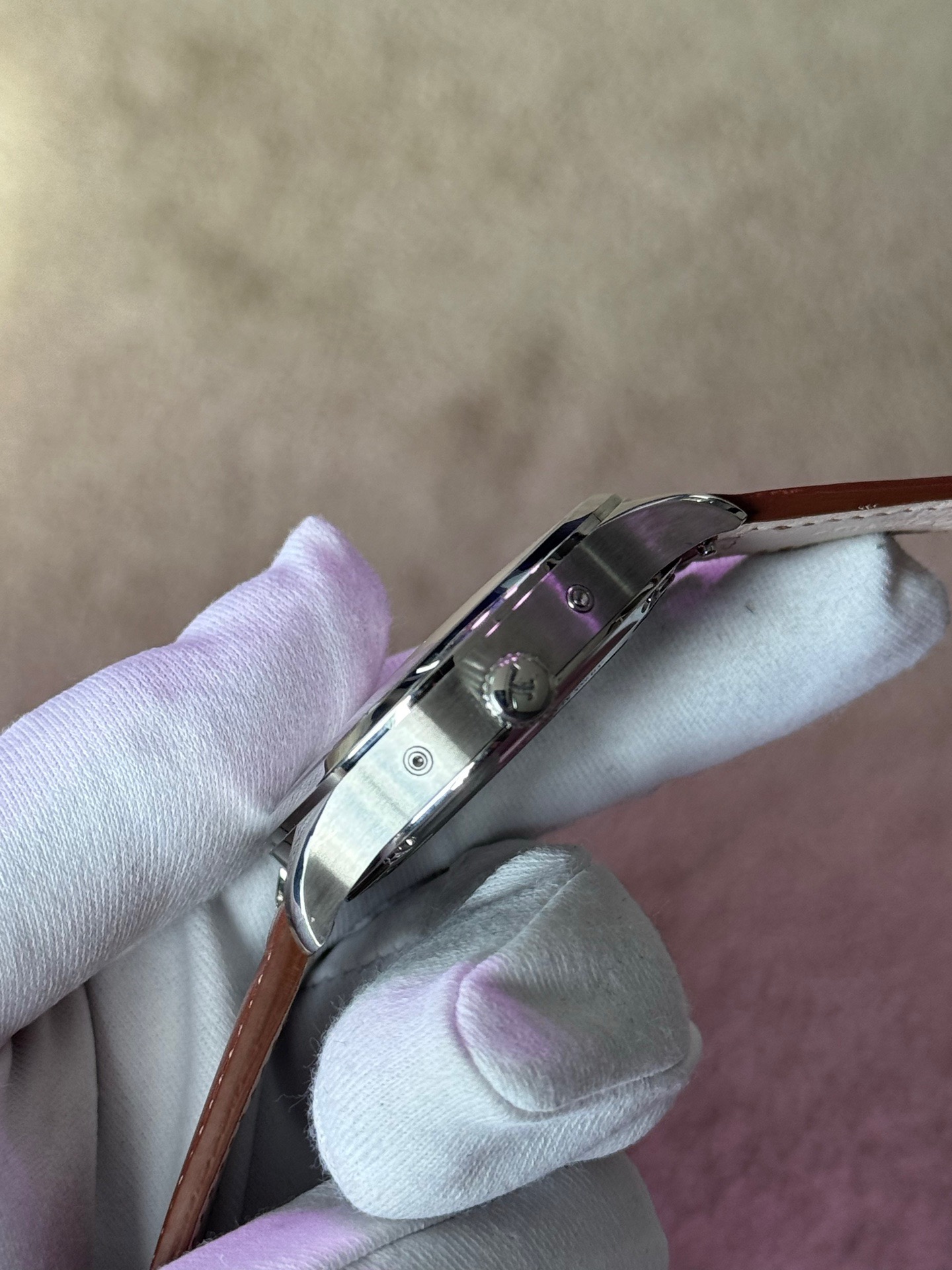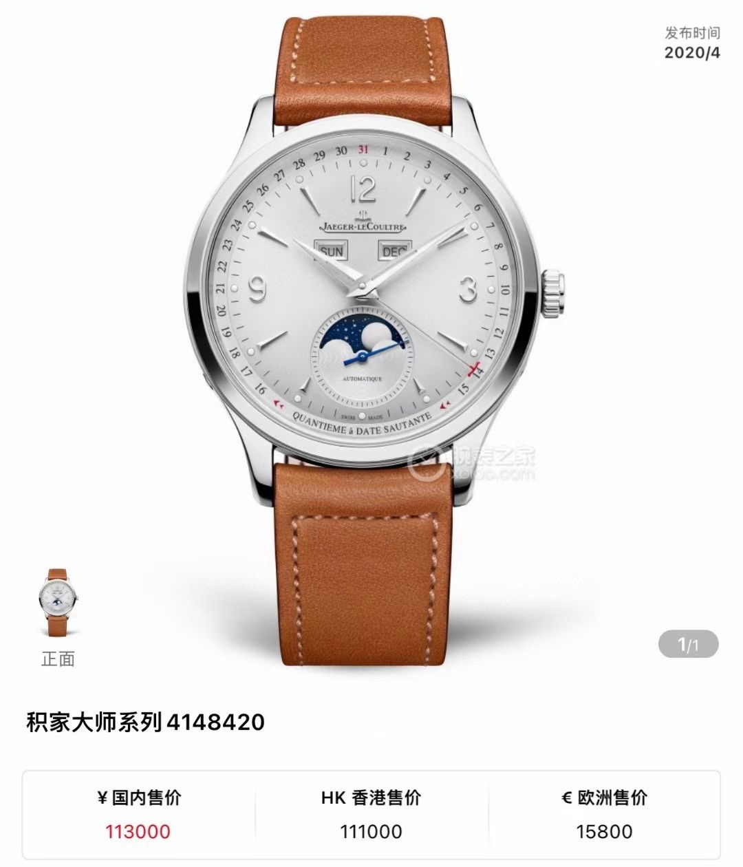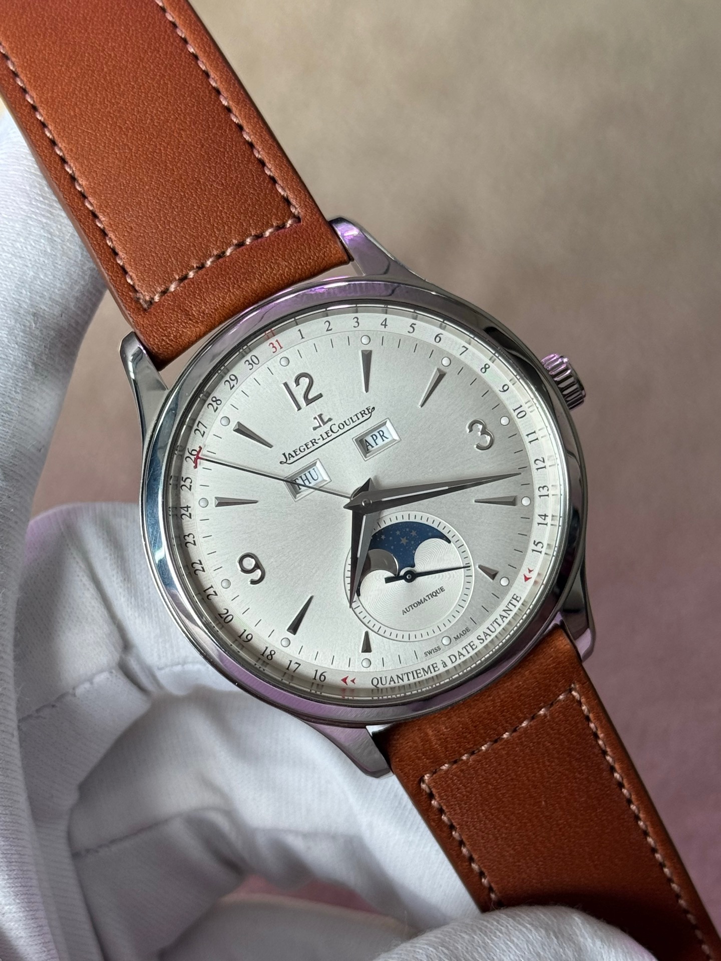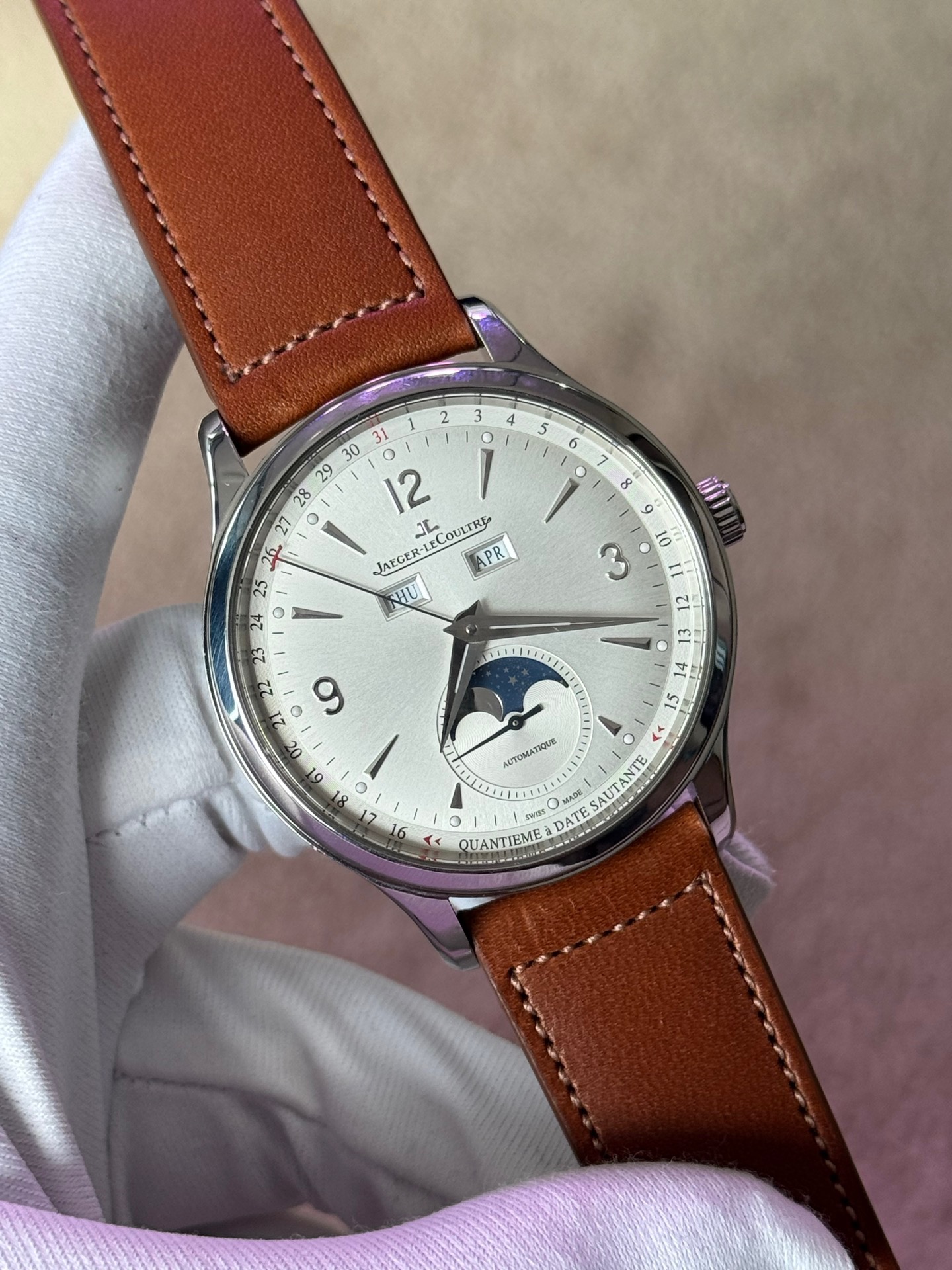 全套积家大师系列 4148420男士自动机械腕表 热门款经典大师全历月相 表径40mm 白色表盘 采用精钢材质打造 复杂功能全历显示 搭配折叠表扣 日期显示 星期显示 专柜价113000 现货好价