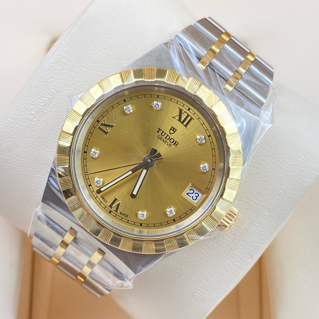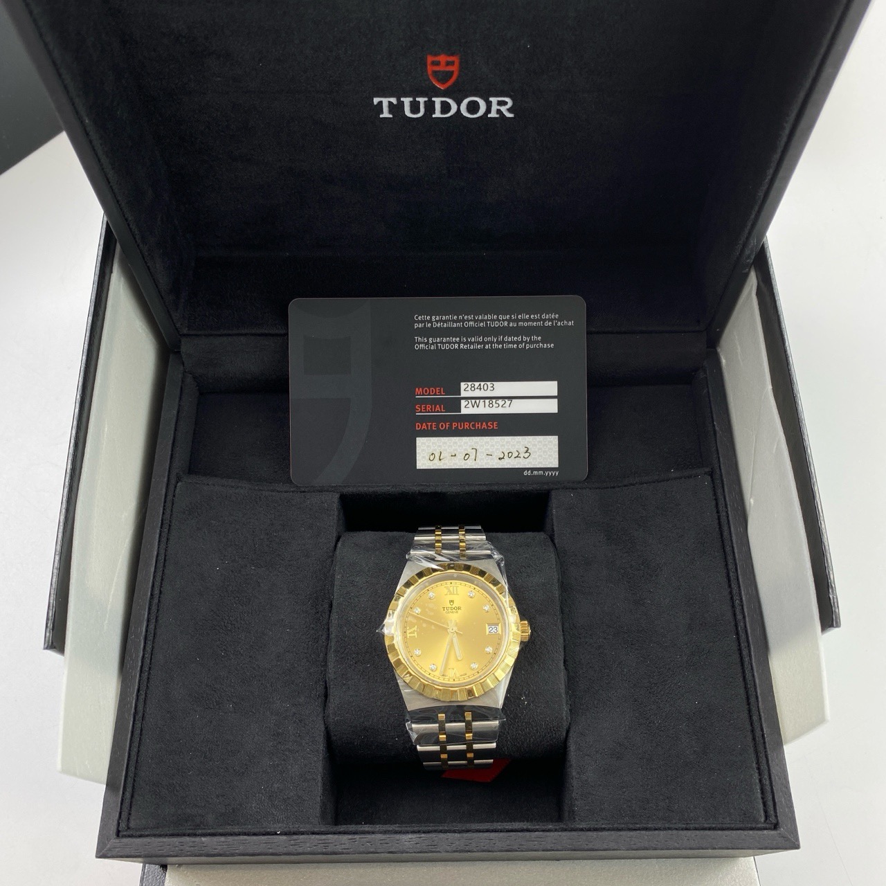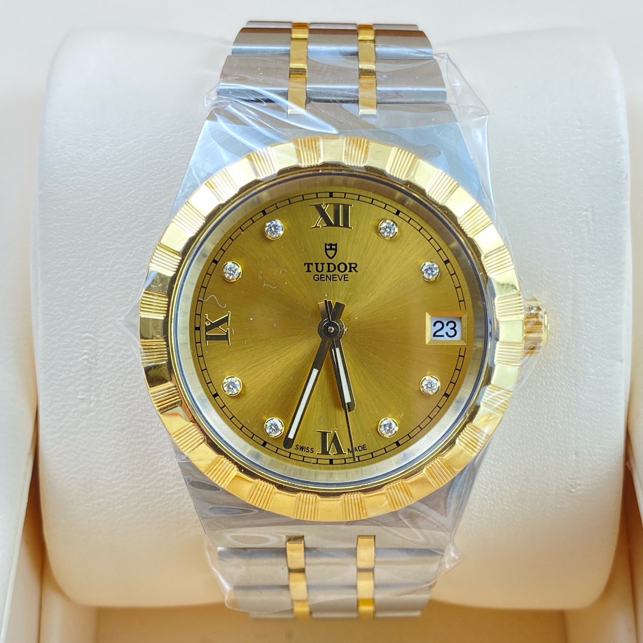 帝舵皇家系列女士自动机械腕表 28403-0006型号 34毫米表径 金色表盘 钻石刻度 日期显示 精钢间18K黄金表壳 极品成色 2023年购入 附件齐全 专柜36900