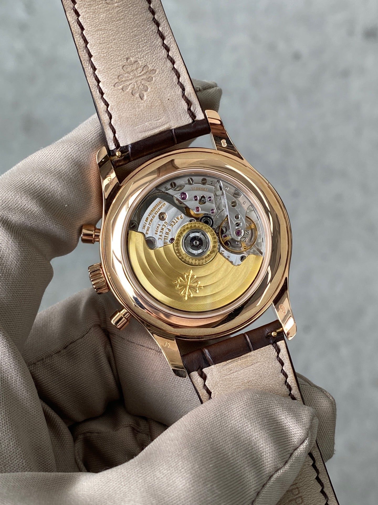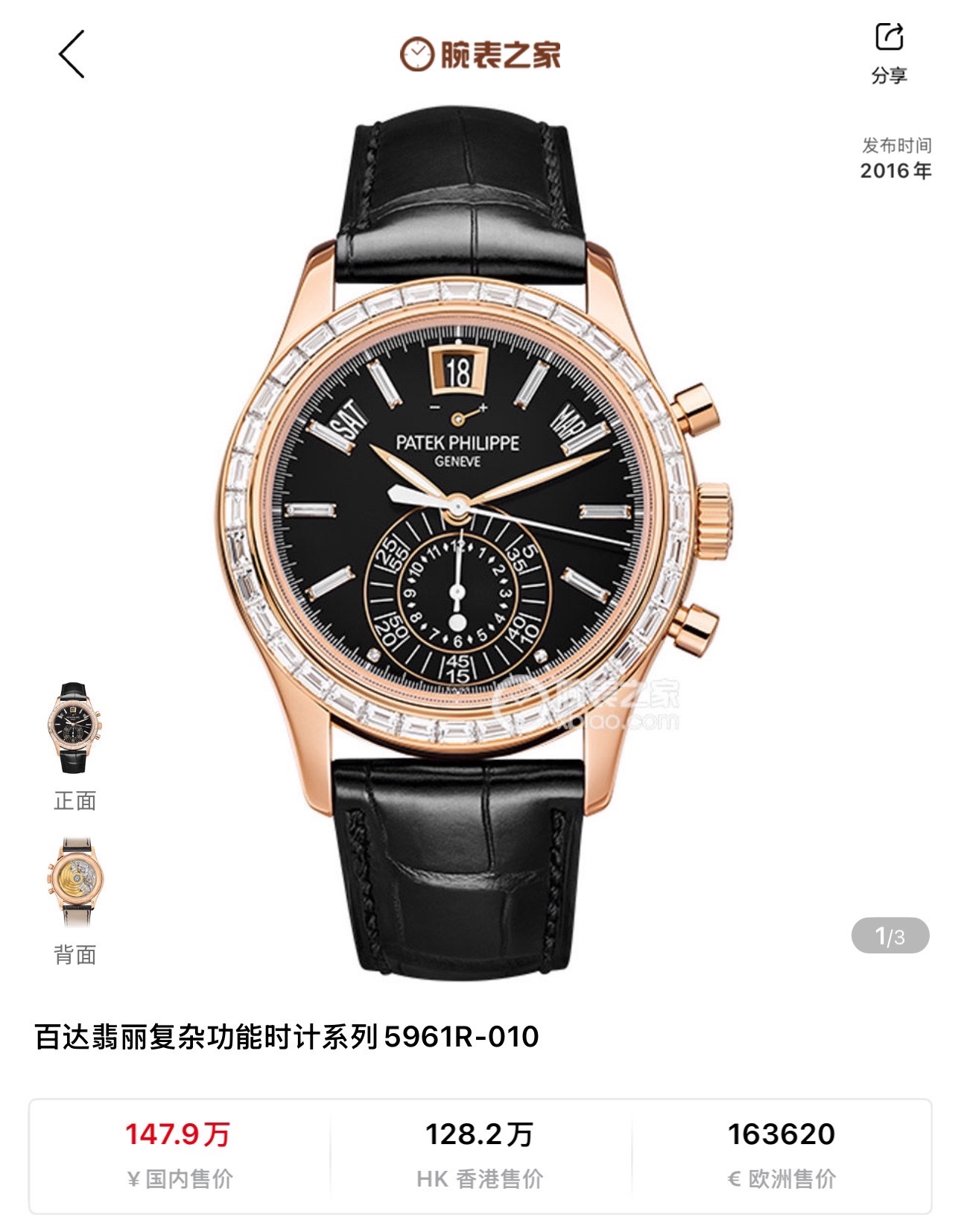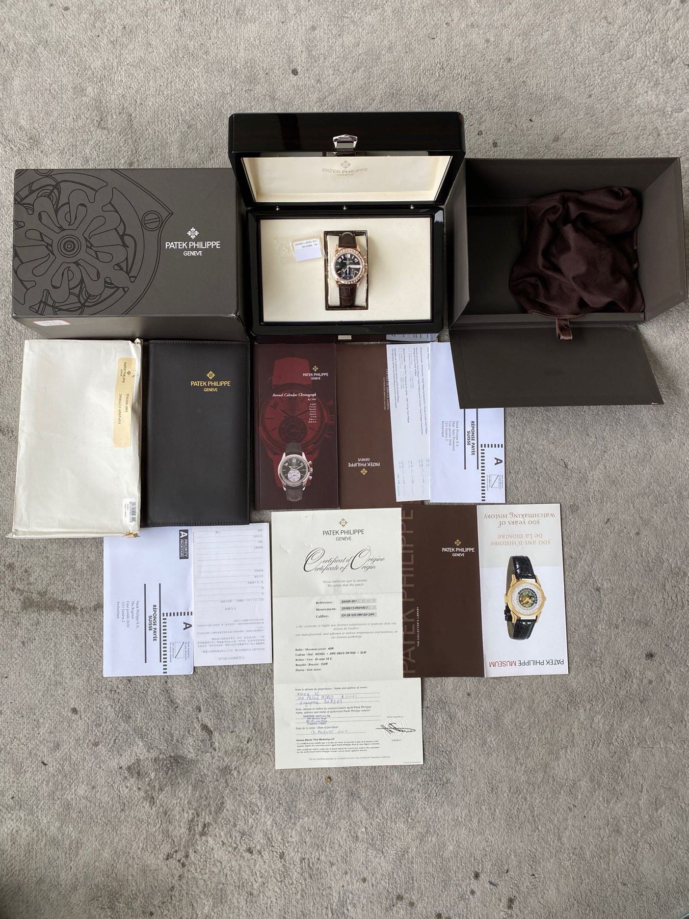 百达翡丽复杂功能时计系列5960R升级5961R,自动机械背透机芯,40.5mm表径,动力储备55小时,黑色盘面,防水深度30米,18K玫瑰金材质,功能:日期显示/星期显示/月份显示/年历显示/计时/动力储备显示,参考专柜价1479000元,现货10年8月全套现货秒发