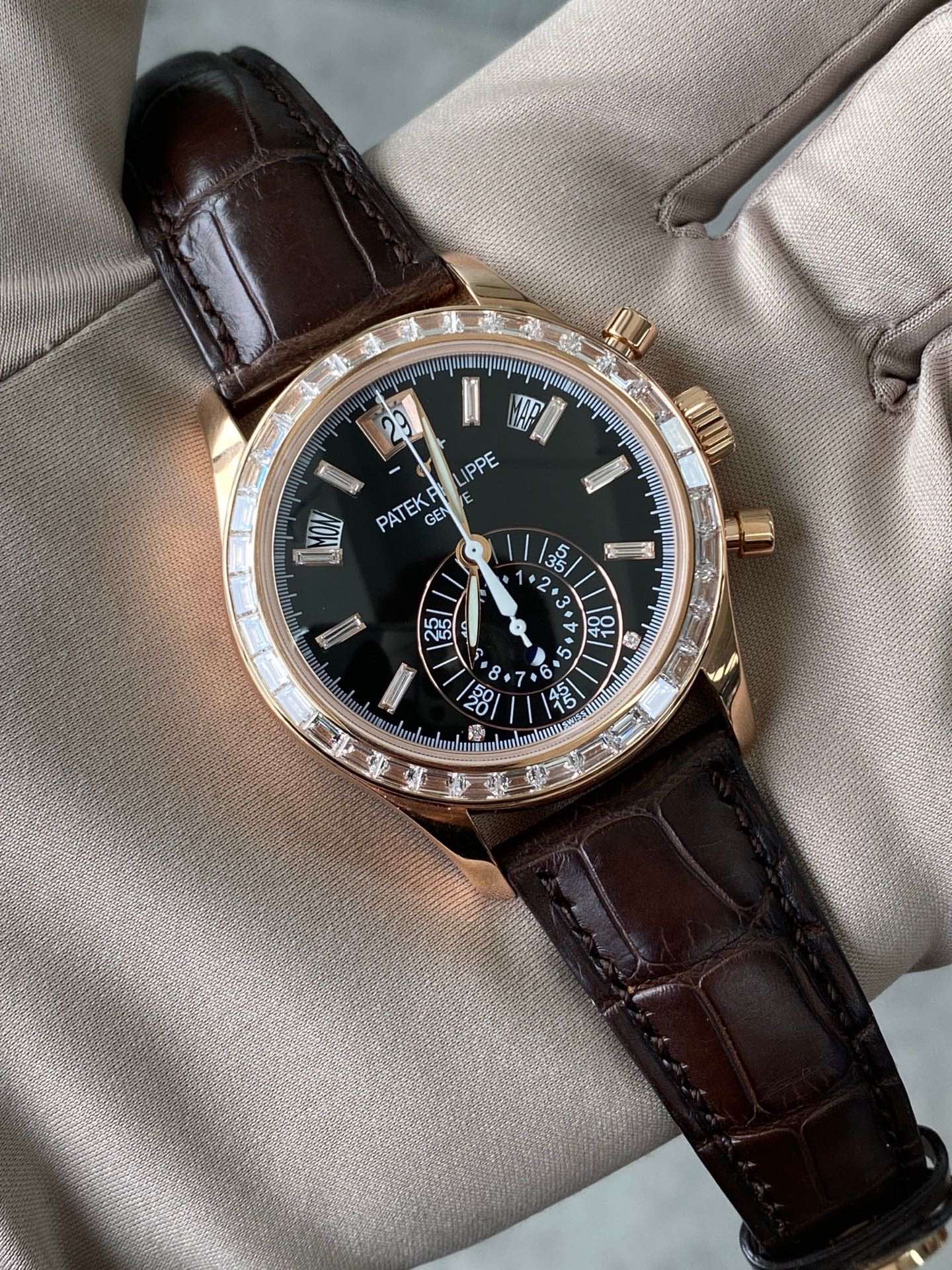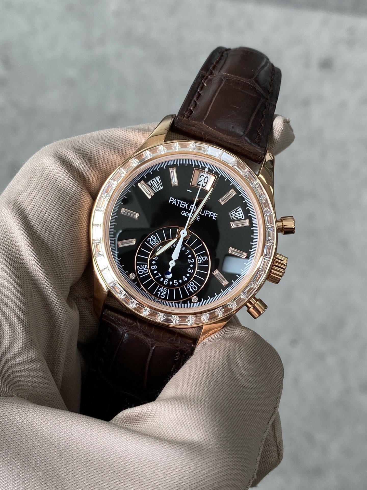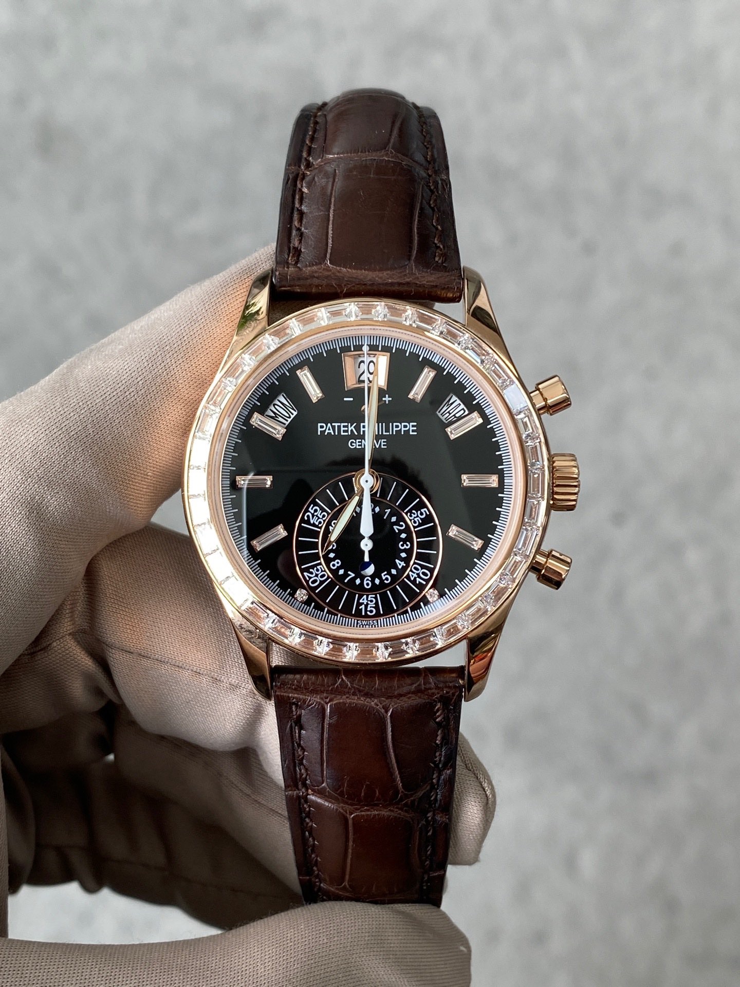 百达翡丽复杂功能时计系列5960R升级5961R,自动机械背透机芯,40.5mm表径,动力储备55小时,黑色盘面,防水深度30米,18K玫瑰金材质,功能:日期显示/星期显示/月份显示/年历显示/计时/动力储备显示,参考专柜价1479000元,现货10年8月全套现货秒发