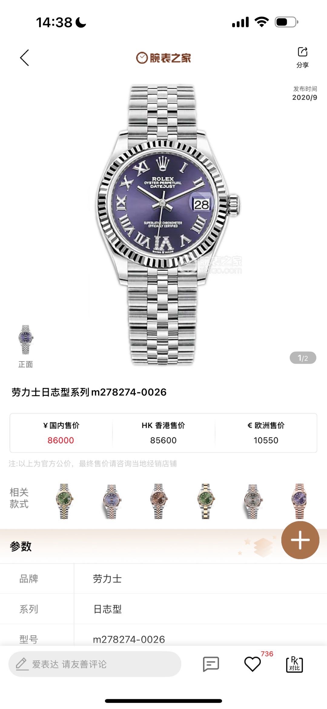 劳力士278274-0026紫罗马盘日志型,葡萄紫6点钻石刻度,31mm最大号表径