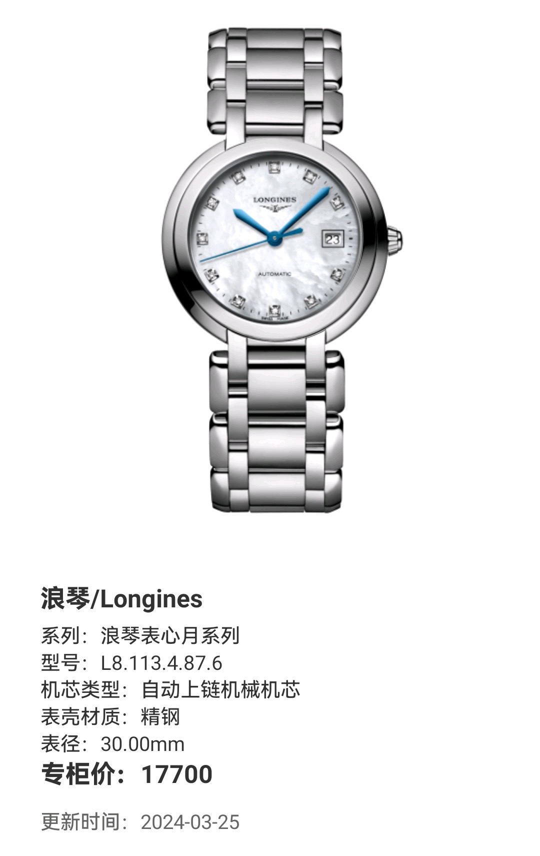 浪琴/Longines 浪琴表心月系列 L8.113.4.87.6 自动上链机械机芯 精钢 钻石刻度 贝母表盘 30mm 专柜价17700