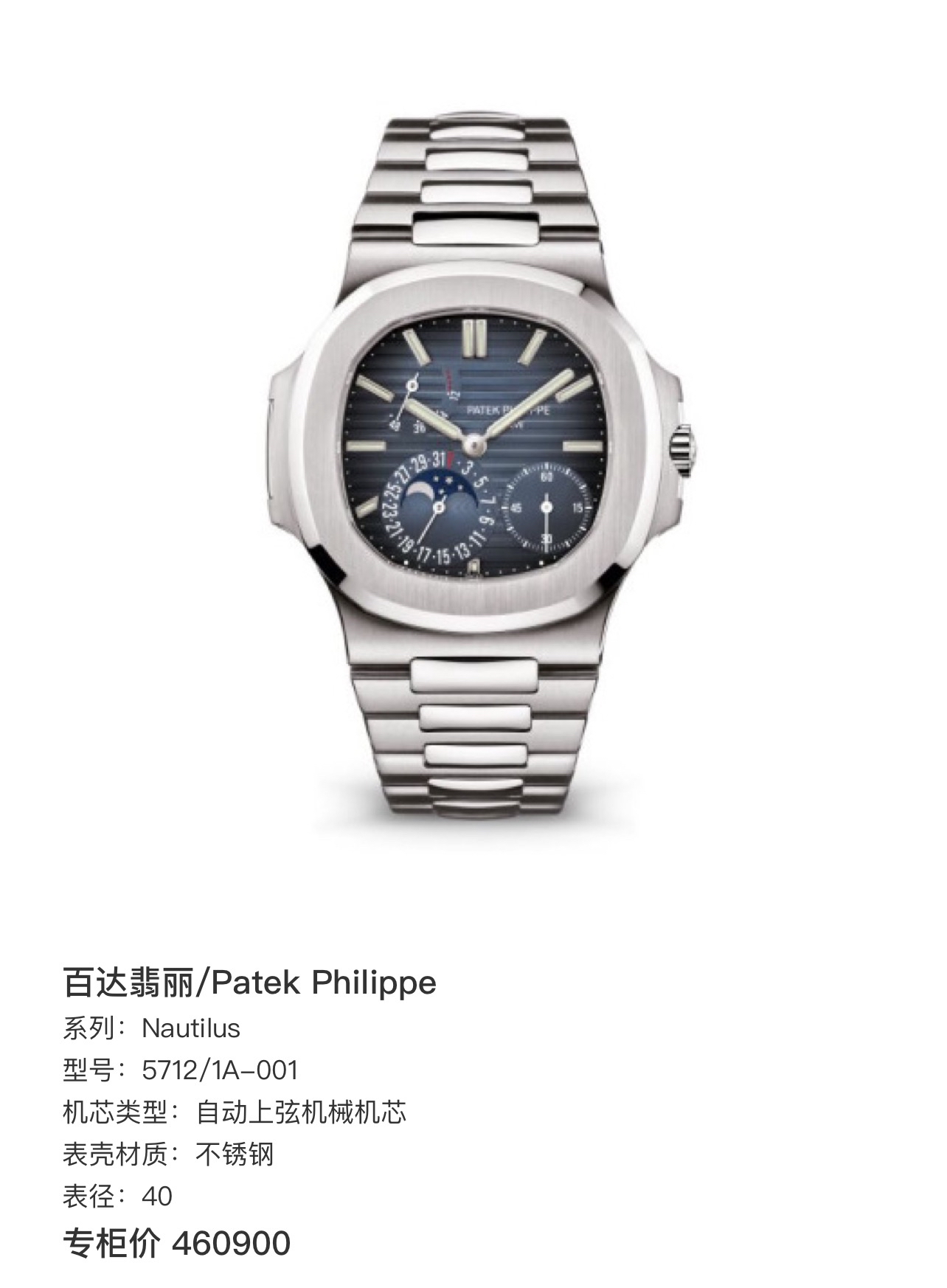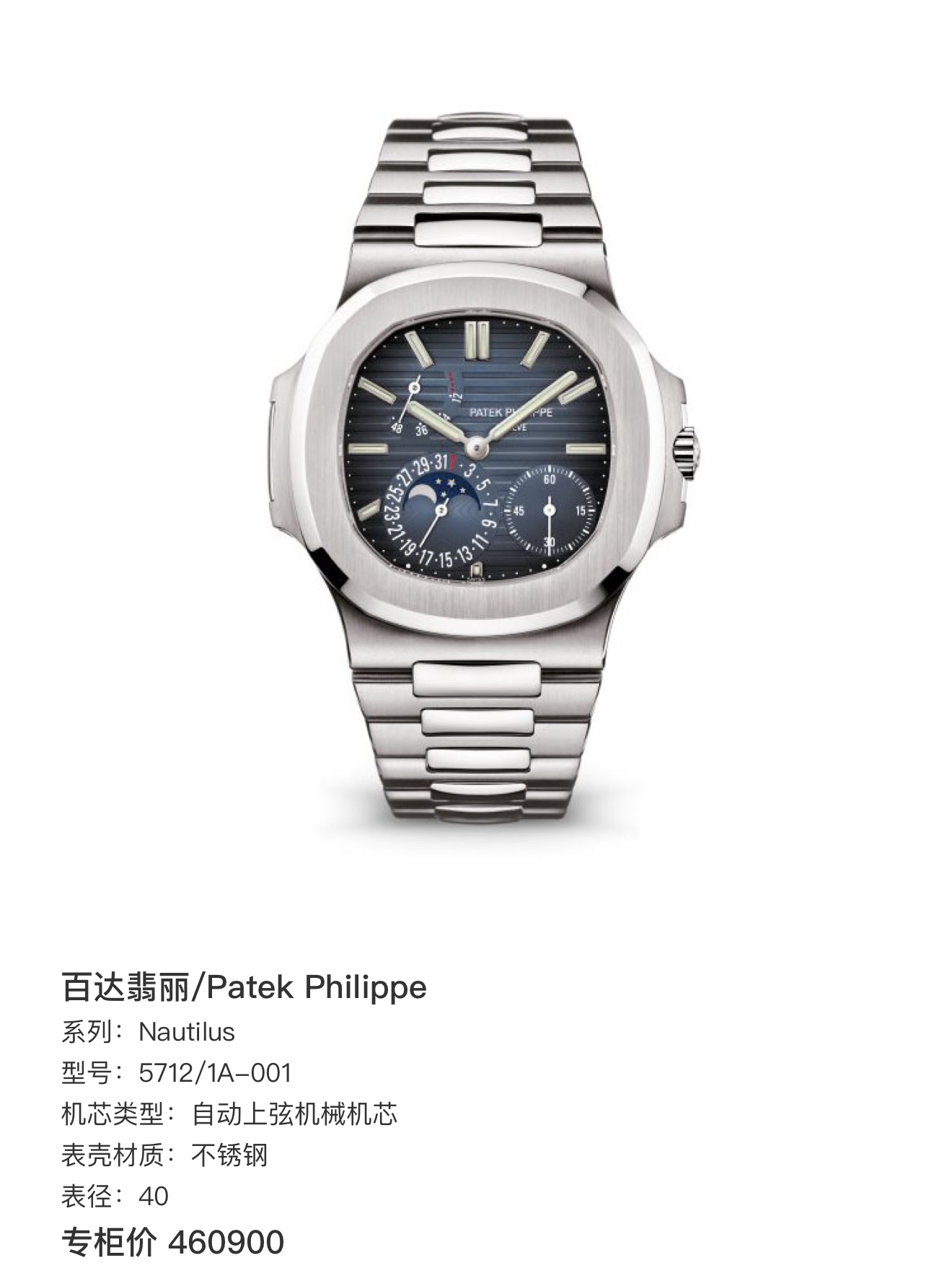 百达翡丽/Patek Philippe Nautilus 5712/1A-001 自动上弦机械机芯 不锈钢 40 专柜价460900 22年极品全套~