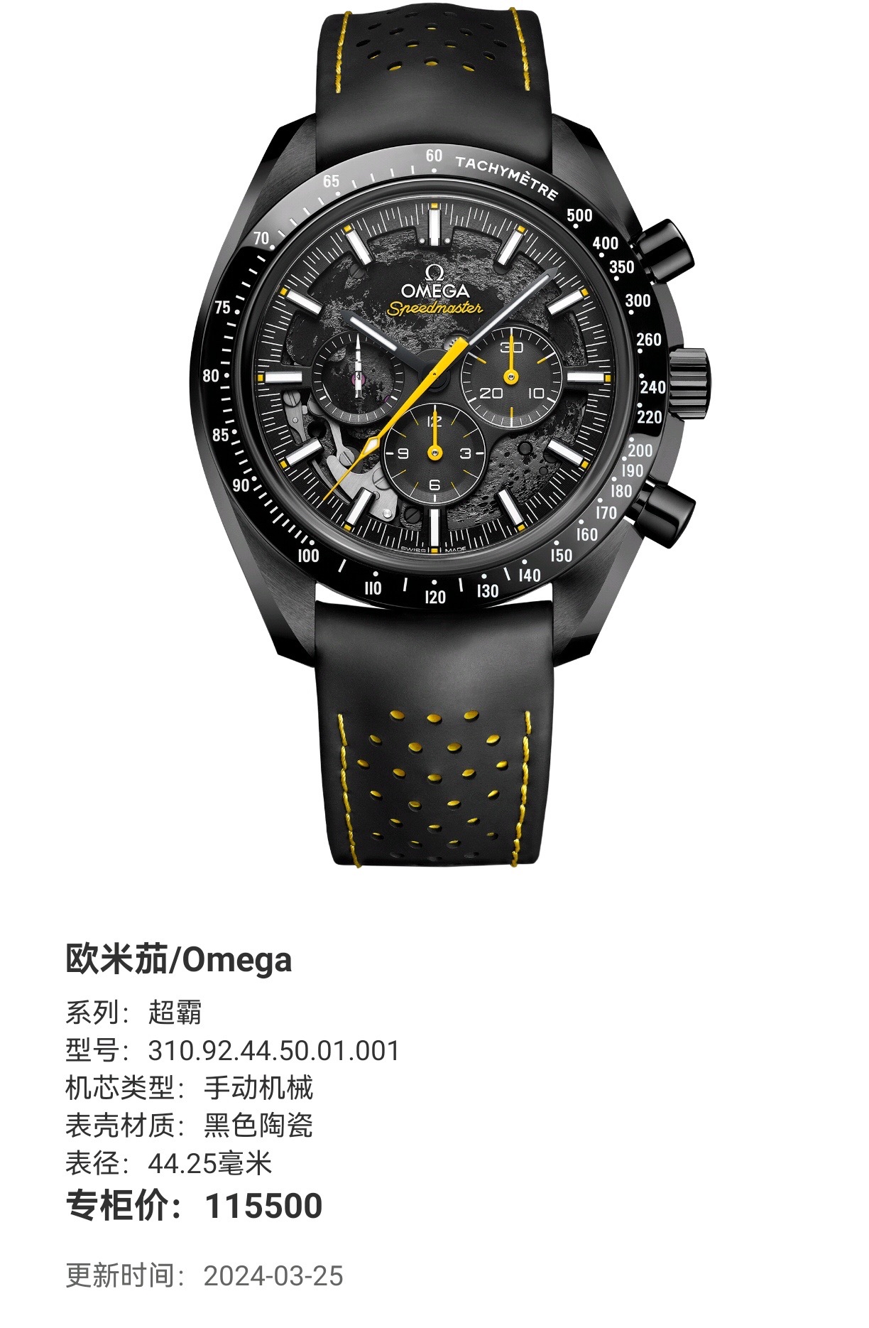 24年全套 欧米茄/Omega 超霸系列 310.92.44.50.01.001 手动机械 黑色陶瓷材质 表径44.25毫米 背透设计 专柜价115500 现货好价~