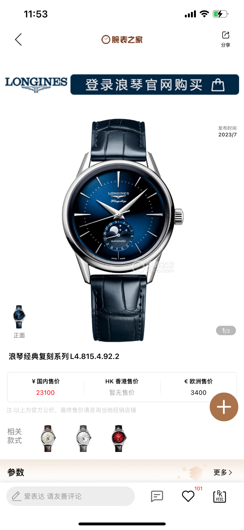 浪琴/Longines 军旗系列蓝盘 38.50 MM 不锈钢 自动机械机芯 男表 L4.815.4.92.2