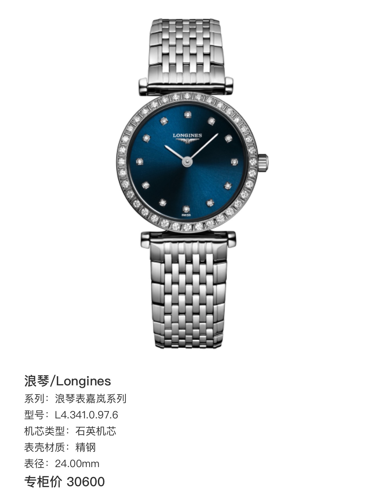 浪琴 嘉岚系列 L4.341.0.97.6 石英机芯 精钢 24mm表径 专柜价30600 单表好价