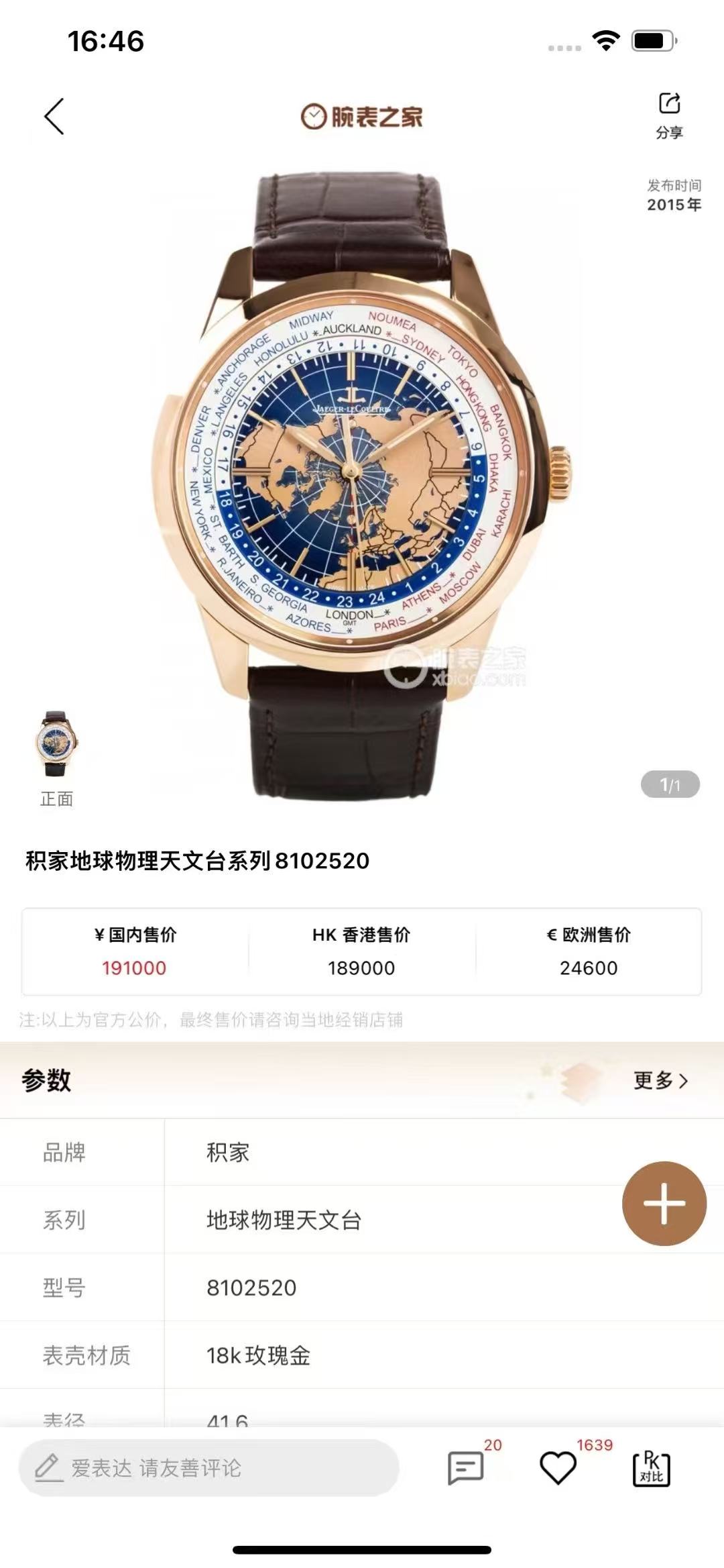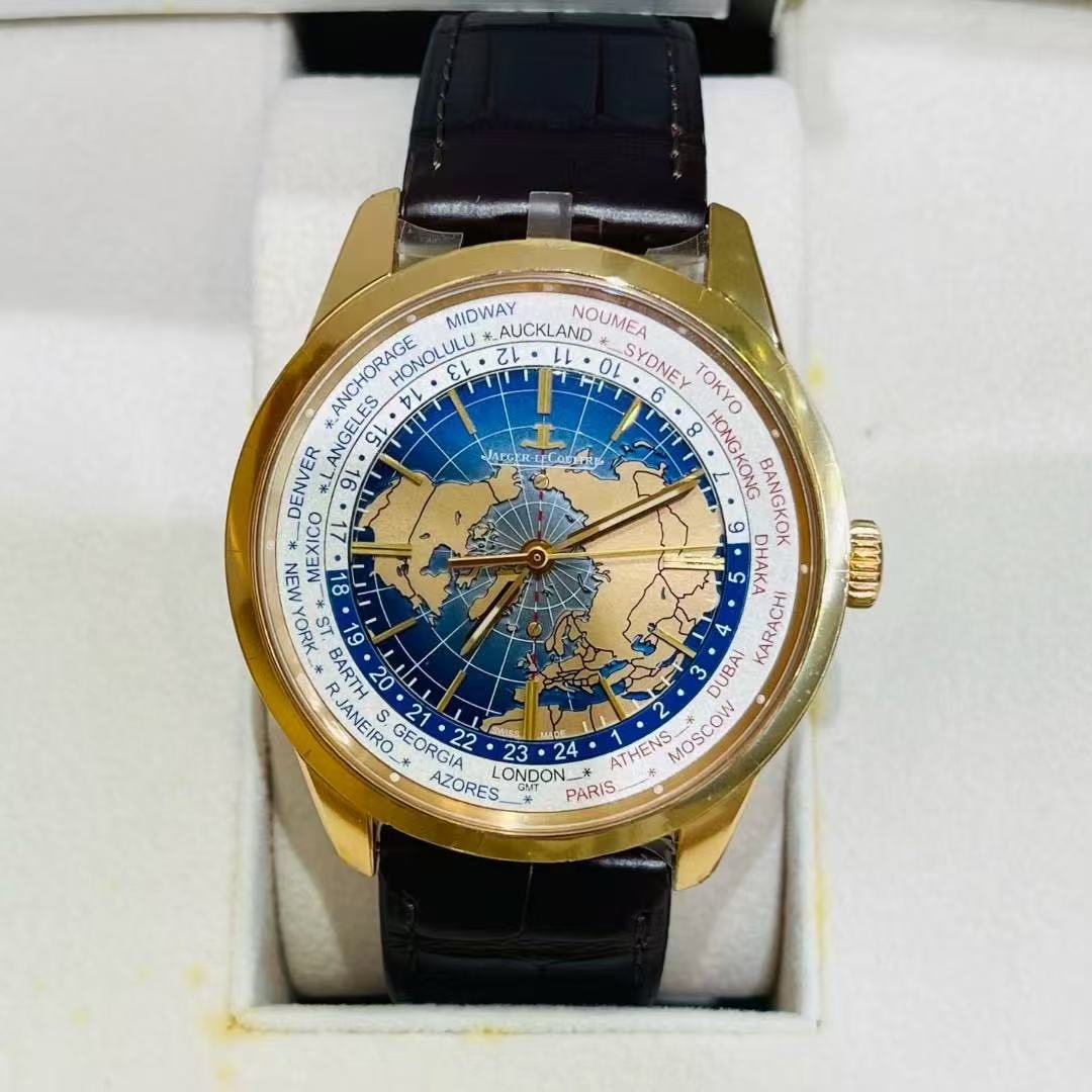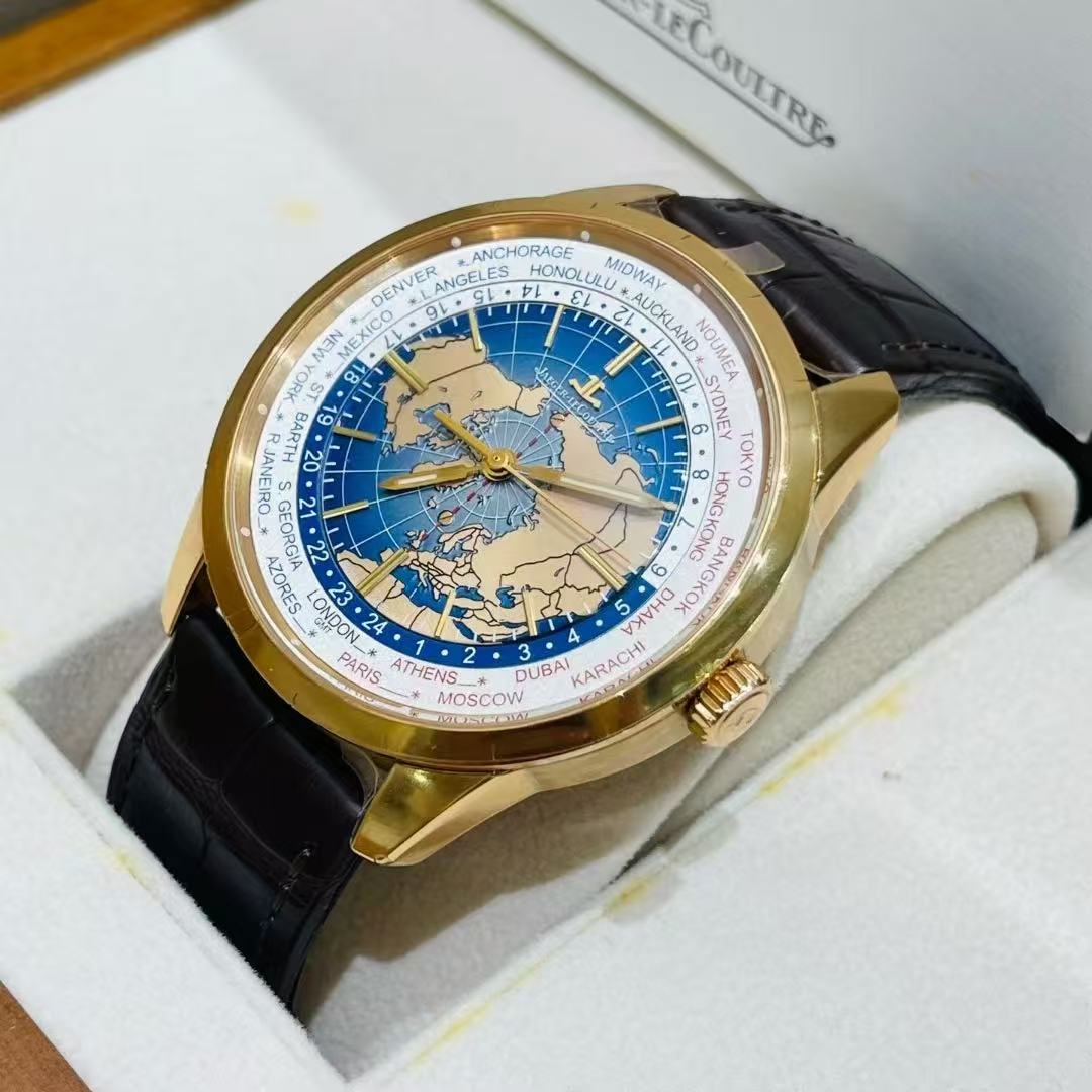 积家地球物理天文台系列Q8102520,自动机械42mm表径,世界图表盘 世界时,18k玫瑰金材质,新款18K金自动陀,全新库存品表带膜 16年全套,公价191000,有店内现货