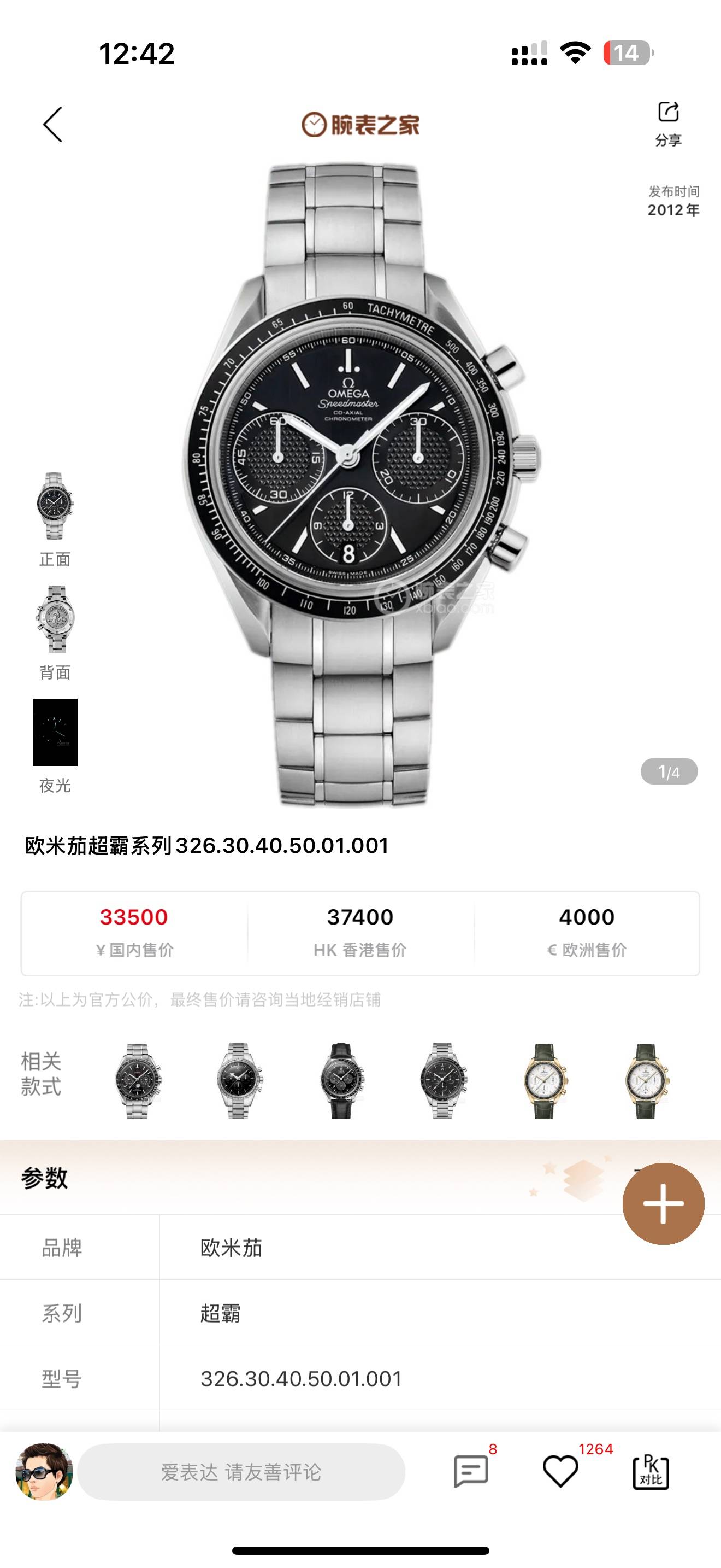 欧米茄/Omega 超霸 326.30.40.50.01.001 自动机械 精钢 40毫米 欧米茄 超霸 赛车系列 小黑迪 通拿经典黑盘热门款,欧米茄超霸系列326.30.40.50.01.001男士自动机械腕表、40mm表径,精钢材质,日期显示,计时,夜光,搭载同轴3330机芯,瑞士天文台认证,防水100m