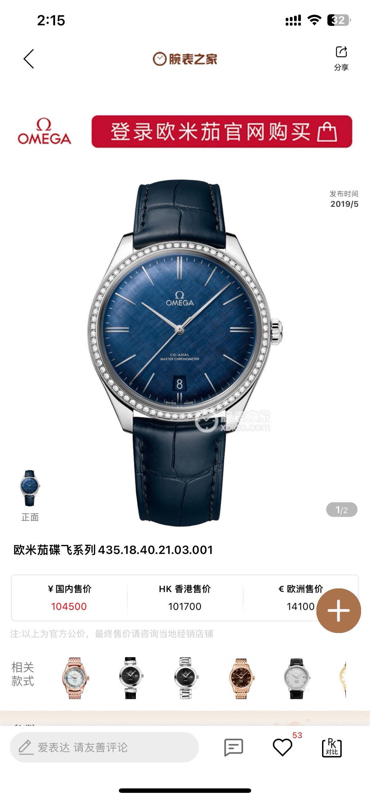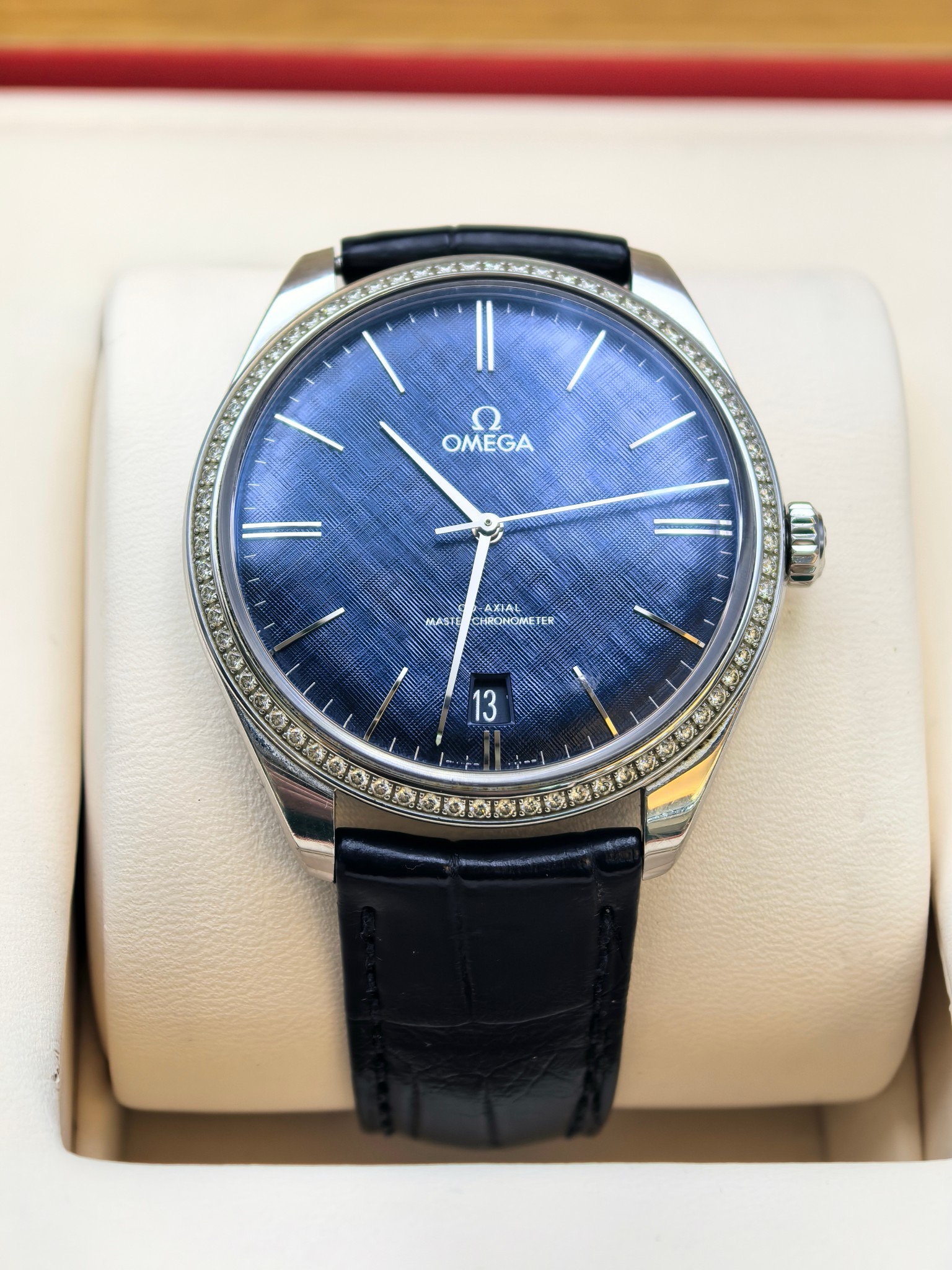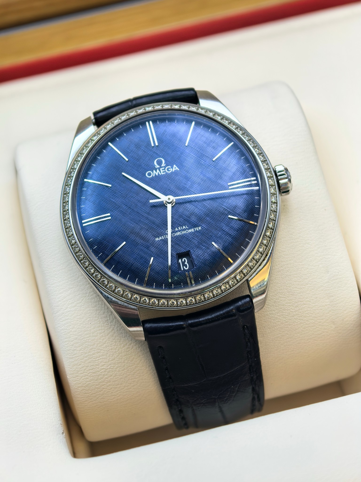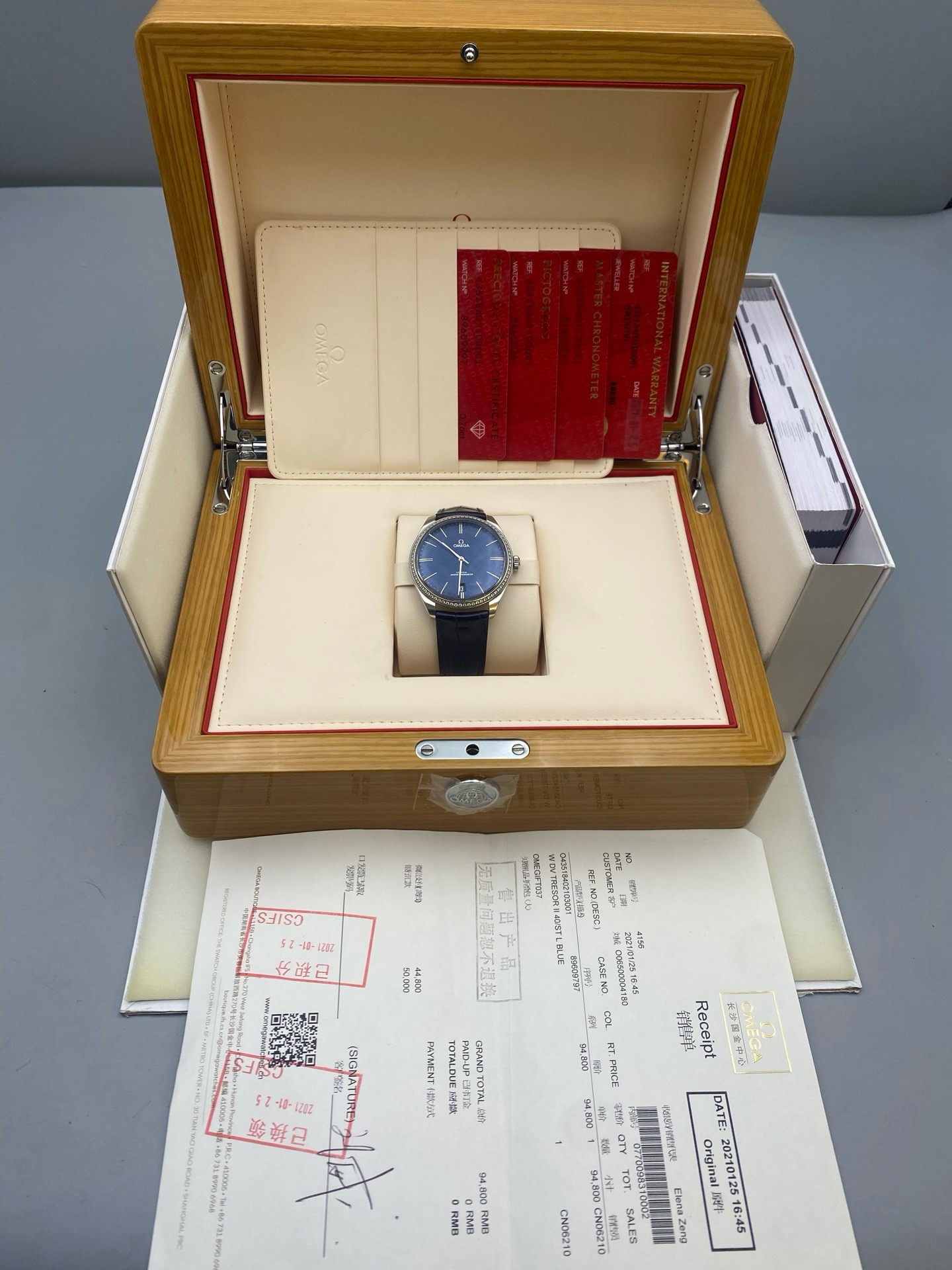 欧米茄碟飞系列 435.18.40.21.03.001 自动机械男士腕表,表径:40mm,蓝色布纹面表盘搭配经典大三针,条钉刻度时标,外圈原镶钻,21年国行全套带发票,公价:104500元,店内现货好价
