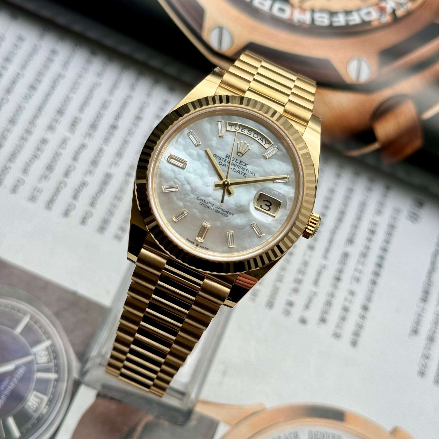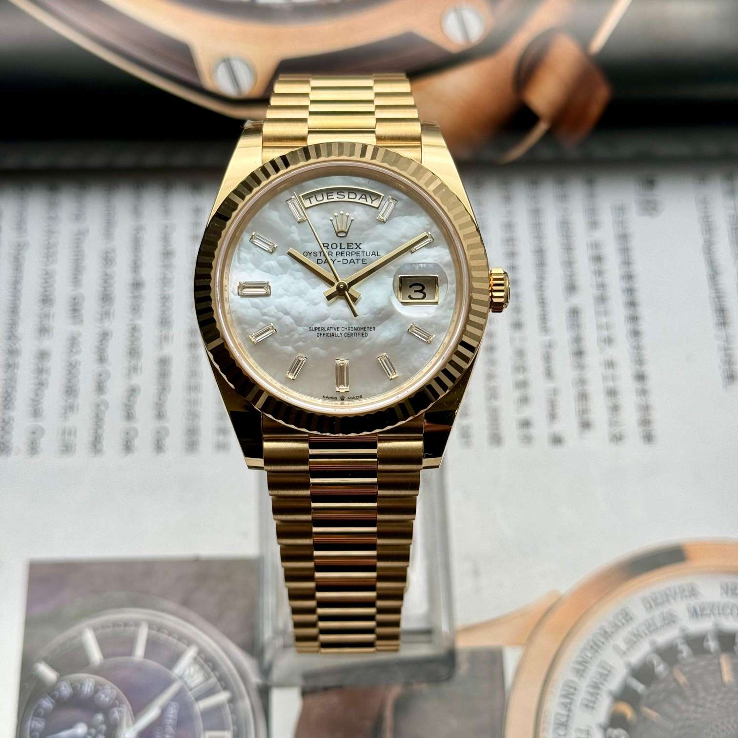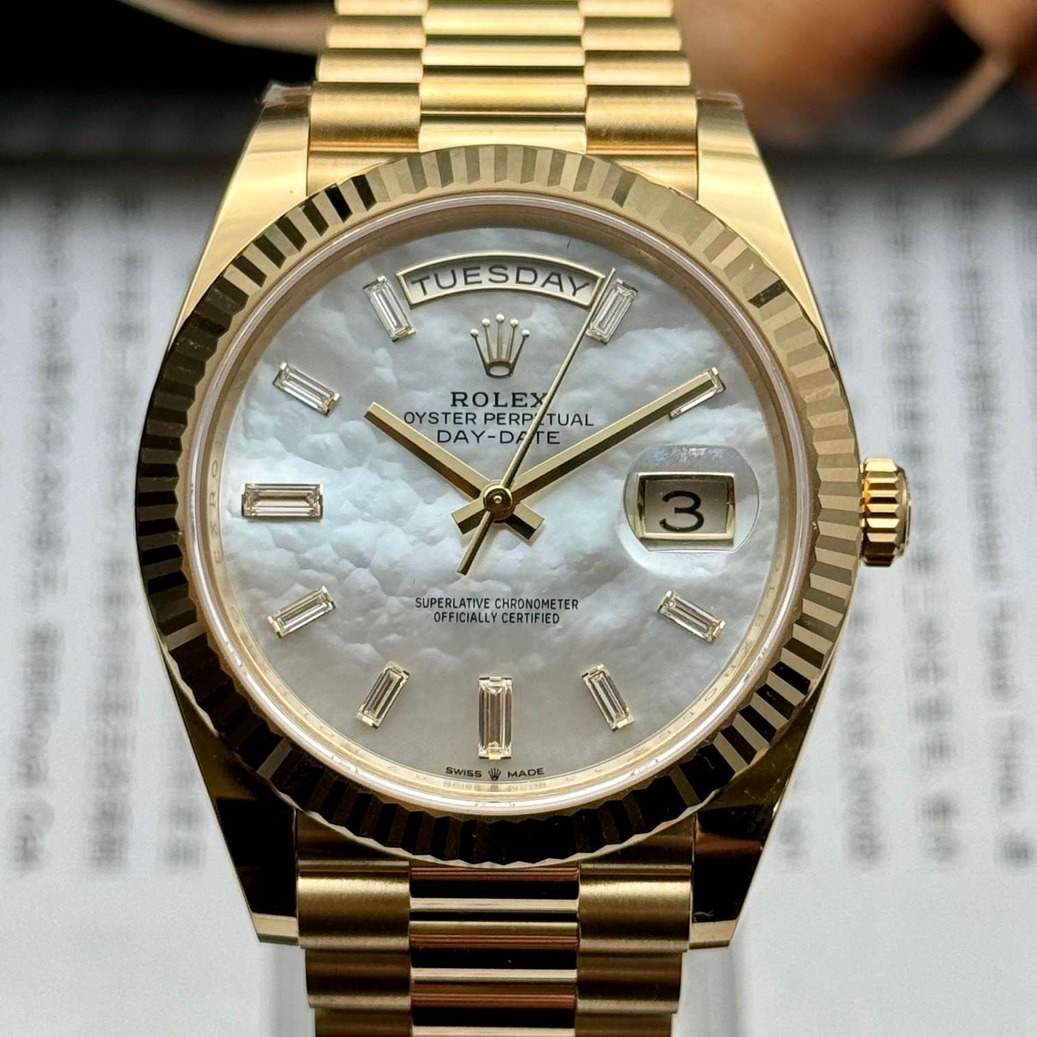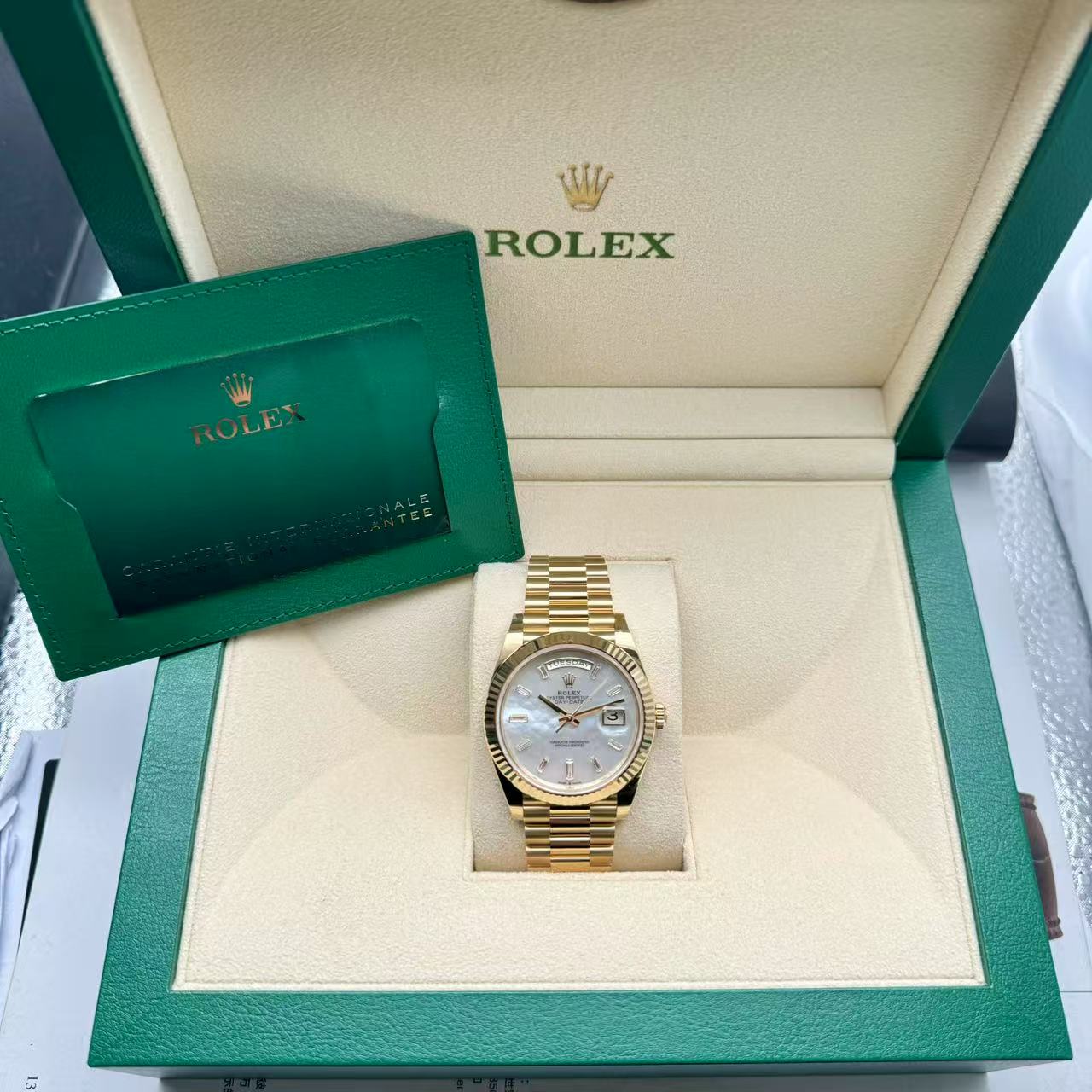 品牌:劳力士 系列:星期日历系列 型号:228238-0071 25年1月购入闲置未使用品,轻微存放运输痕迹。新款“贝母冰糖” 材质:18k黄金 镜面:蓝宝石玻璃 表盖:密底 表扣:折叠扣 表径:40mm 机芯类型:自动机械机芯 附件:25年盒证 公价:404300~