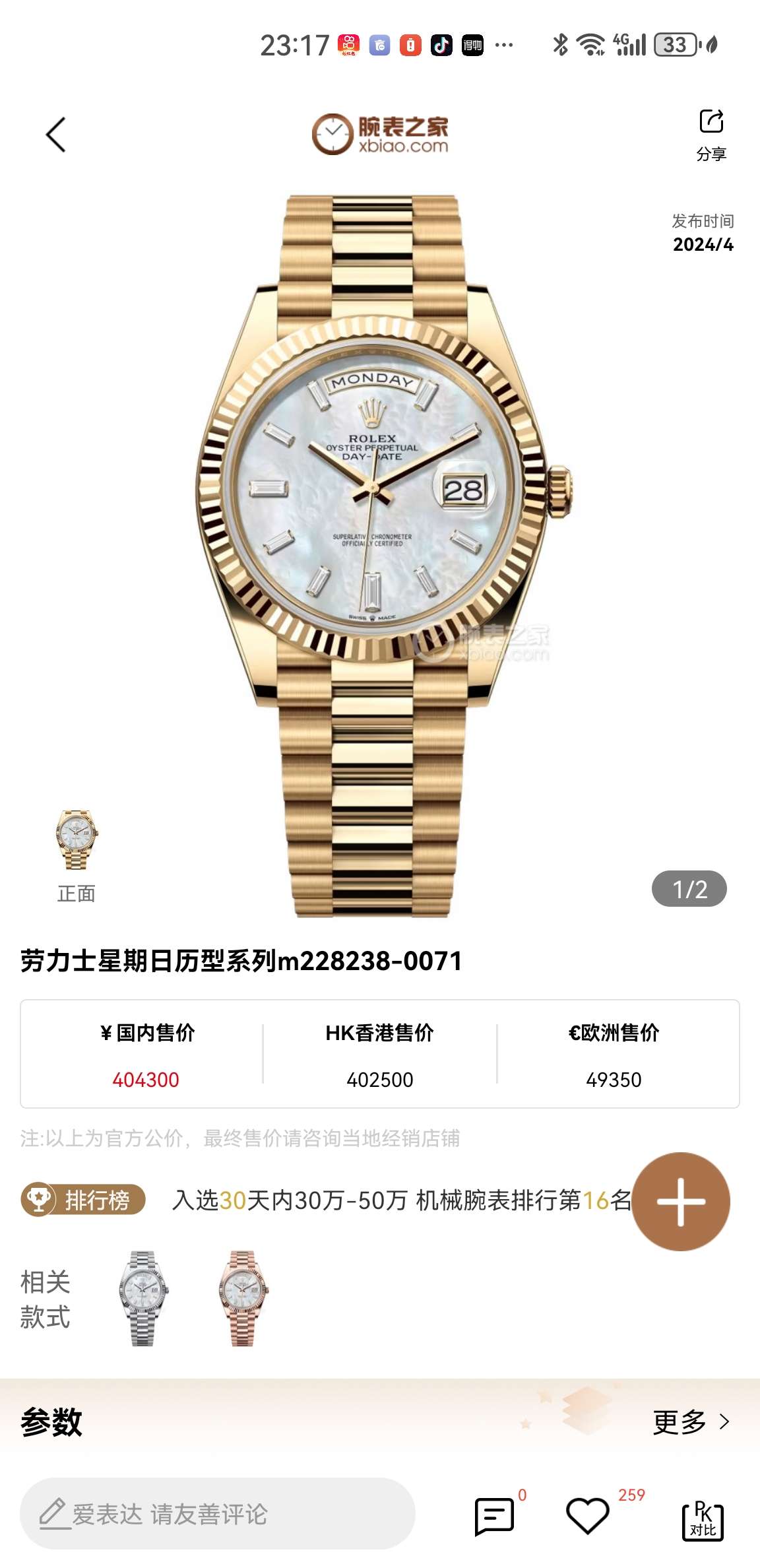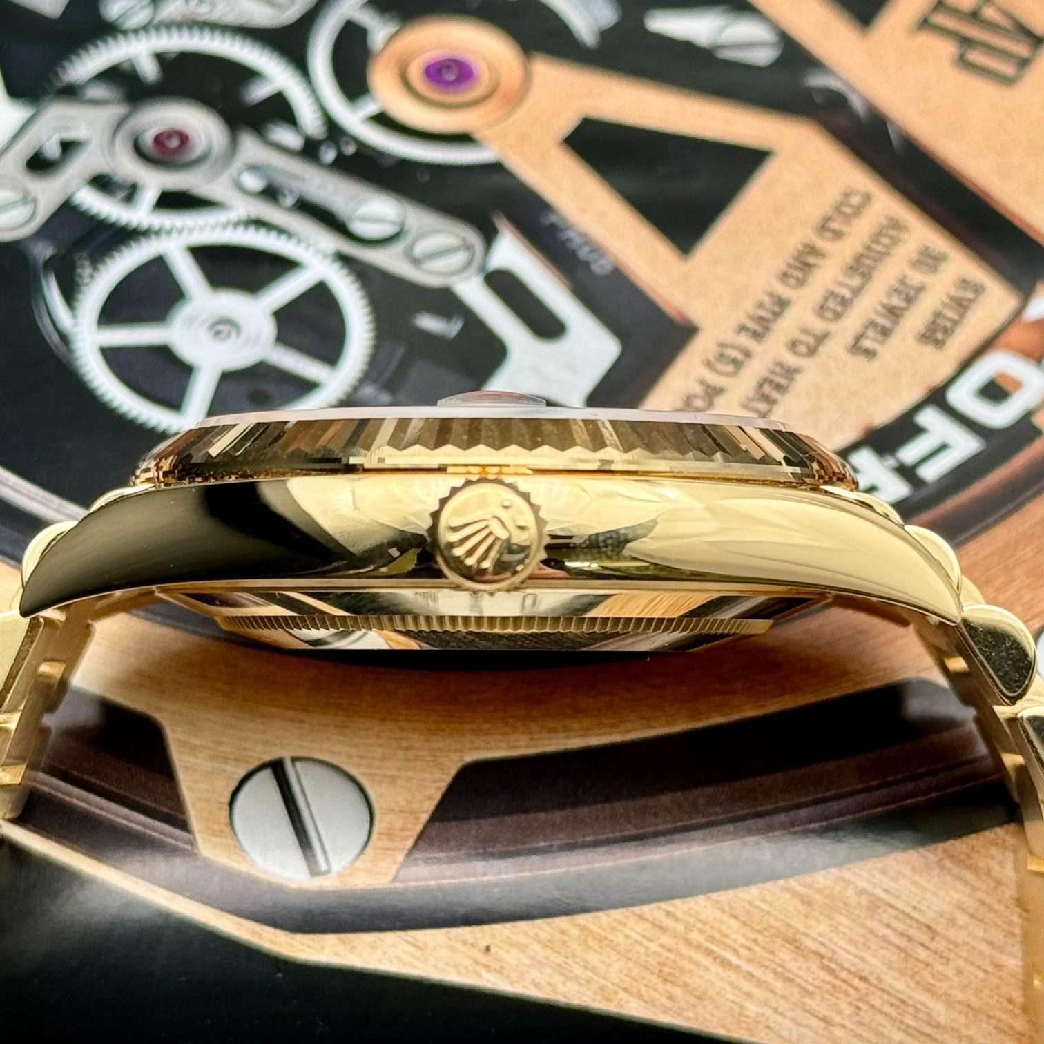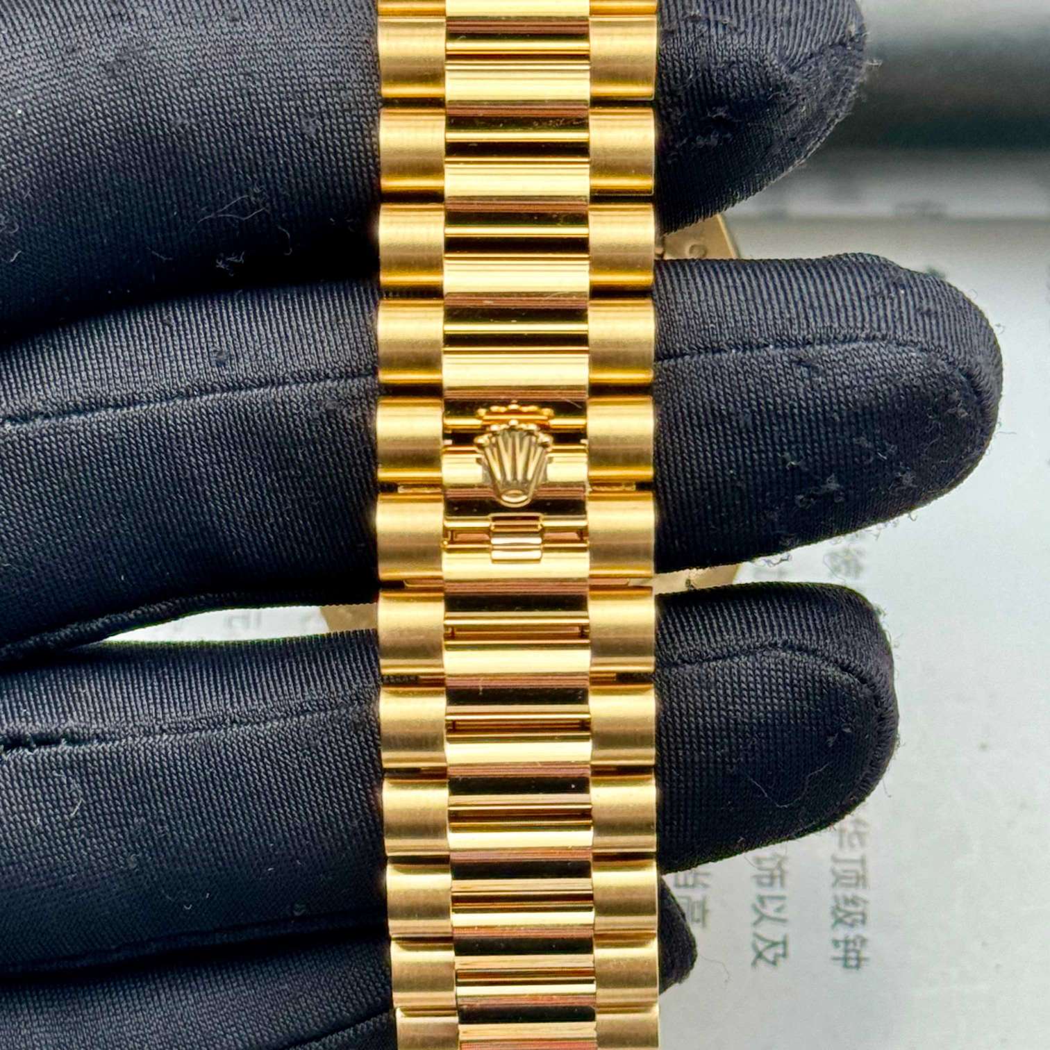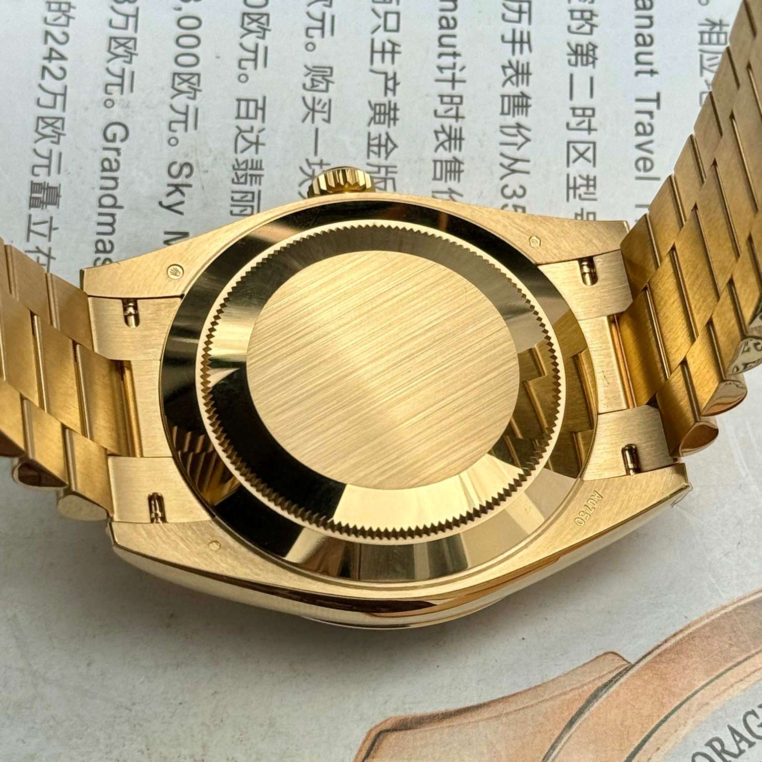 品牌:劳力士 系列:星期日历系列 型号:228238-0071 25年1月购入闲置未使用品,轻微存放运输痕迹。新款“贝母冰糖” 材质:18k黄金 镜面:蓝宝石玻璃 表盖:密底 表扣:折叠扣 表径:40mm 机芯类型:自动机械机芯 附件:25年盒证 公价:404300~