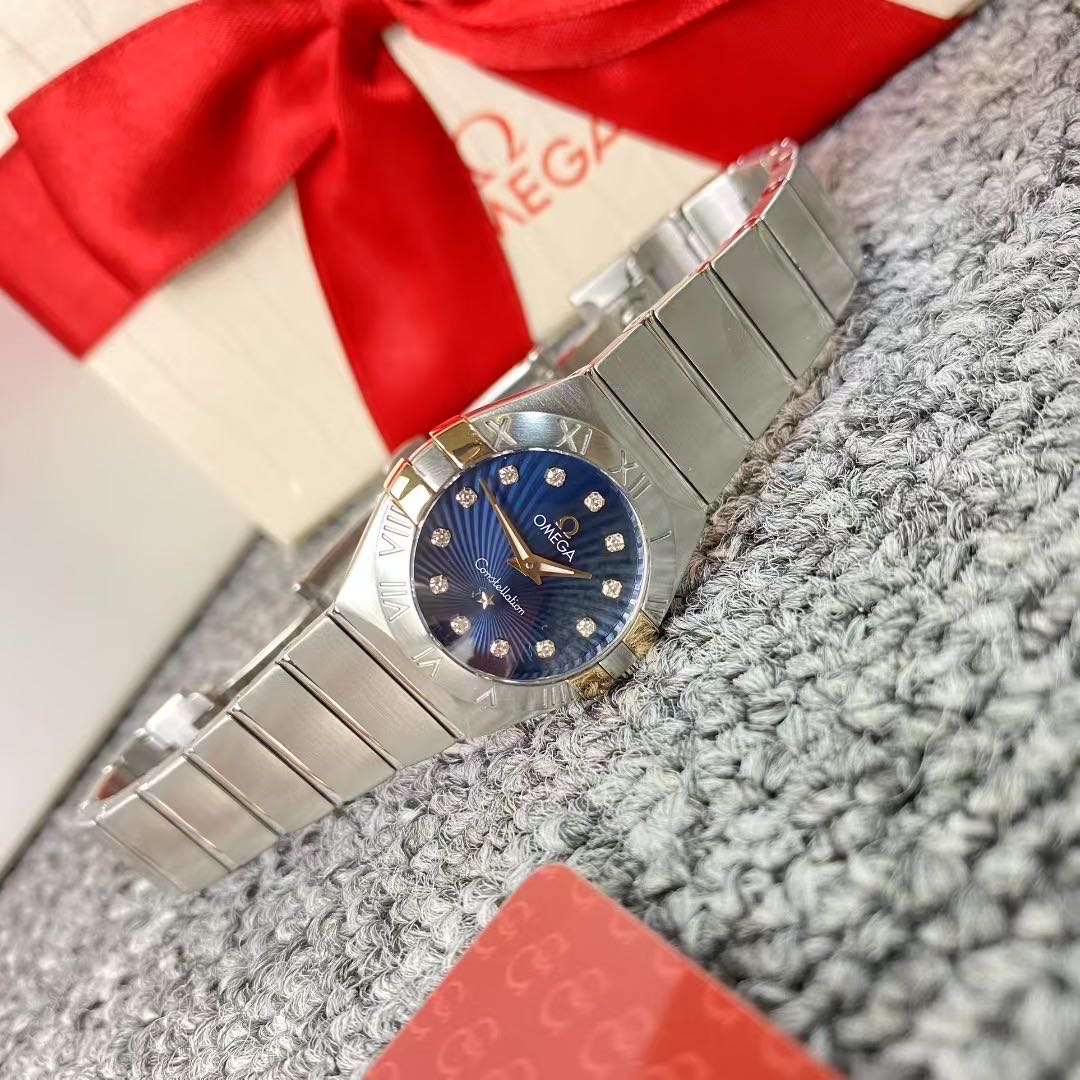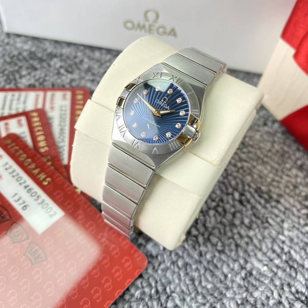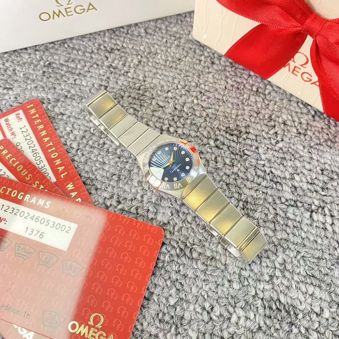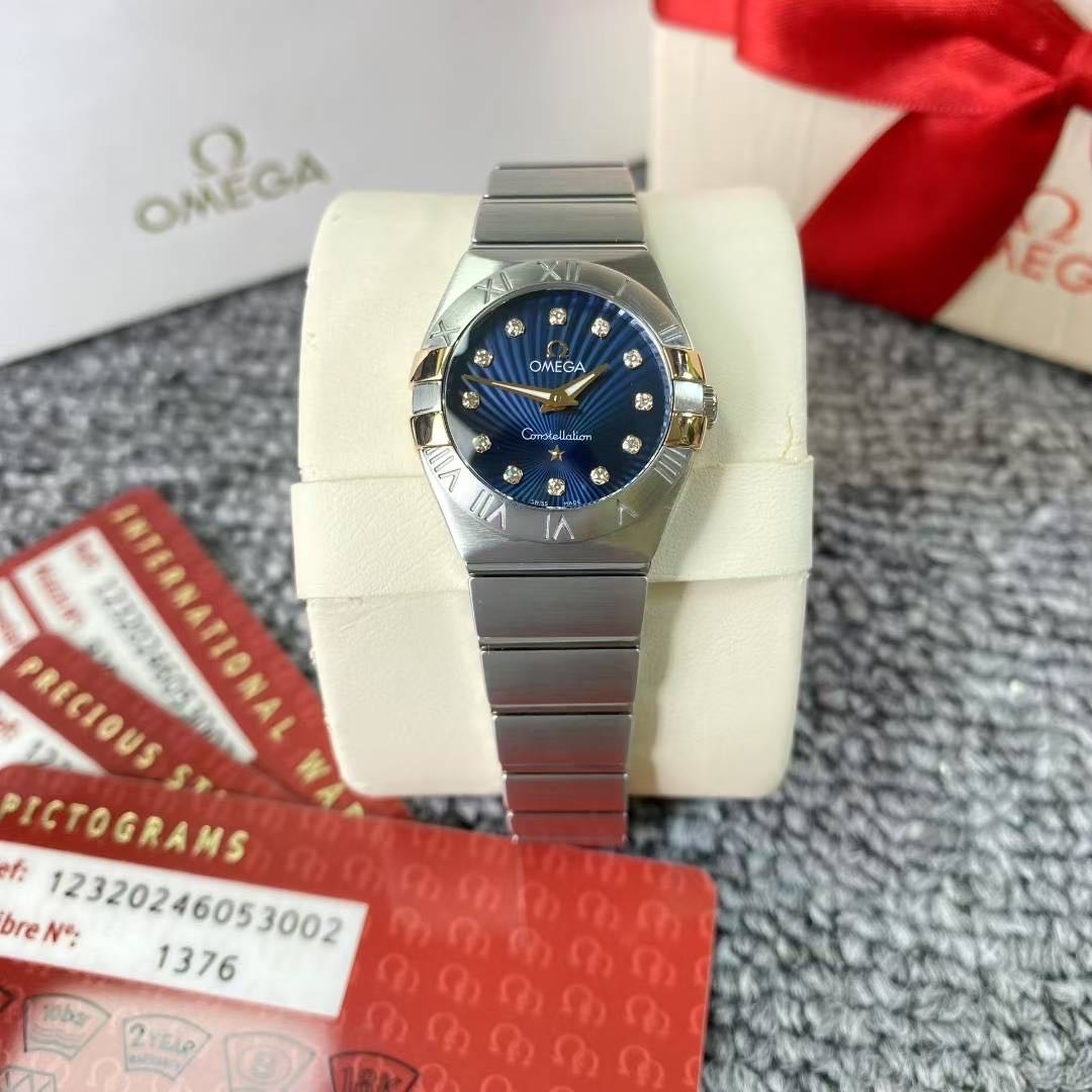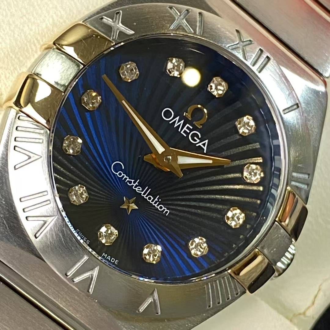 欧米茄星座系列石英女表,公价28400元,表径24mm,全套附件齐全,18k玫瑰金相间,放射纹蓝面 钻石刻度镶嵌。