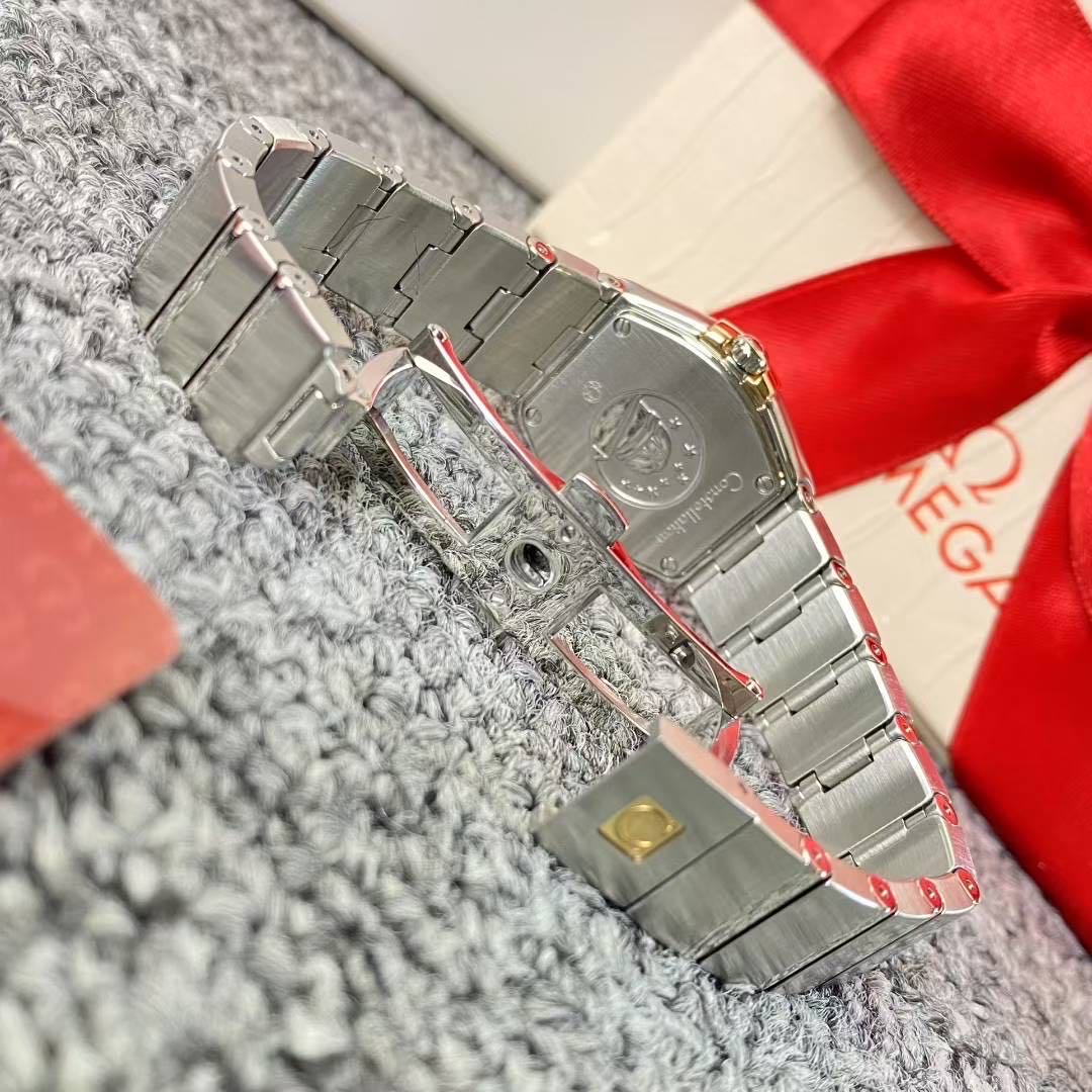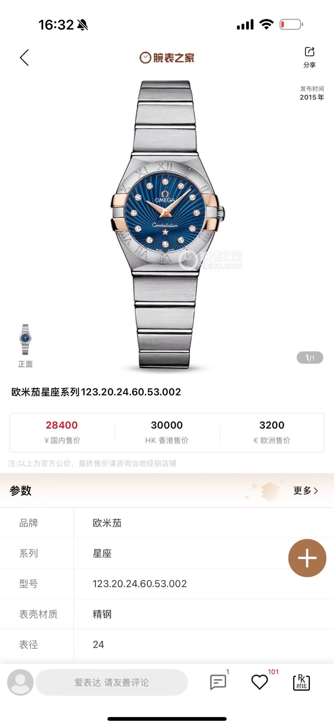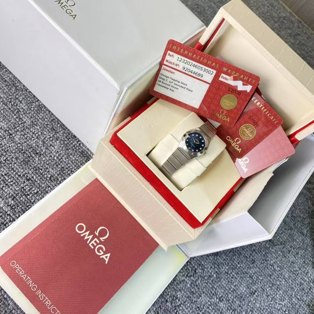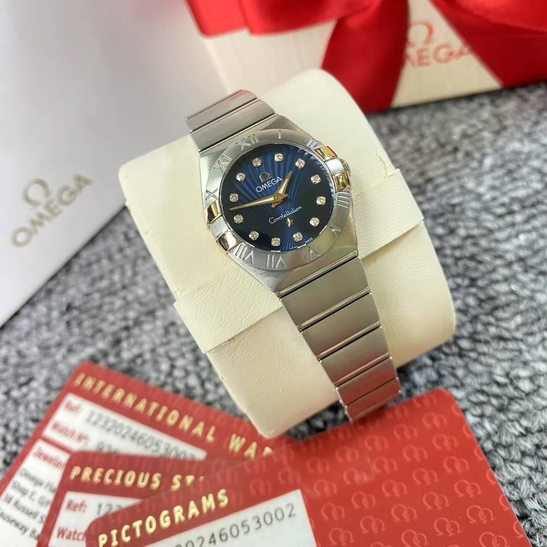 欧米茄星座系列石英女表,公价28400元,表径24mm,全套附件齐全,18k玫瑰金相间,放射纹蓝面 钻石刻度镶嵌。