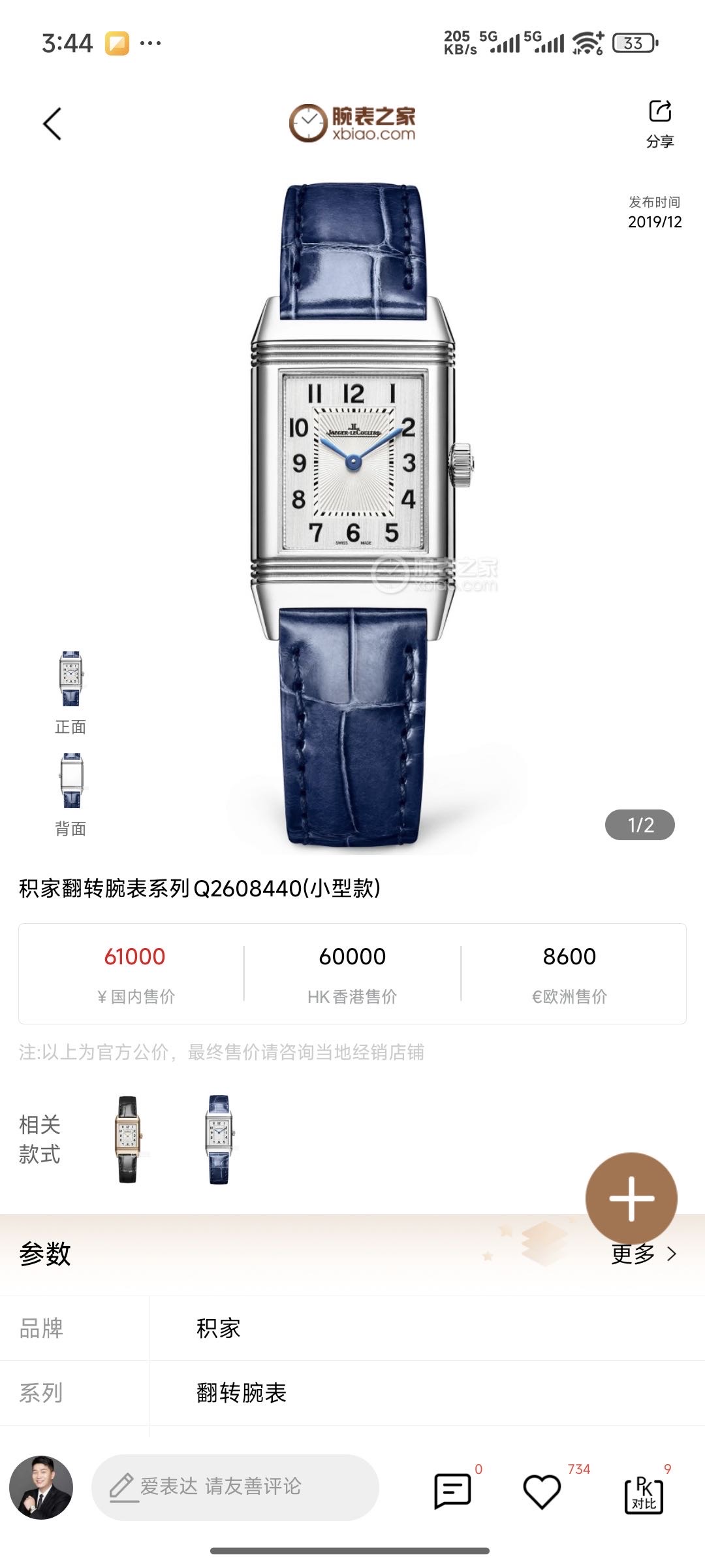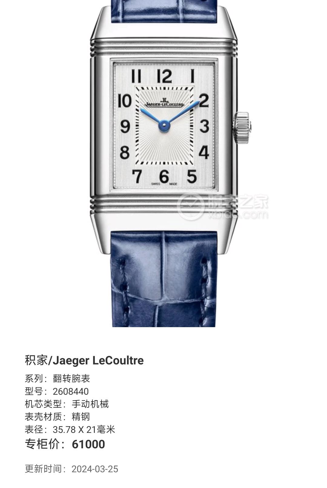 积家/Jaeger LeCoultre 翻转腕表 2608440 手动机械 精钢 35.78 X 21毫米 专柜价61000元 国行全新未使用25年7月卡