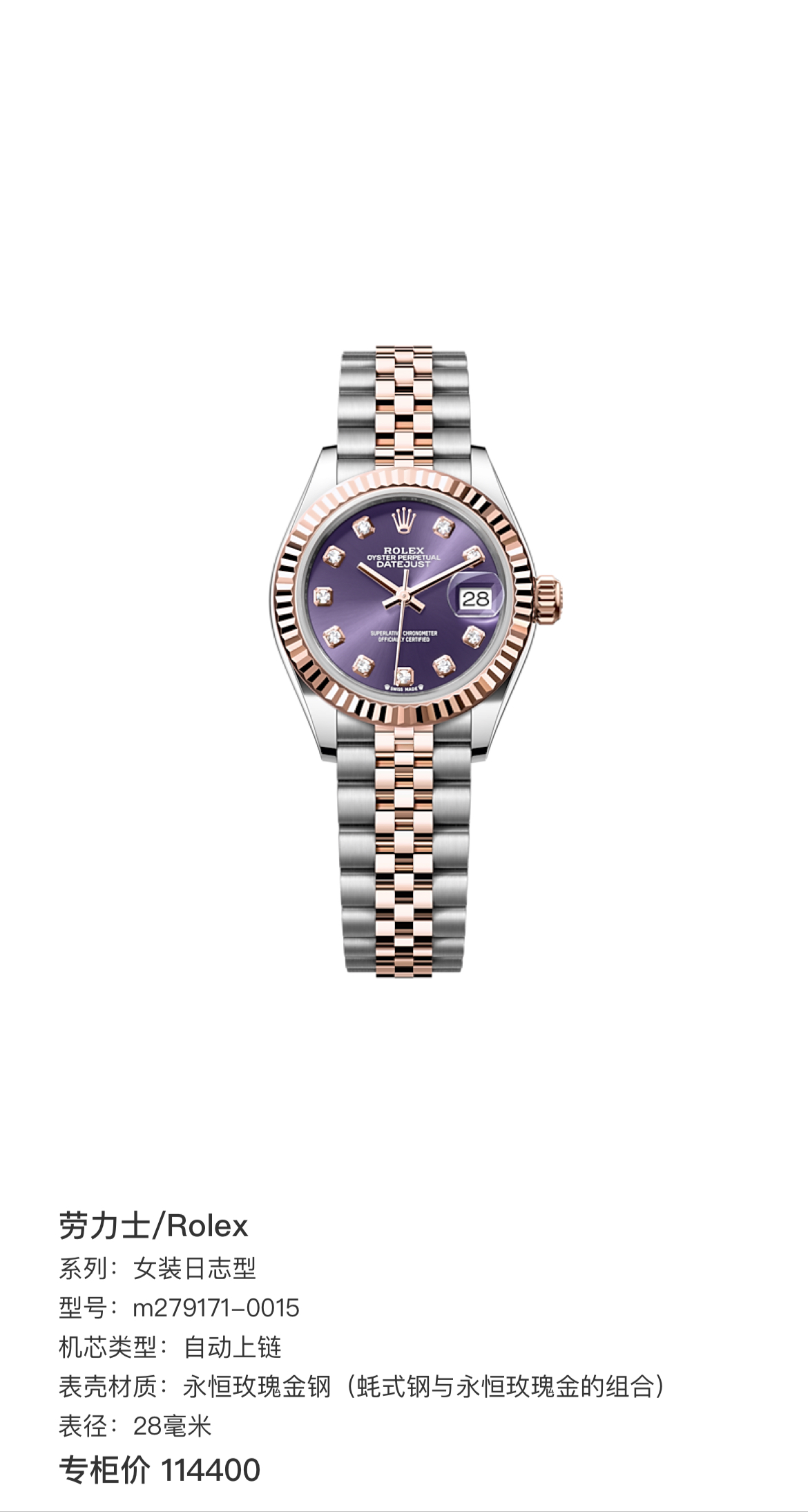 劳力士/Rolex 女装日志型 m279171-0015 自动上链 永恒玫瑰金钢(蚝式钢与永恒玫瑰金的组合) 28毫米 专柜价114400~