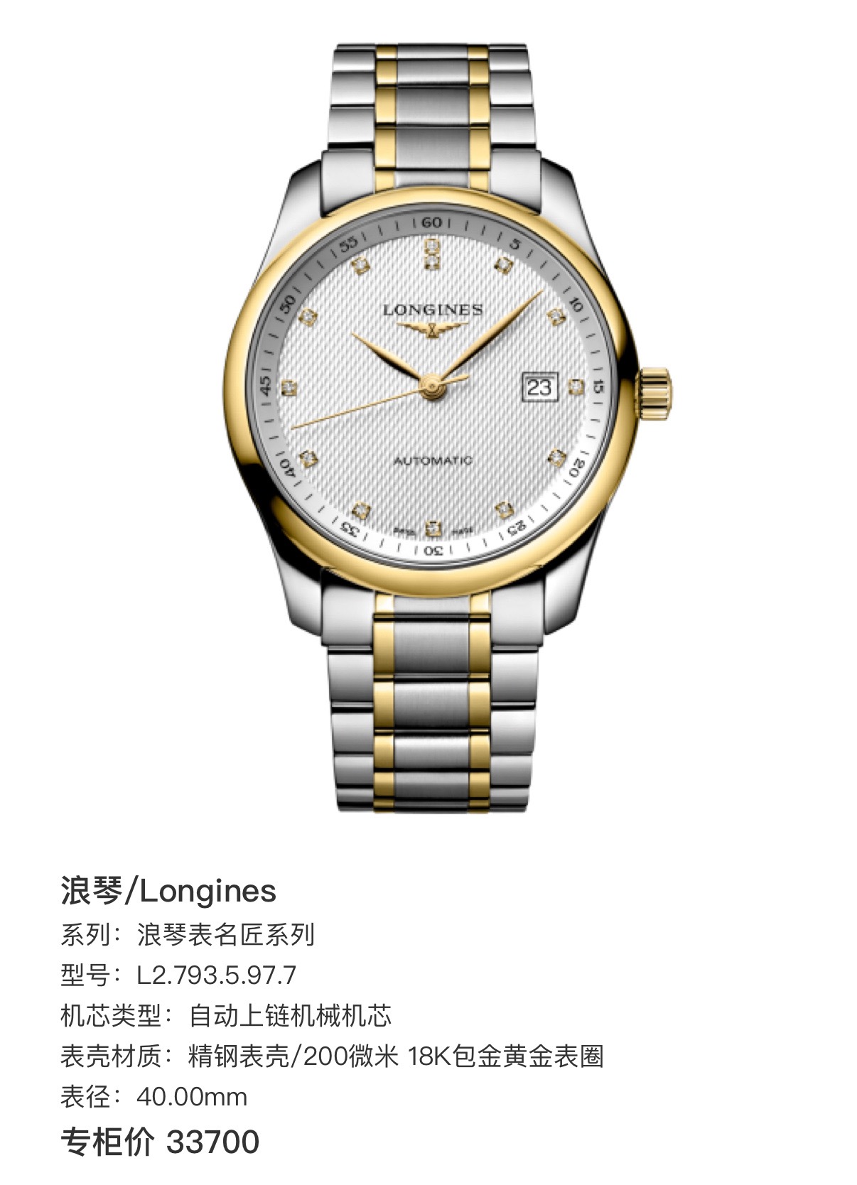 浪琴/Longines 浪琴表名匠系列 L2.793.5.97.7 自动上链机械机芯 18K包金黄金表圈 40表径 背透机芯 金针钻刻 日期显示 专柜价33700 单表好价