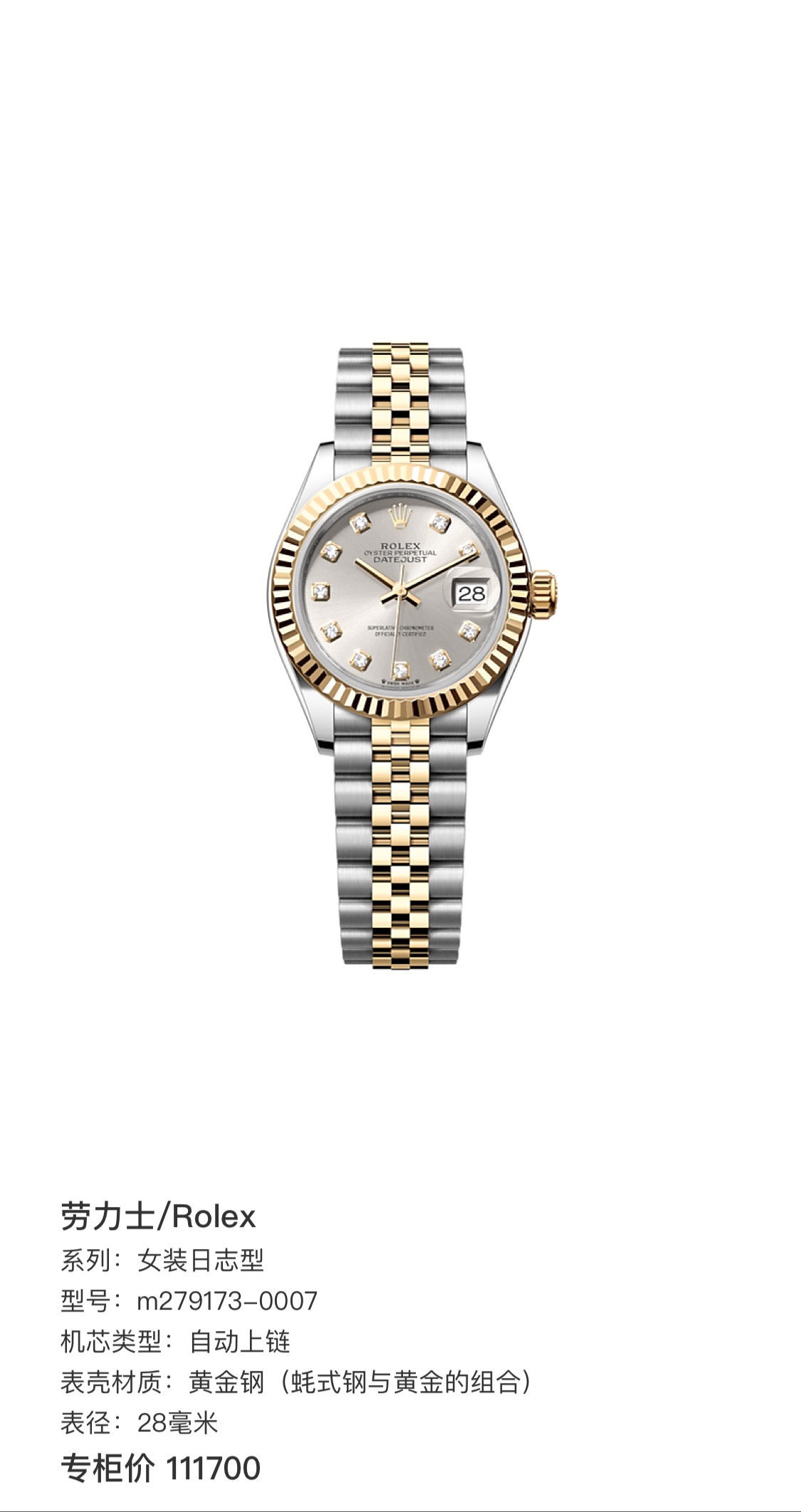 劳力士/Rolex 女装日志型 型号:m279173-0007 自动上链 黄金钢 28毫米表径 专柜价111700 单表好价