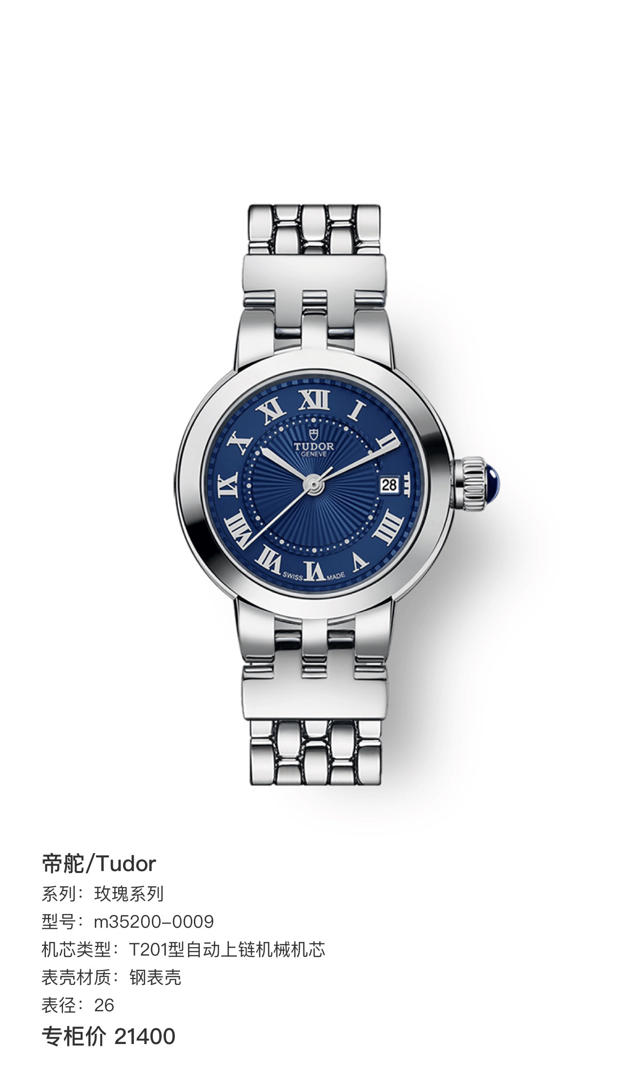 帝舵/Tudor 玫瑰系列 m35200-0009 T201型自动上链机械机芯 钢表壳 26 专柜价21400~