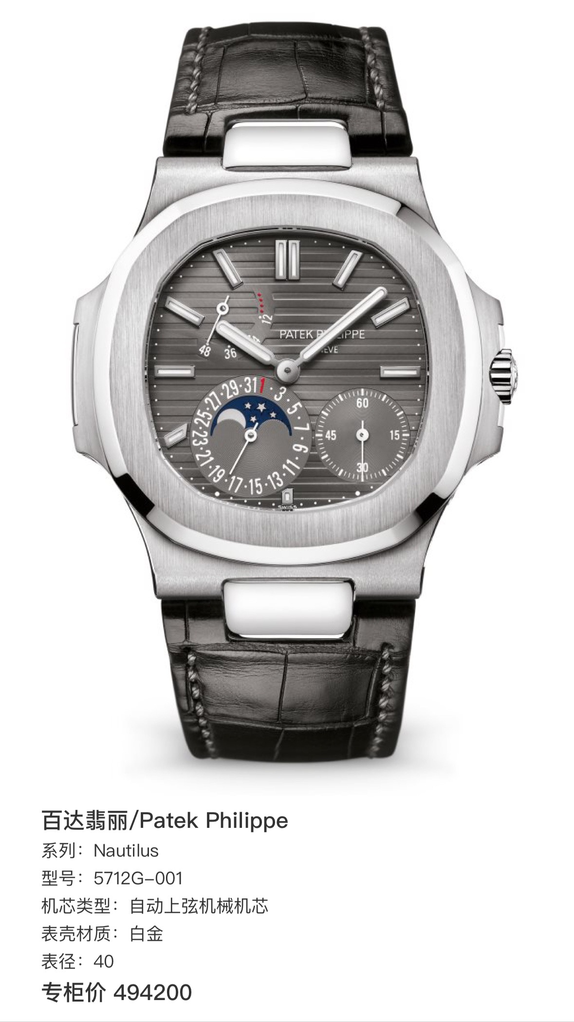 百达翡丽/Patek Philippe Nautilus 5712G-001 自动上弦机械机芯 白金 40 专柜价494200