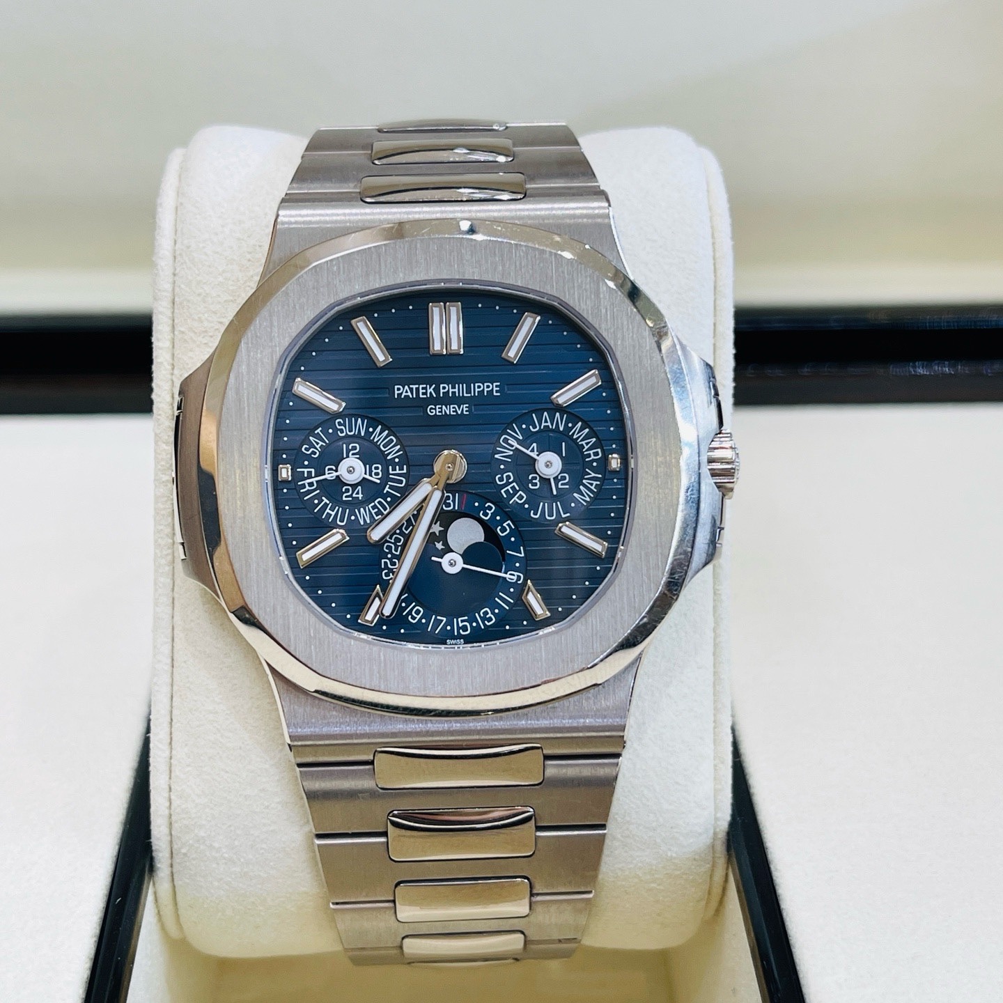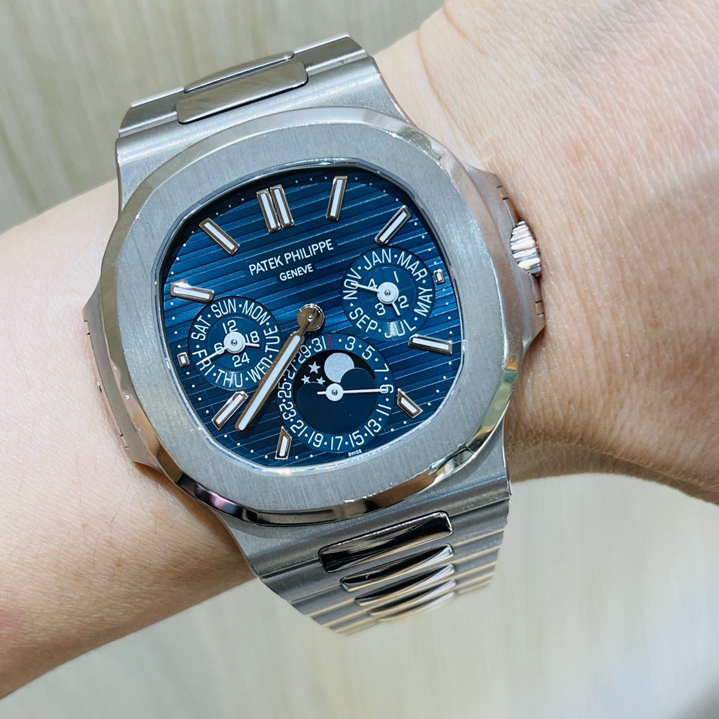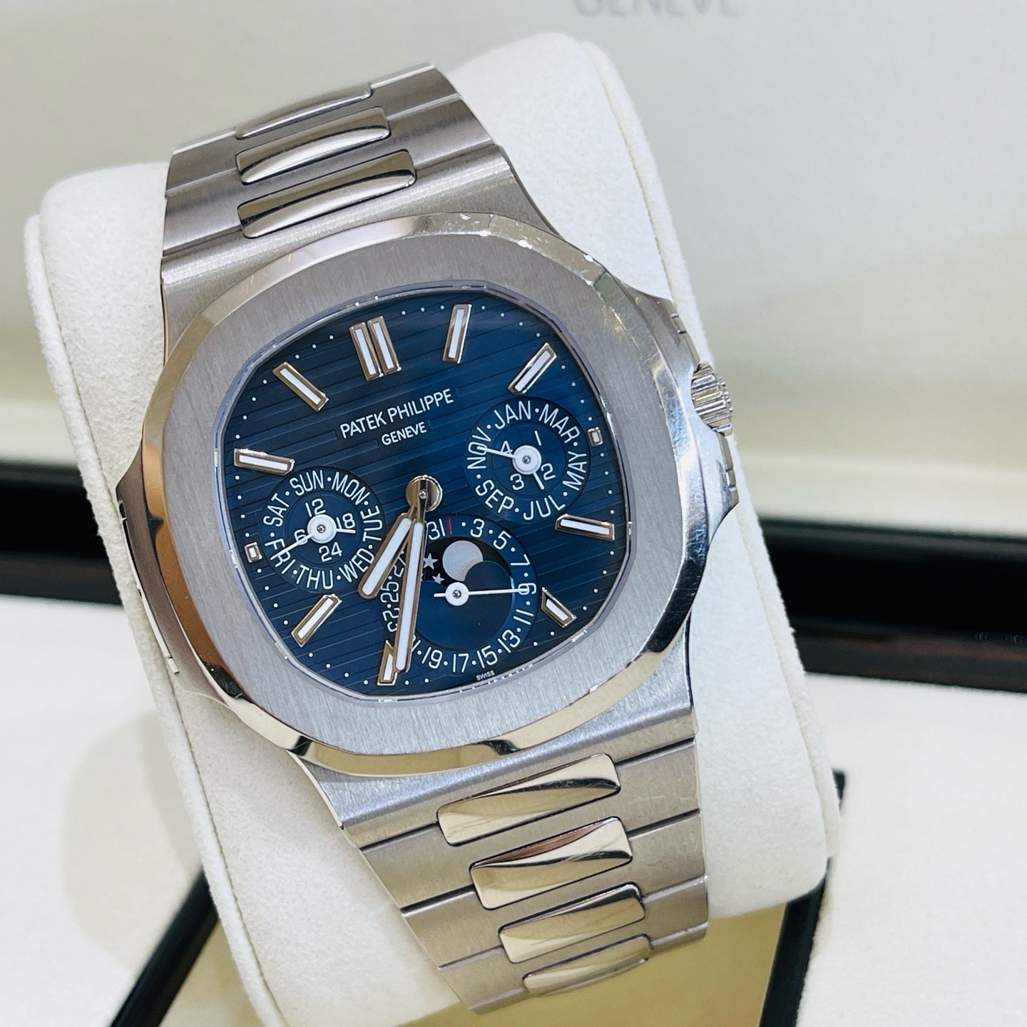 百达翡丽运动优雅系列5740G,白金万年历蓝盘,最热门款鹦鹉螺之一,40mm表径,18k白金材质,