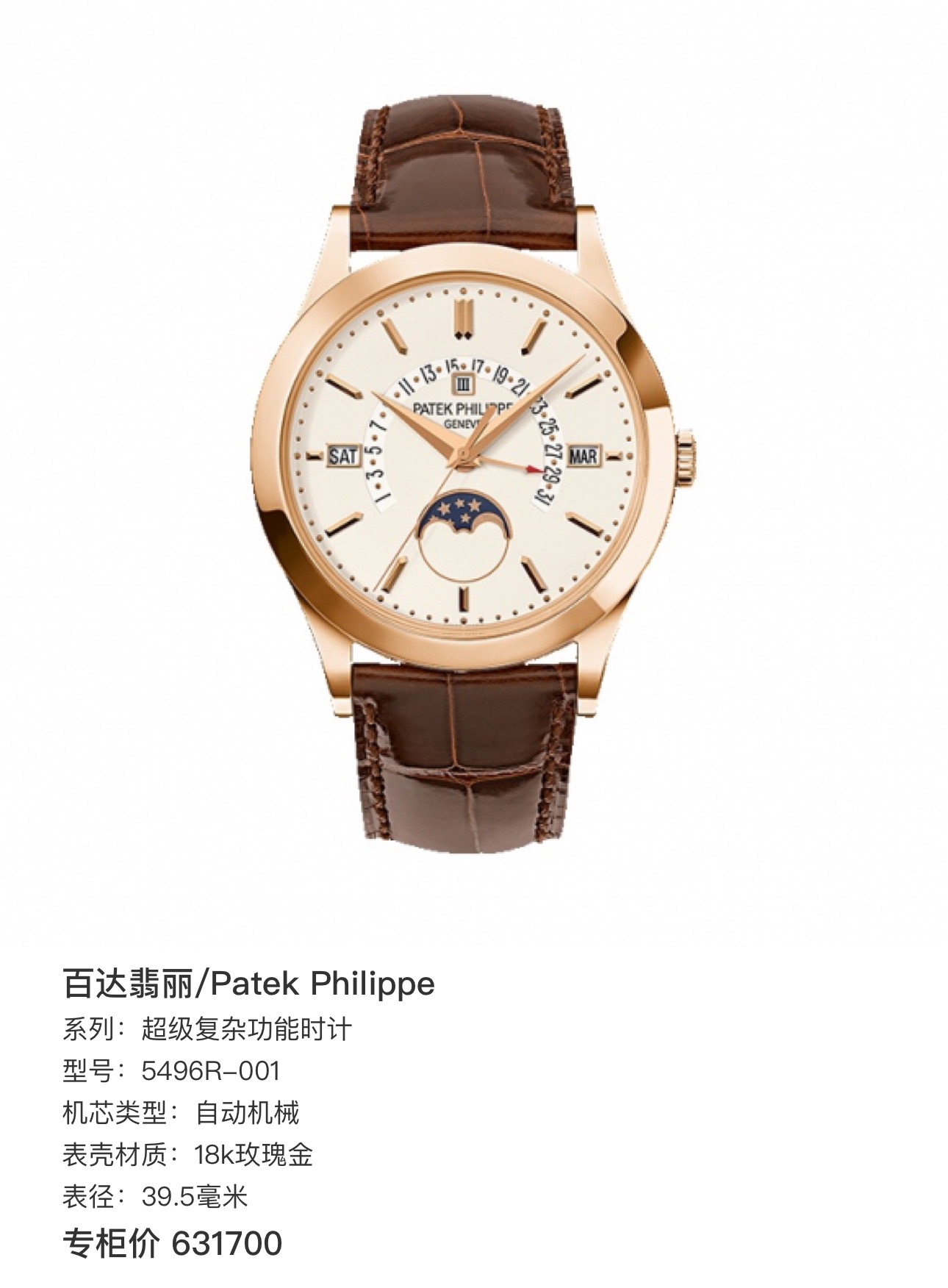 百达翡丽/Patek Philippe 超级复杂功能时计 5496R-001 自动机械 18k玫瑰金 39.5毫米 专柜价631700