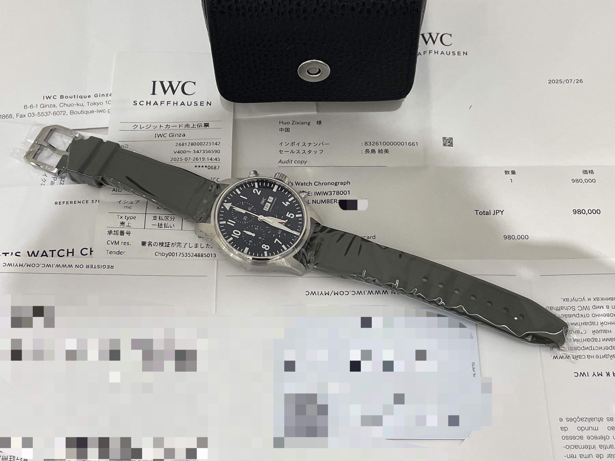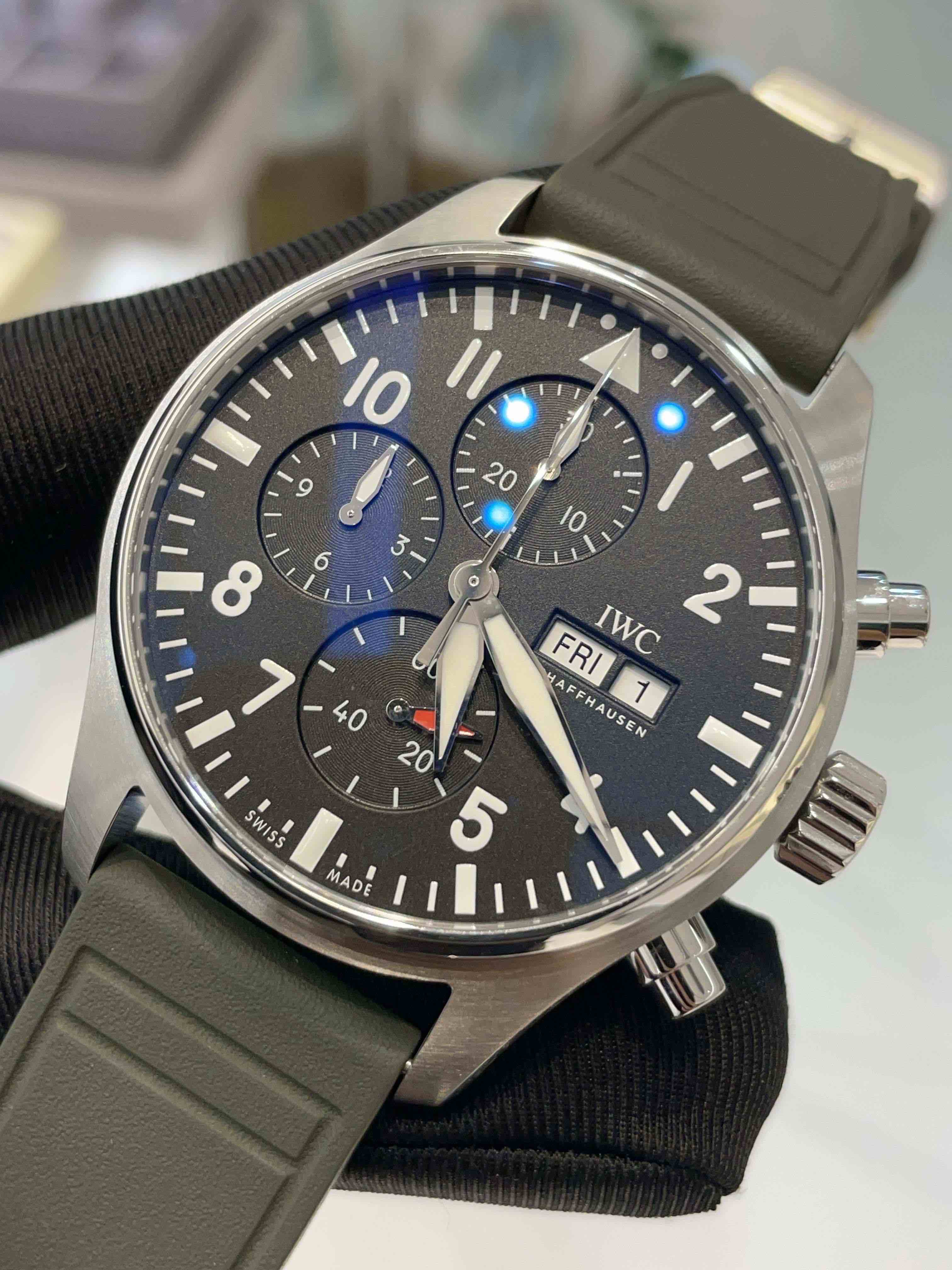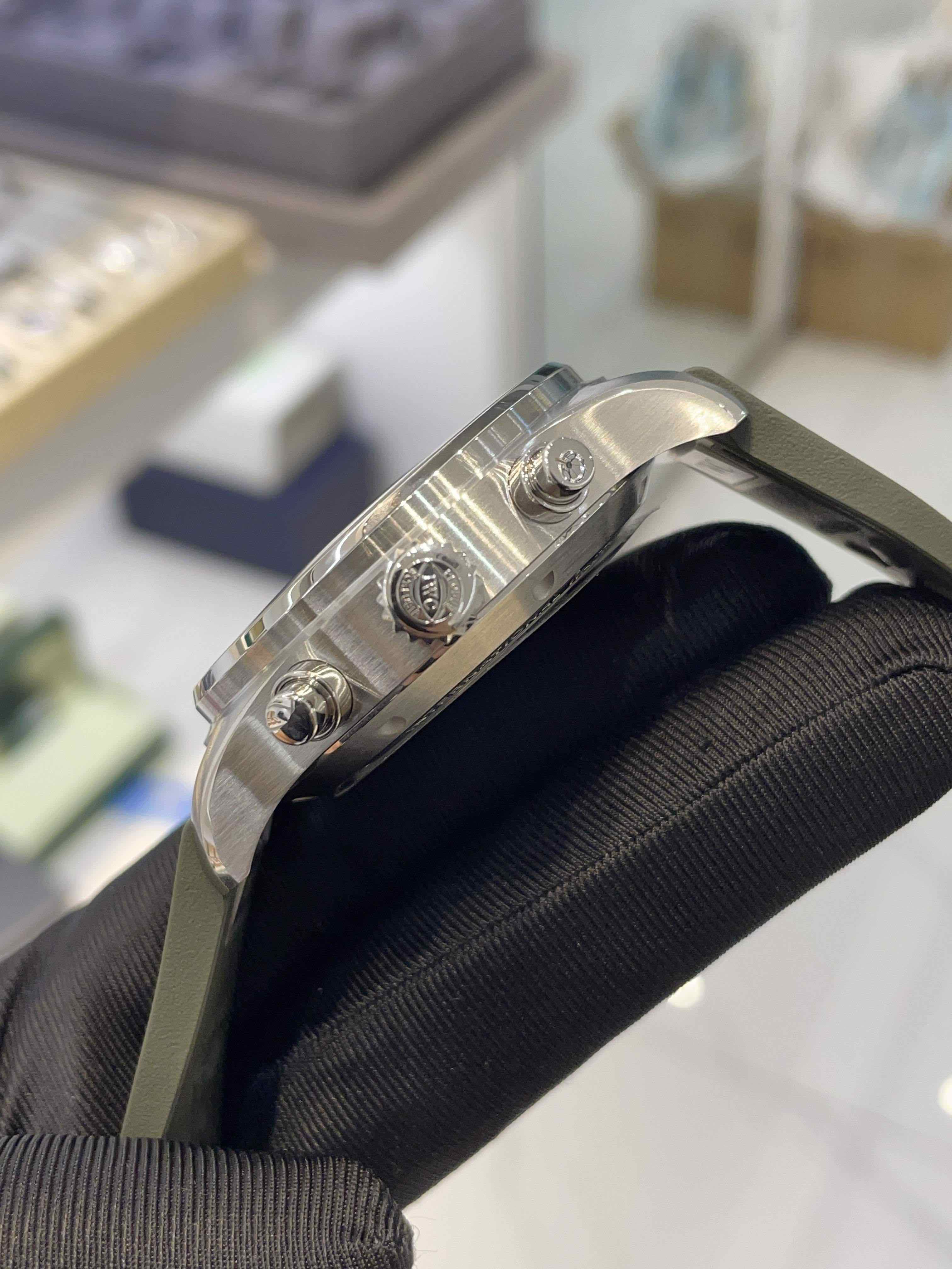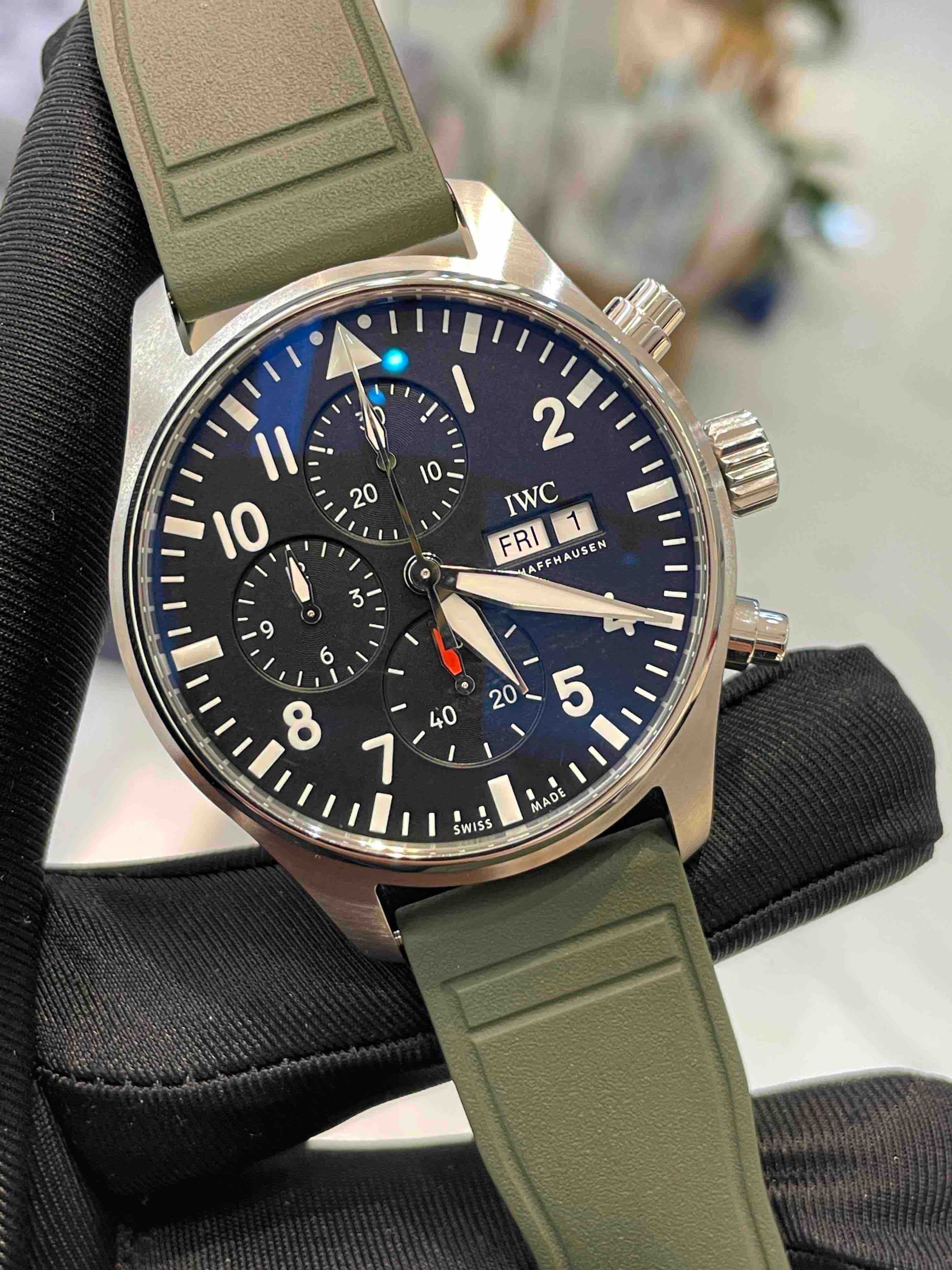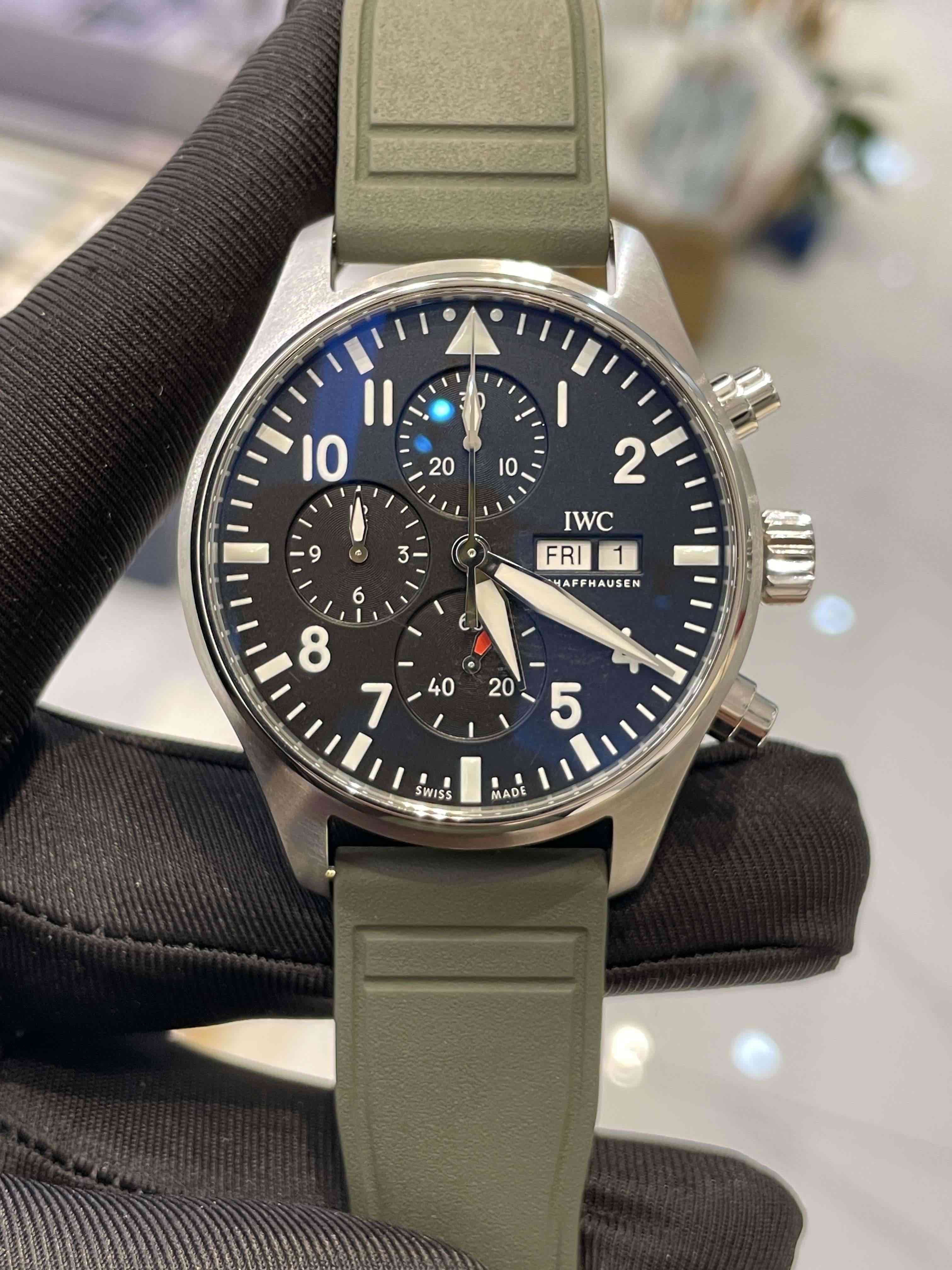 万国-飞行员,IW378001,全新未使用,7月26号全套带票,已延保八年,客户自费升级原装快拆胶带。43毫米自动机械计时,星期、日历显示,原价56600,