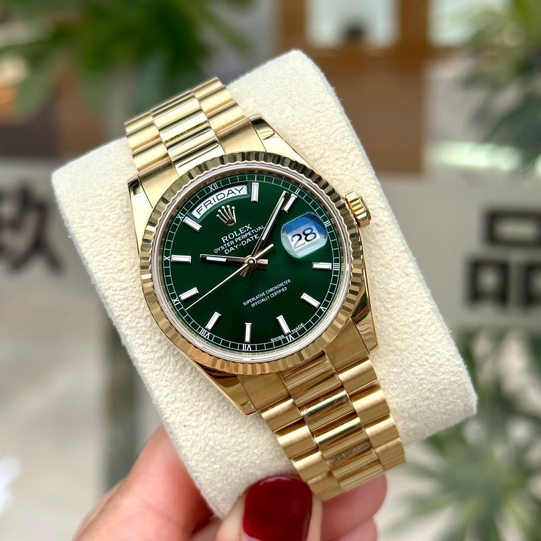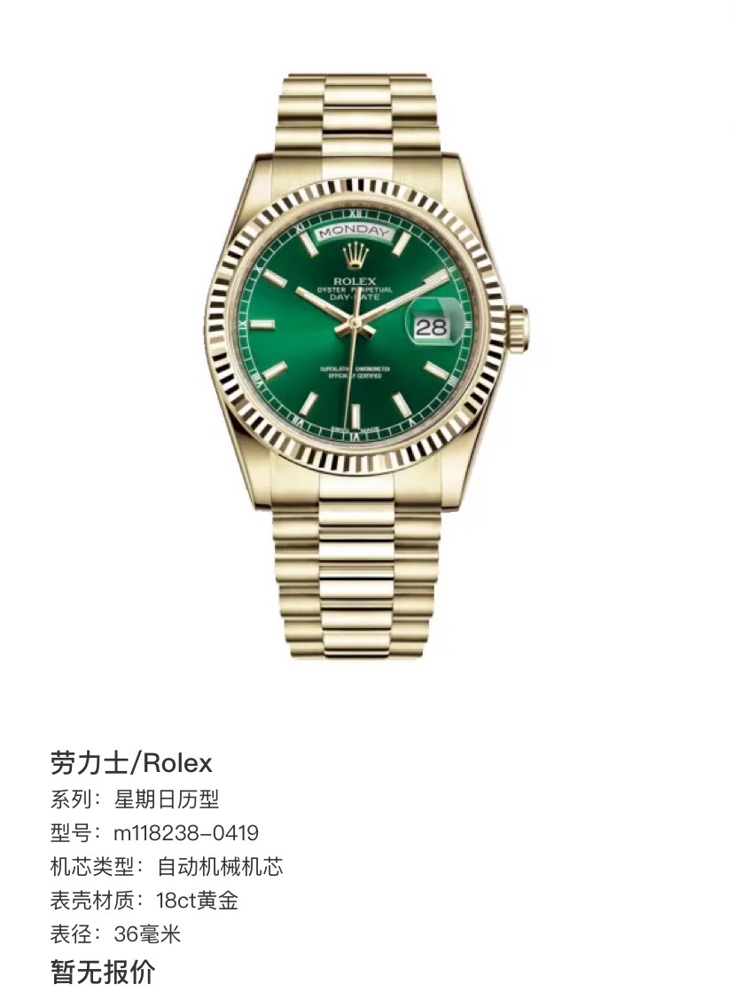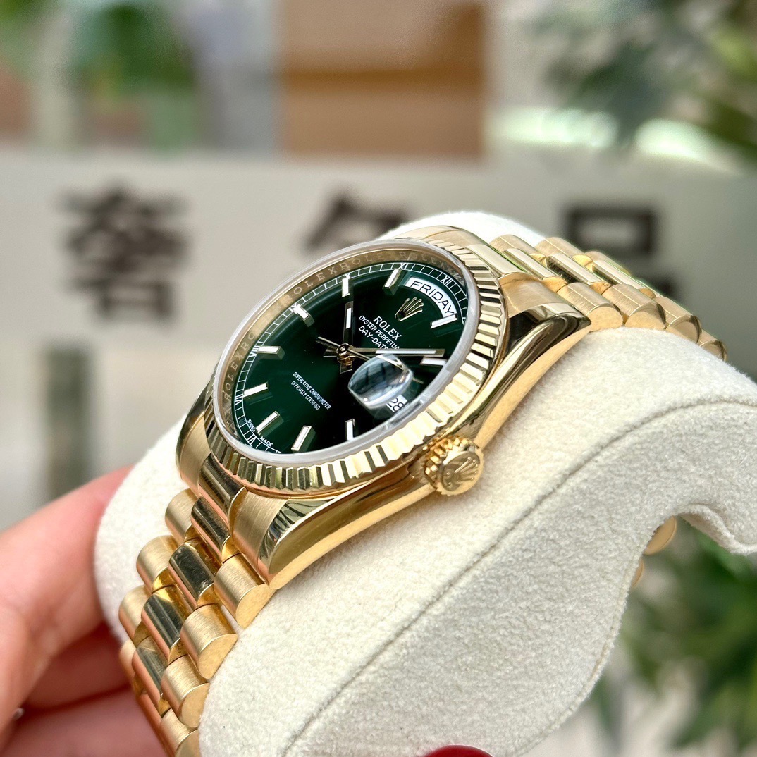劳力士/Rolex 星期日历型 m118238-0419 自动机械机芯 18ct黄金 36毫米 参考原公价254800 已停产绝版款的绿盘劳力士。全套,成色品相极佳~