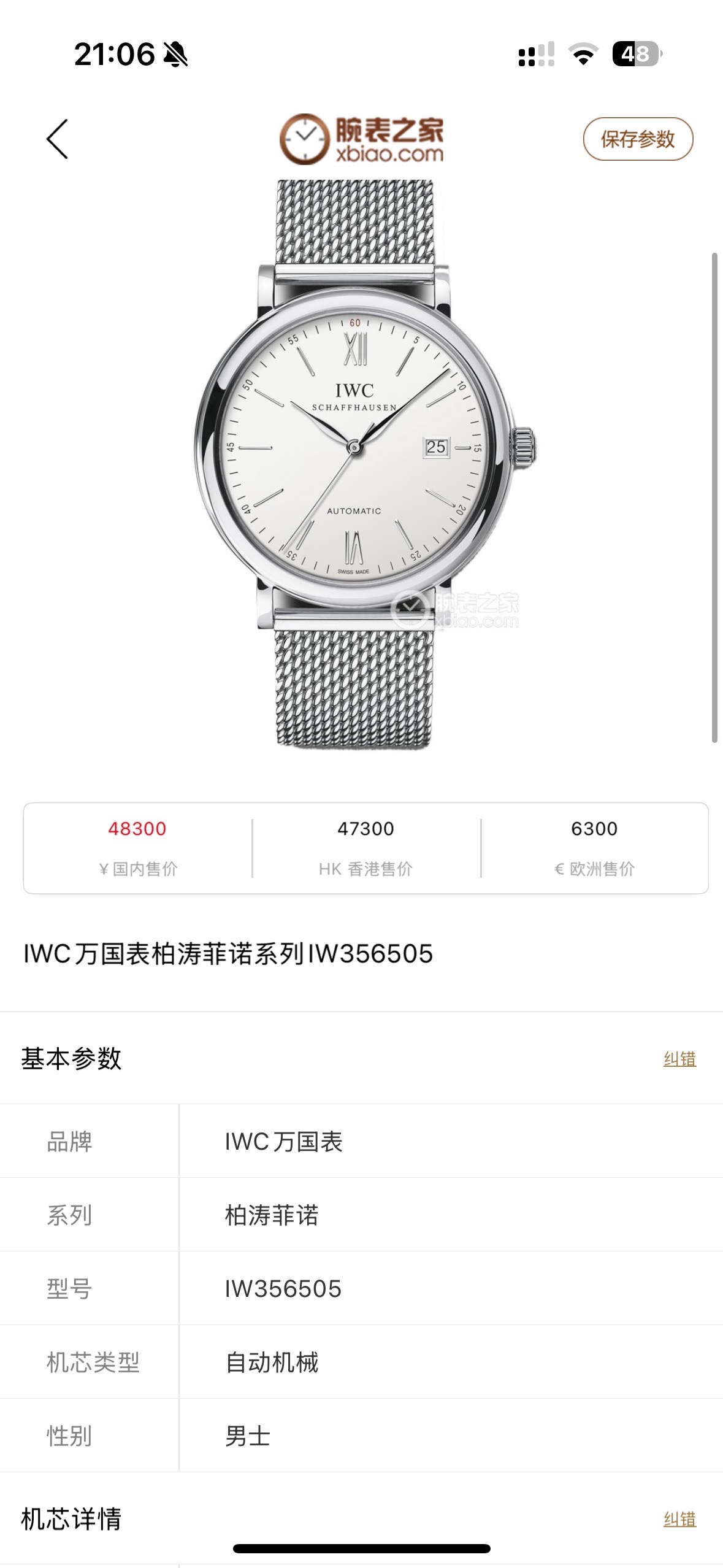 万国柏涛菲诺IW356505机械男性