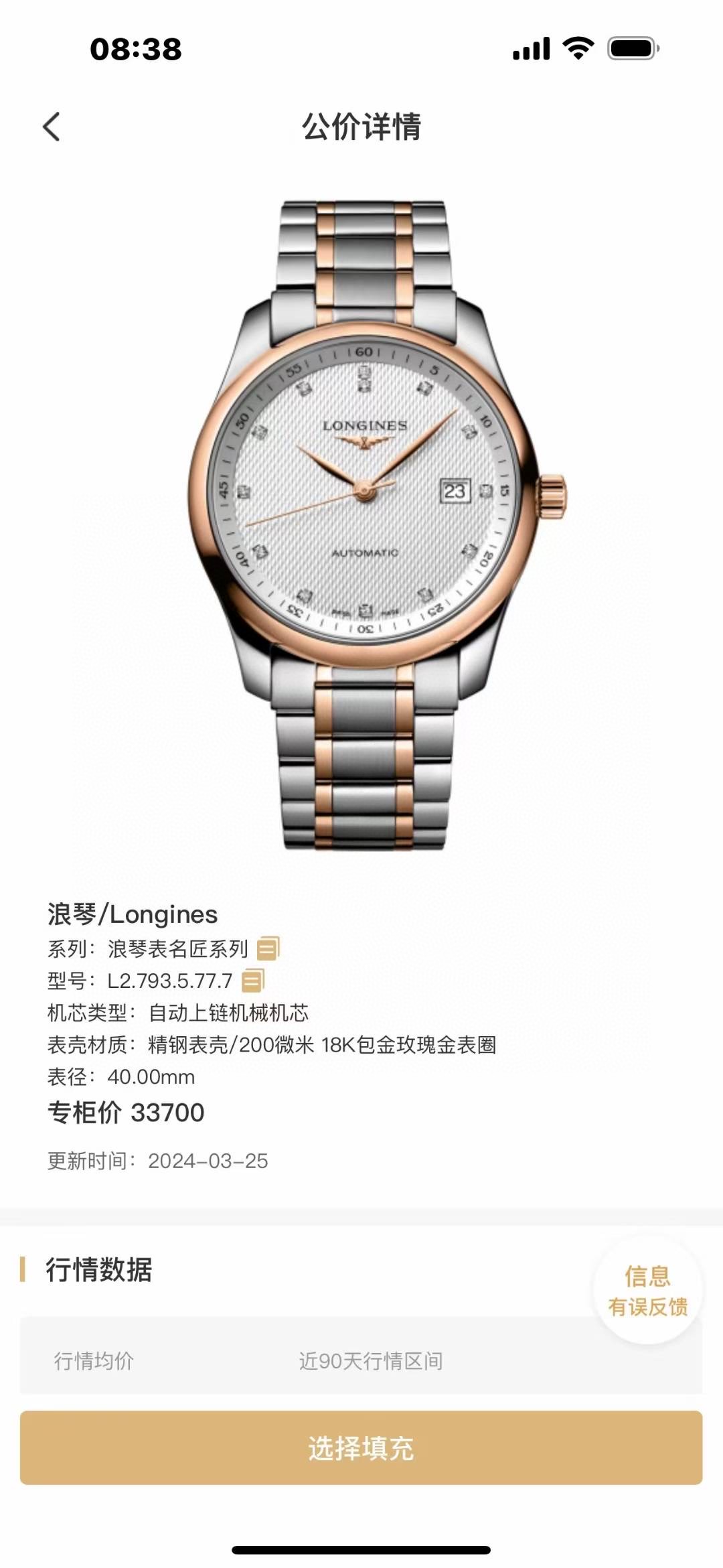 浪琴名匠793自动机械男表,表径40mm,表壳、表链间18K玫瑰金,成色完美,公价33700