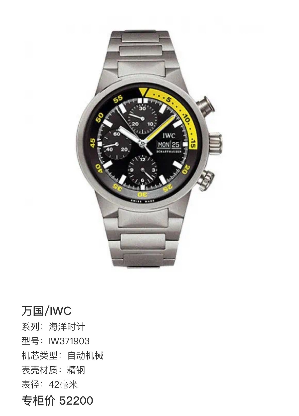 万国 钛金属 海洋时计系列 IW371903 公价:52200 表径:42毫米 表壳厚度:15毫米 机芯型号:CAL.79320 机芯类型:自动机械 动力储备:44小时