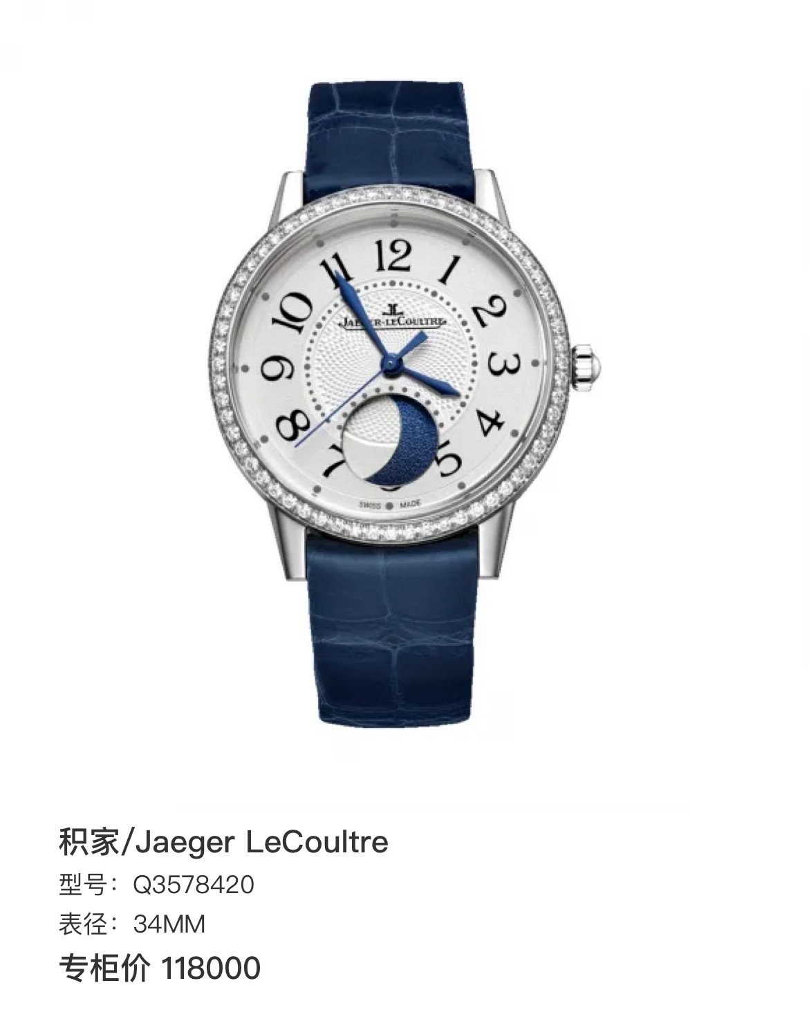 积家约会系列Q3578420,34mm表径,月相功能,背透,原钻圈,自动机械,公价114000,