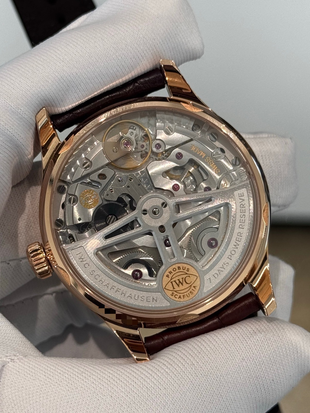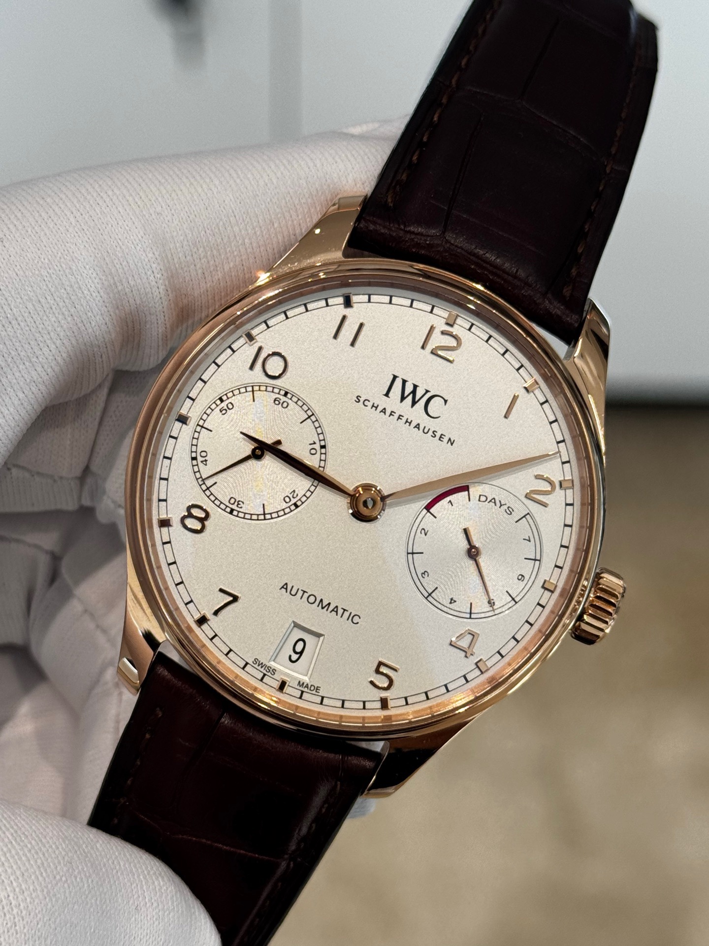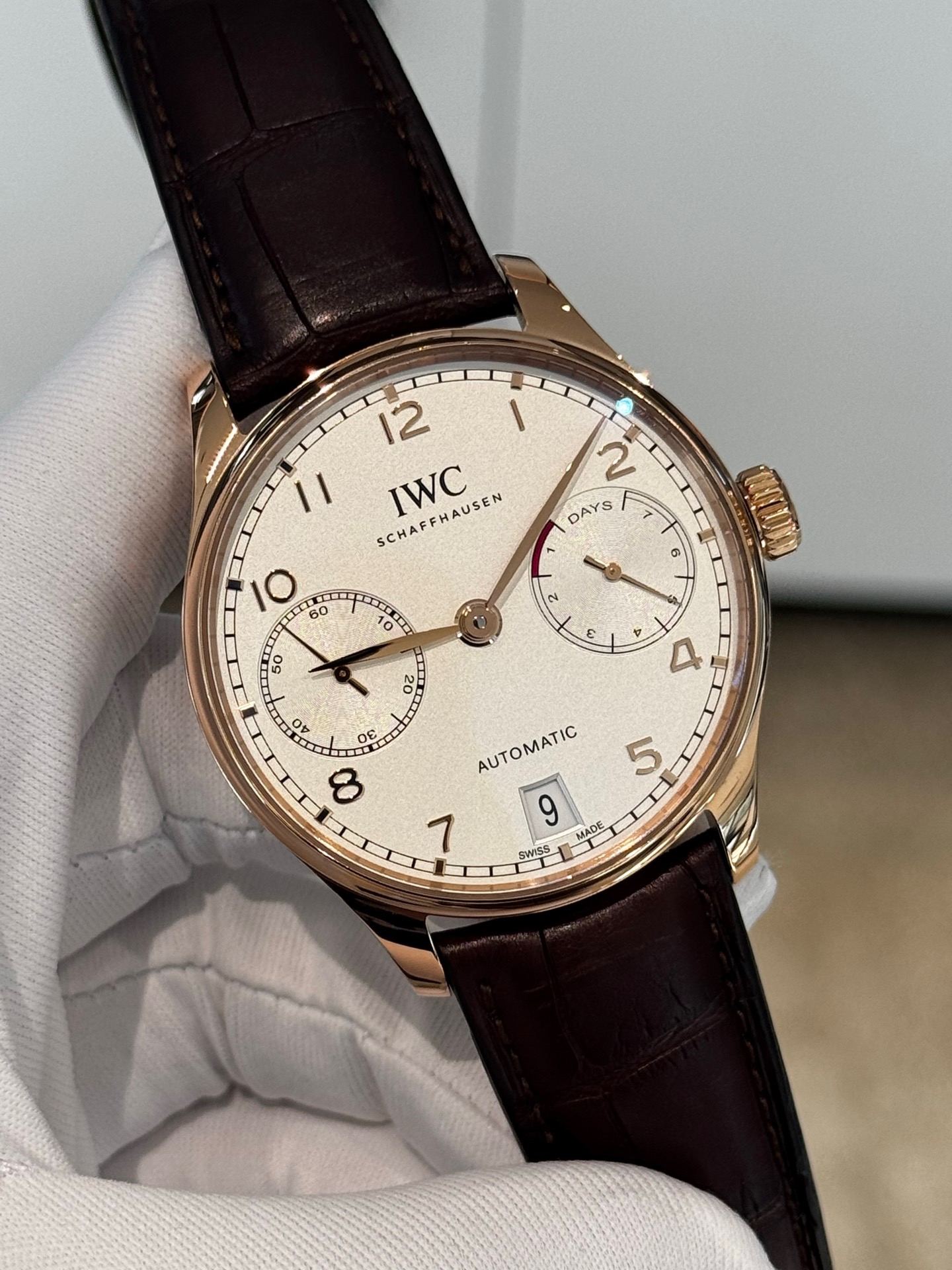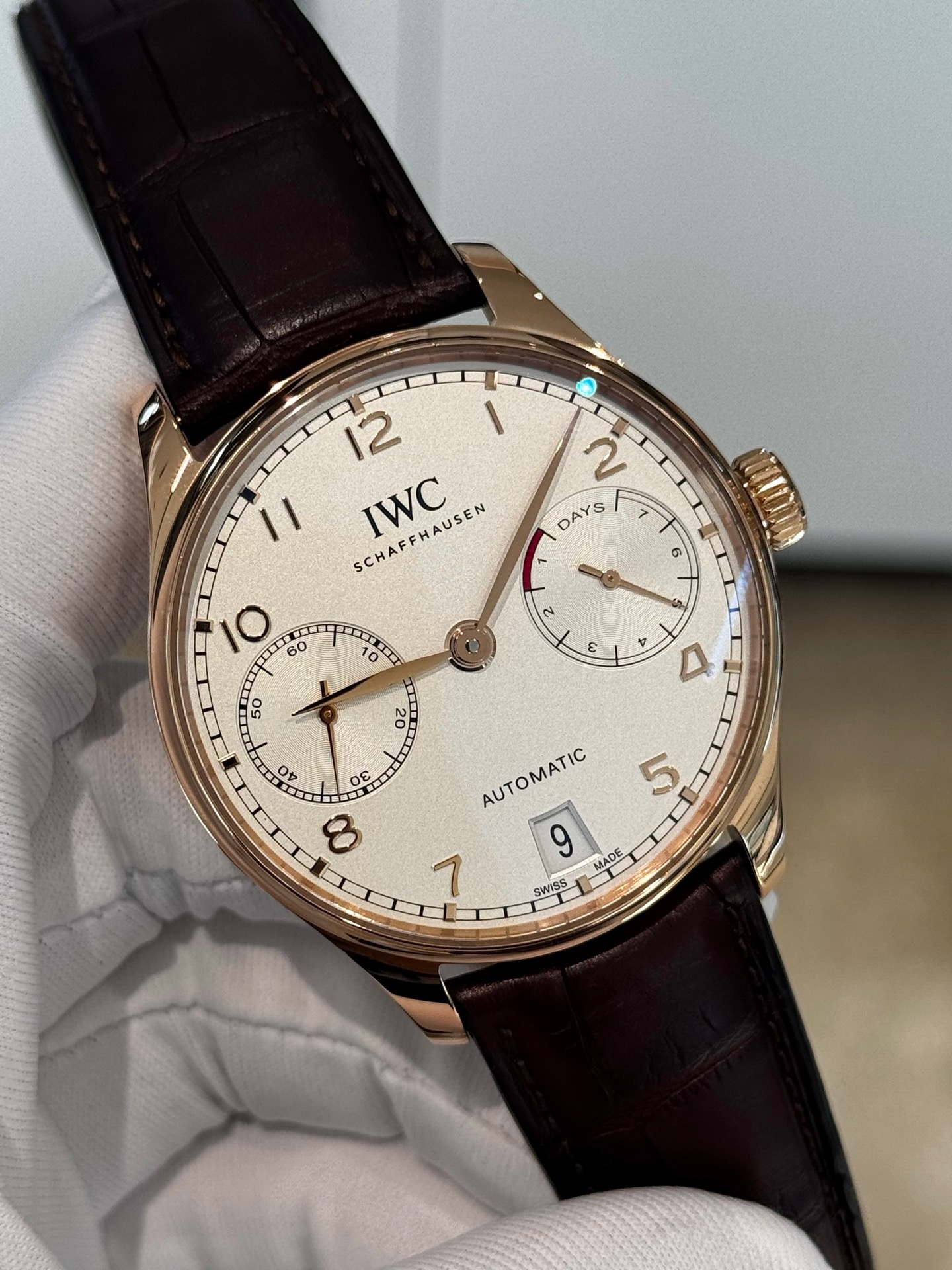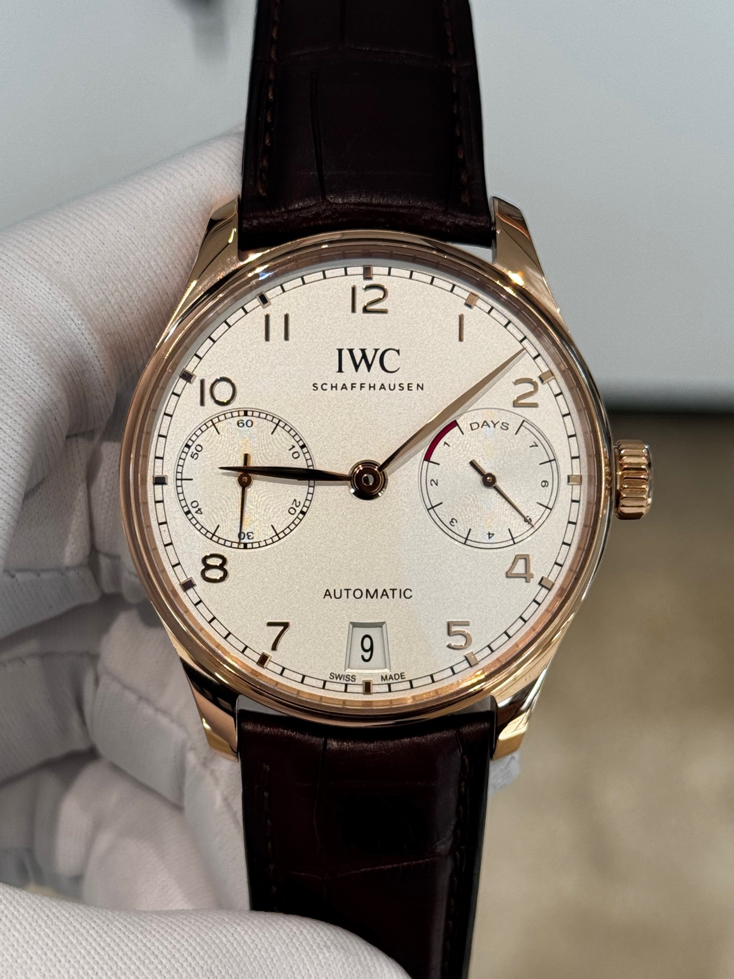全套IWC万国表葡萄牙系列IW500701男士自动机械腕表 热门款七日链 带票据 表径42毫米 白色表盘 背透机芯 新款机芯 搭配折叠扣 采用玫瑰金材质打造 日期显示 动力储备显示 专柜价190000 现货好价
