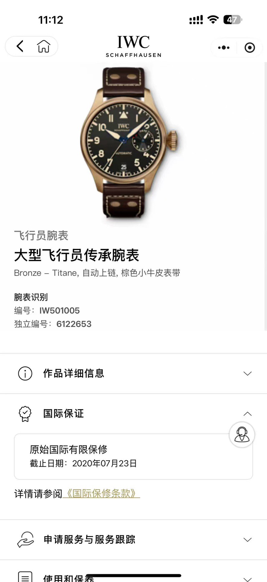 极品单 已翻新 万国 飞行员大型飞行员腕表系列 IW501005 公价:108000 表径:46.2毫米 表壳厚度:15.4毫米 机芯型号:52110 机芯类型:自动机械 动力储备:168小时