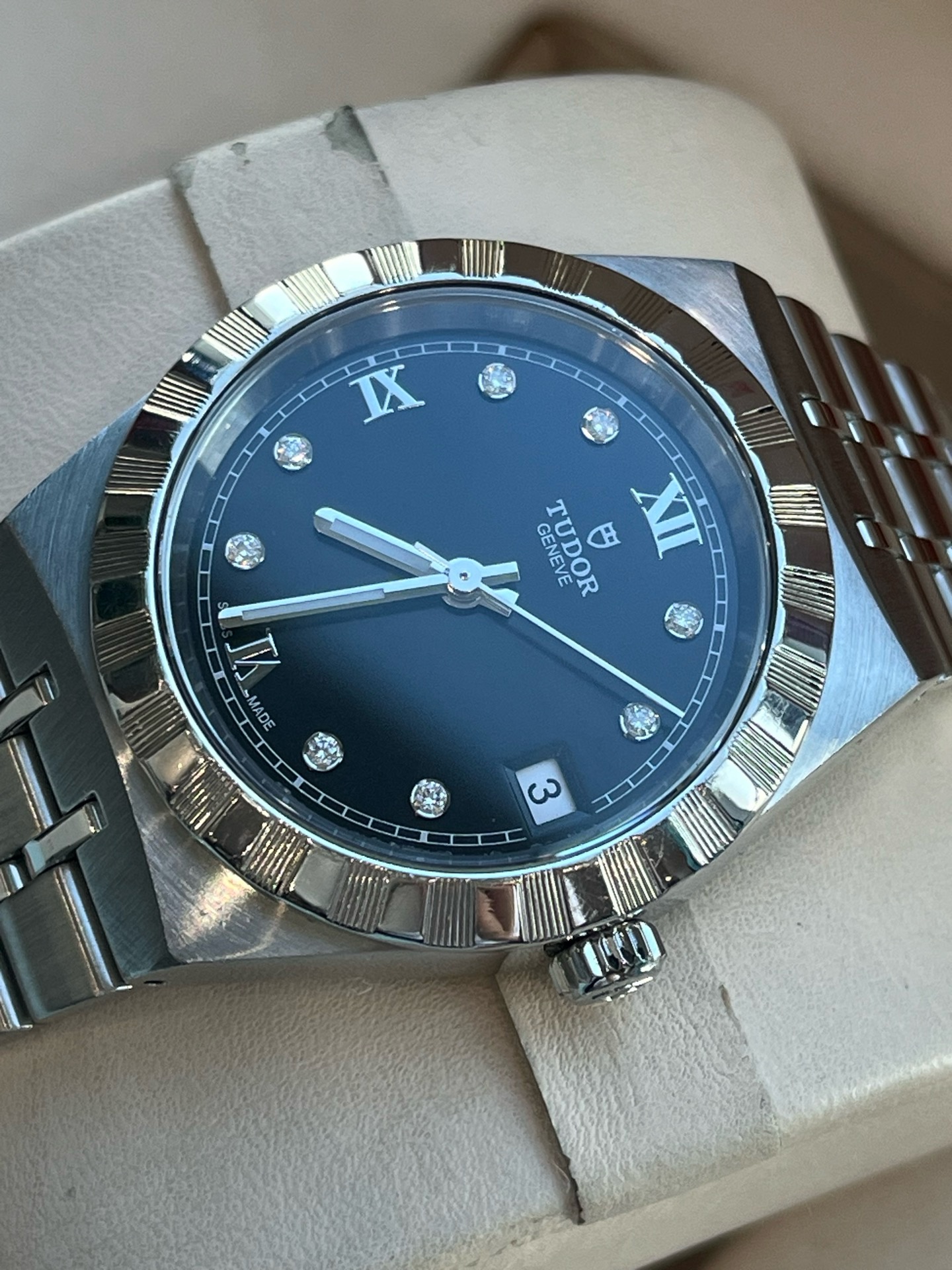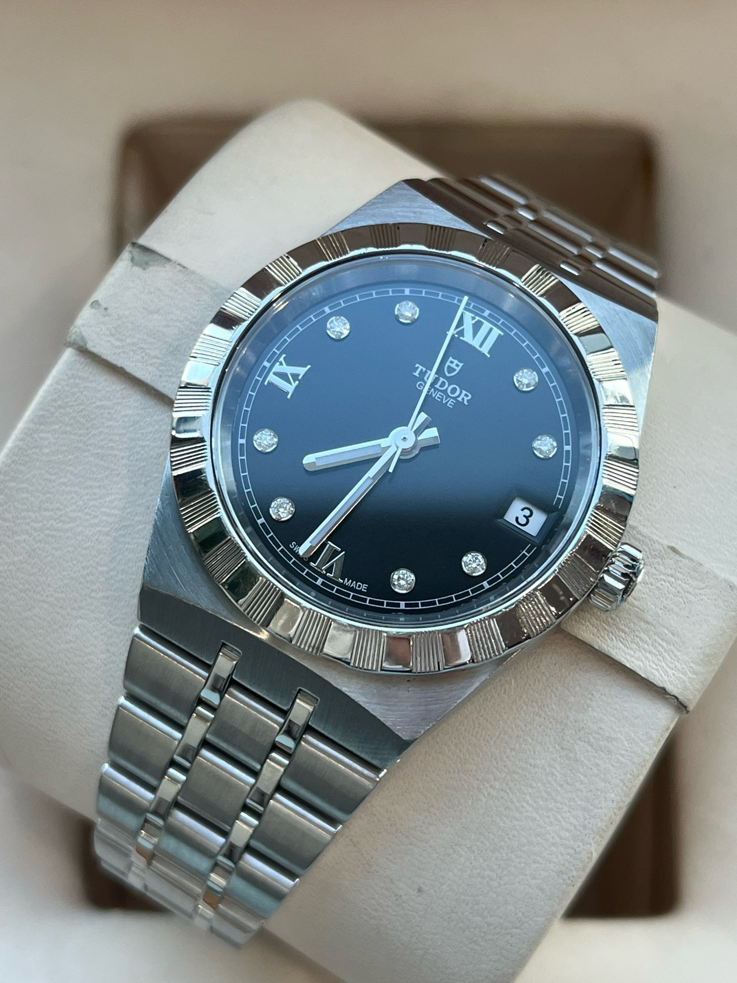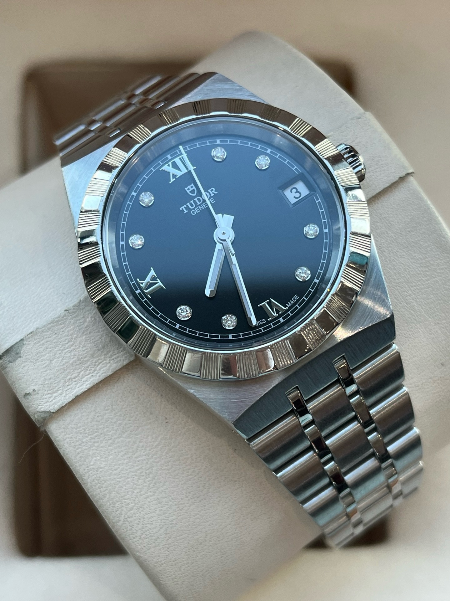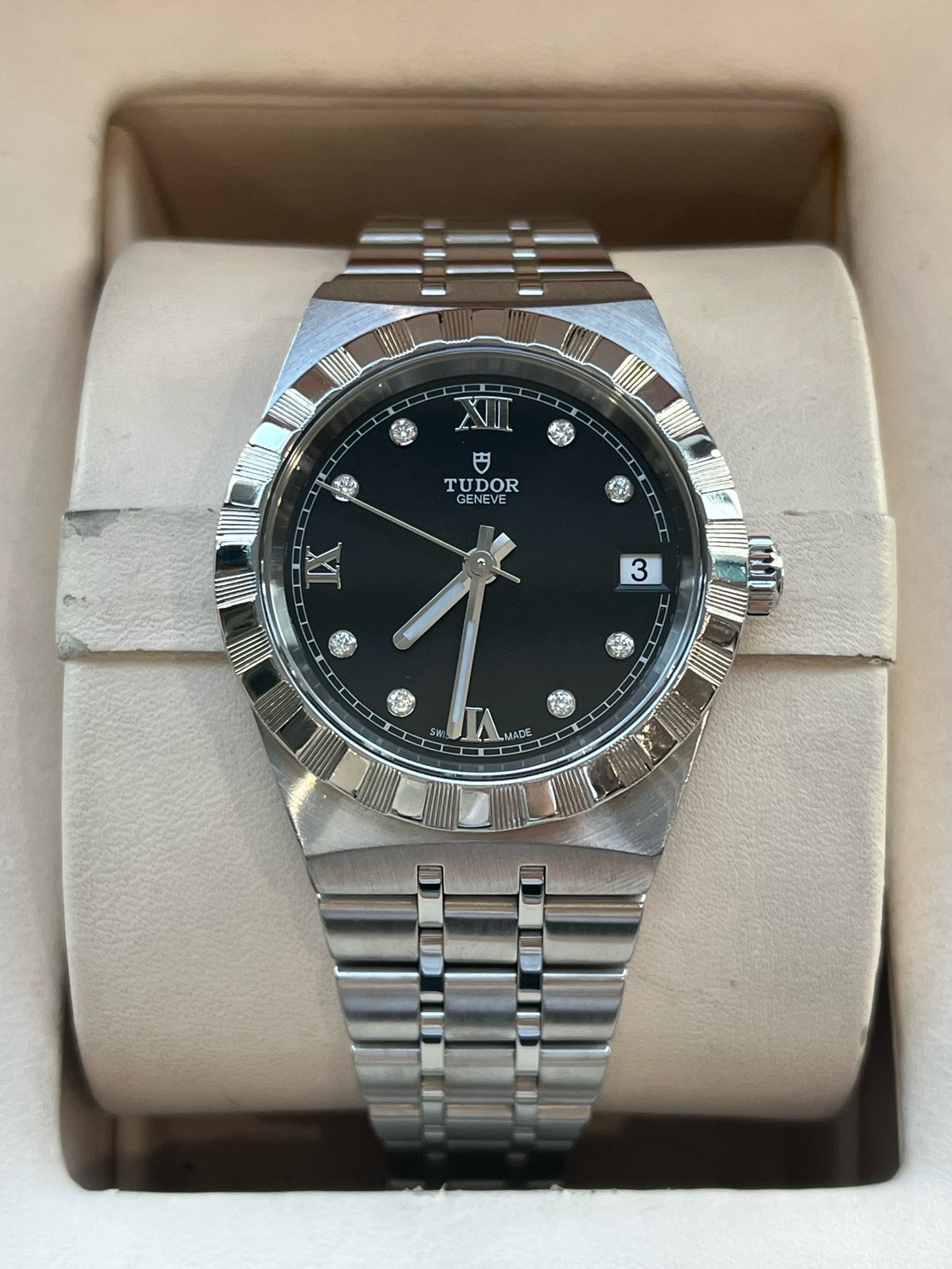 帝舵皇家系列M28400-0004、女士自动机械腕表、表径:34mm、材质:精钢/钢带、黑色盘面、钻石罗马刻度、日期显示、2021年全套附件、整表新原始品相、原价26300
