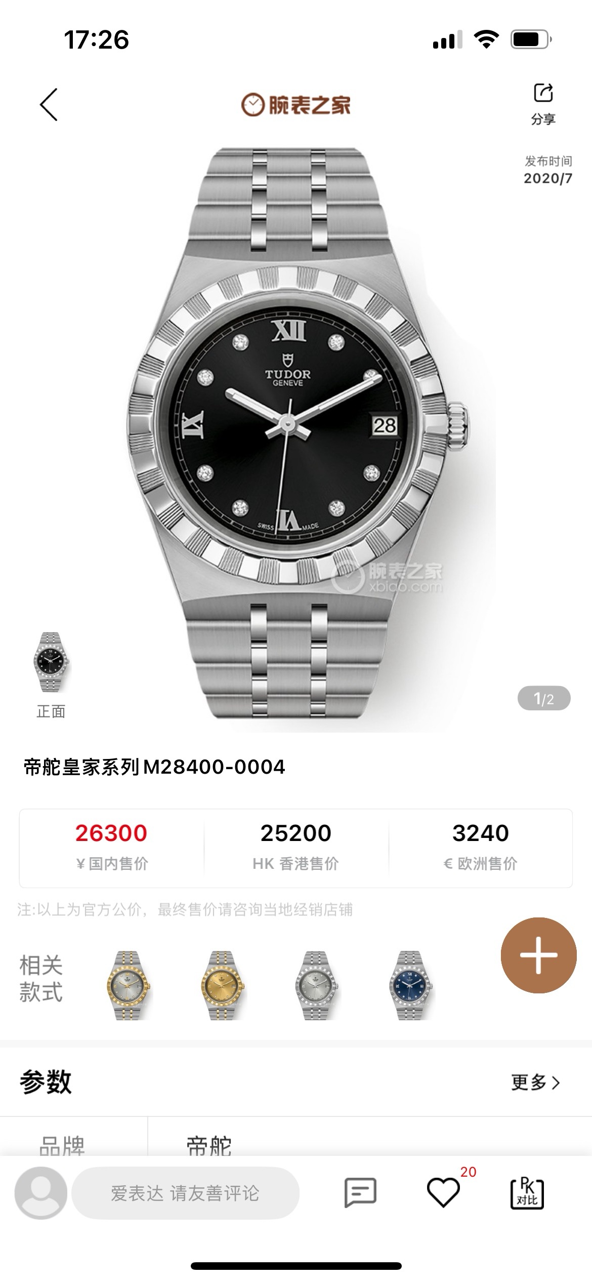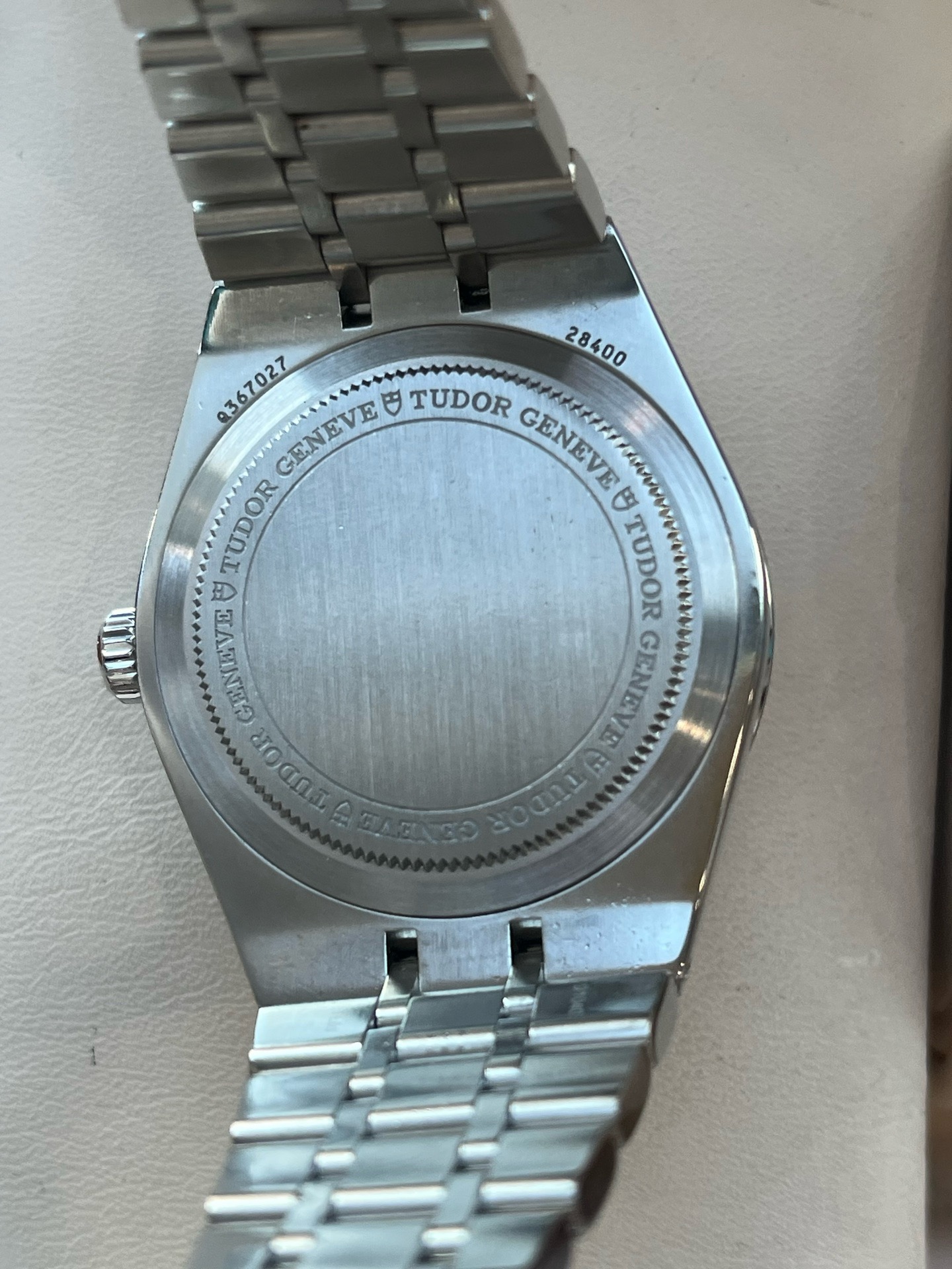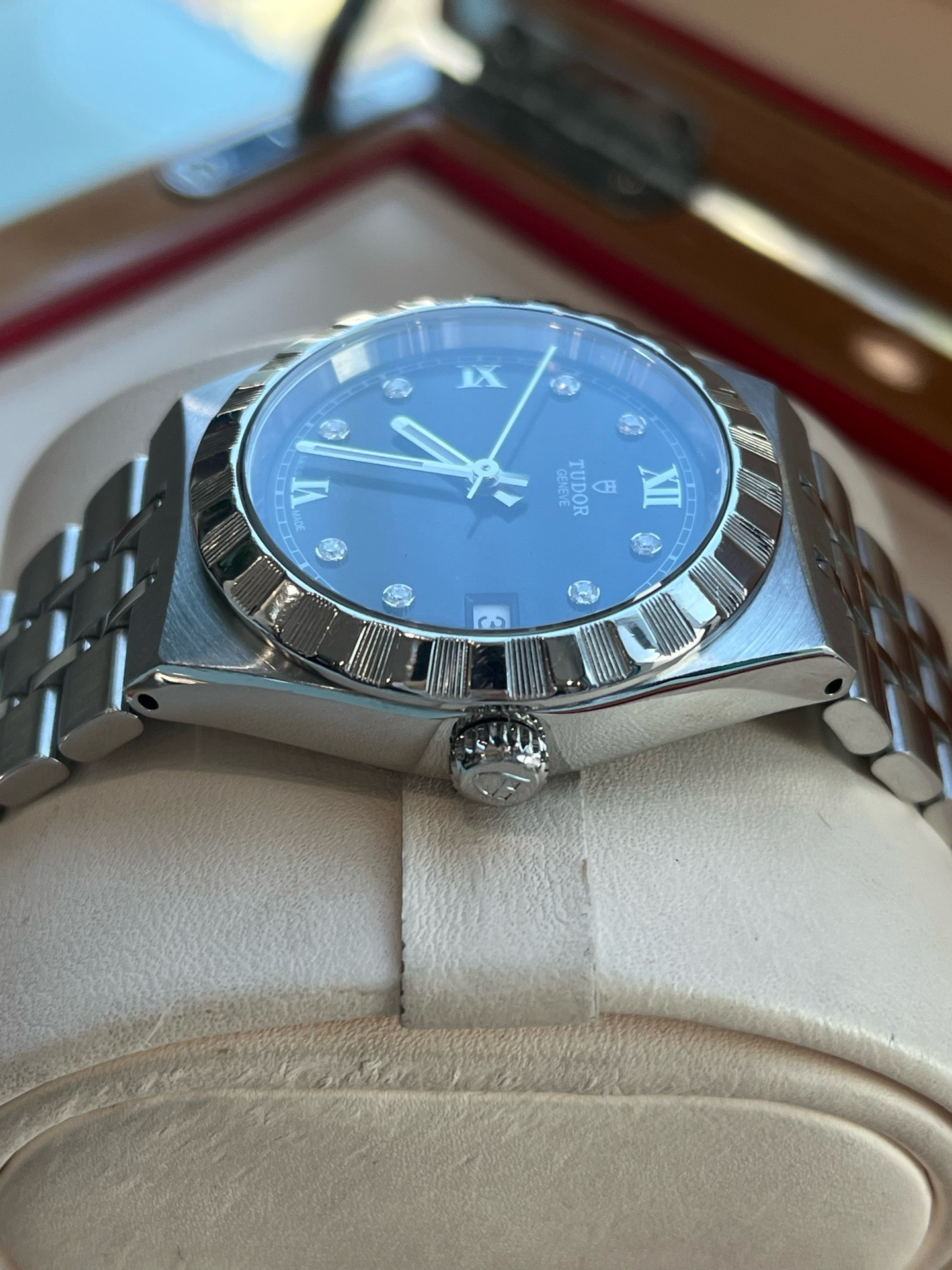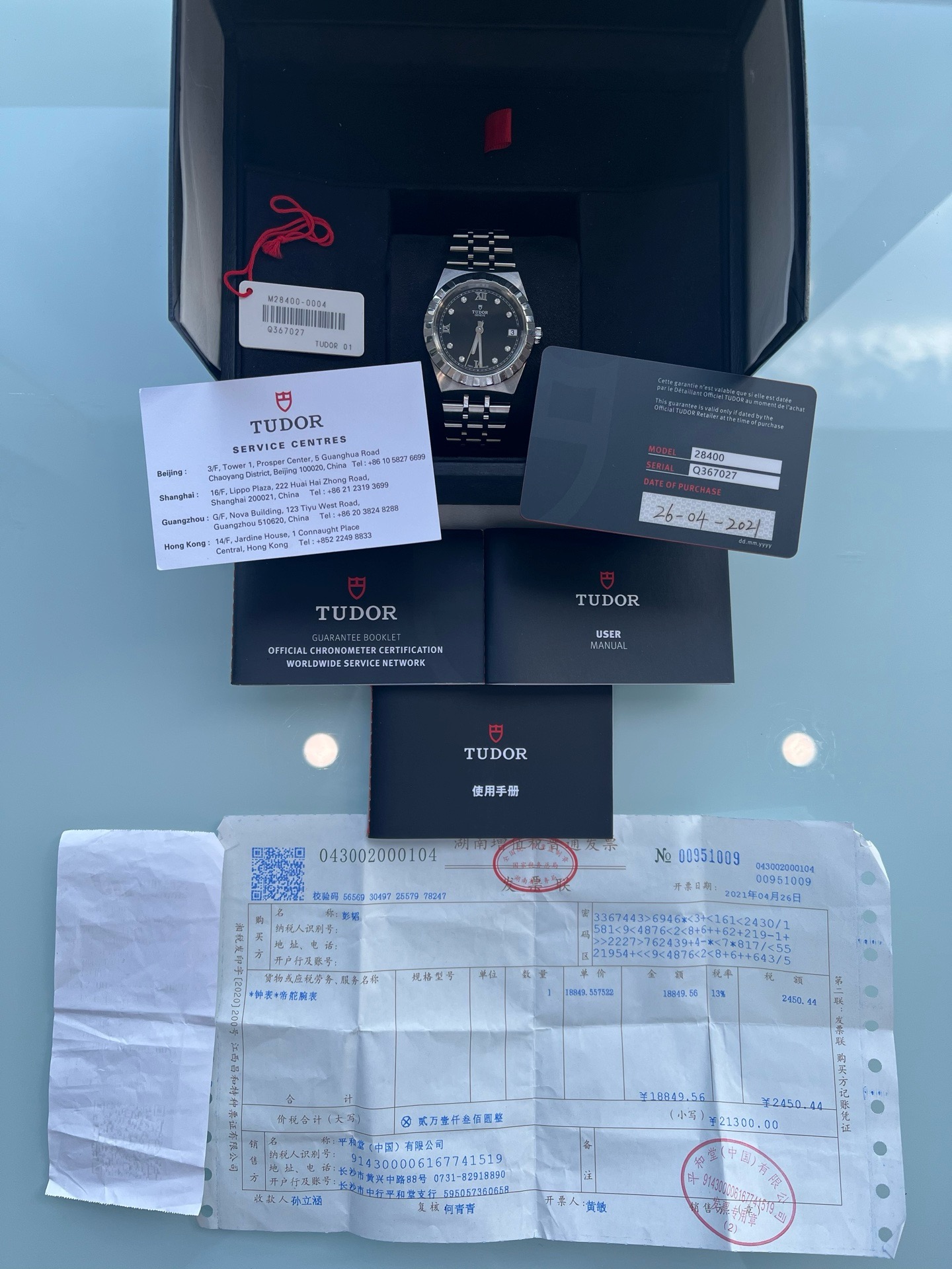 帝舵皇家系列M28400-0004、女士自动机械腕表、表径:34mm、材质:精钢/钢带、黑色盘面、钻石罗马刻度、日期显示、2021年全套附件、整表新原始品相、原价26300