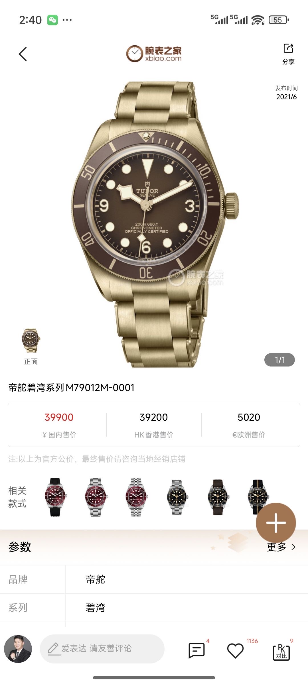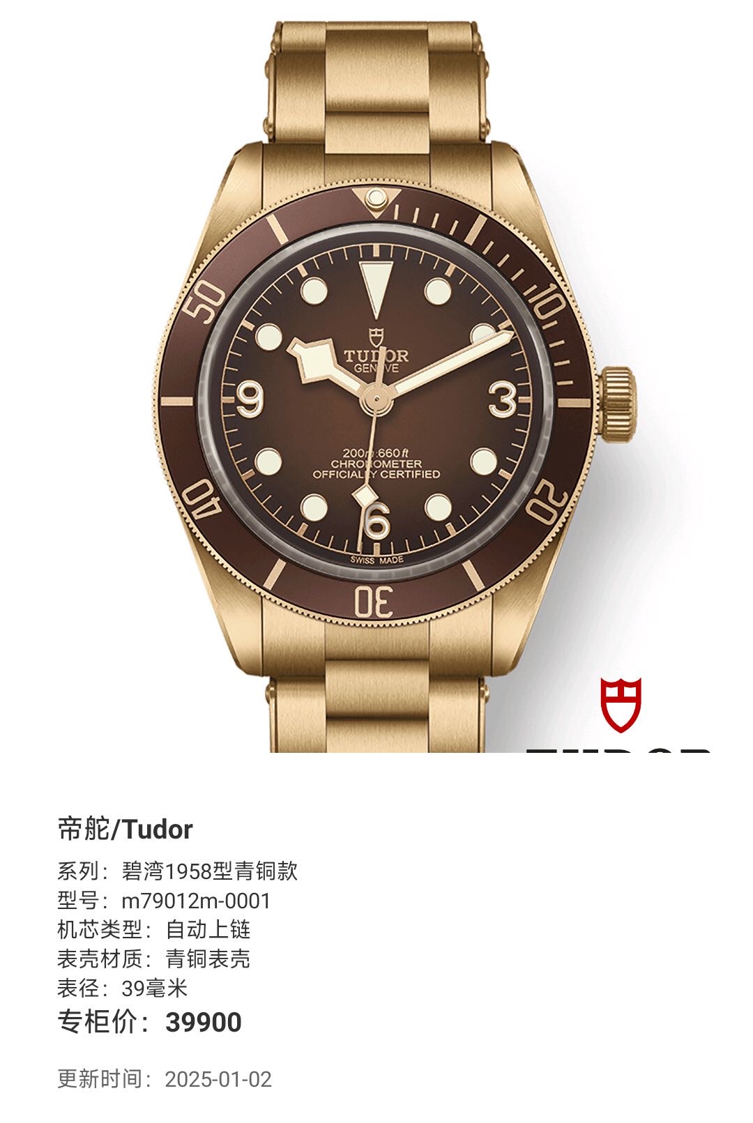 帝舵/Tudor 碧湾1958型青铜款 m79012m-0001 自动上链 青铜表壳 39毫米 专柜价39900