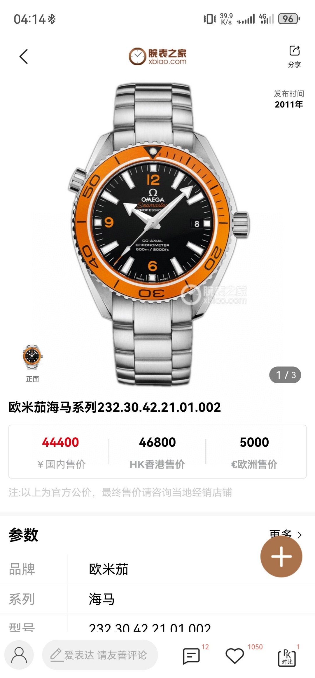 公价44400欧米茄海马系列 型号232.30.42.21.01.002自动机械 钢 材质 42mm表径 日期 显示功能 单表