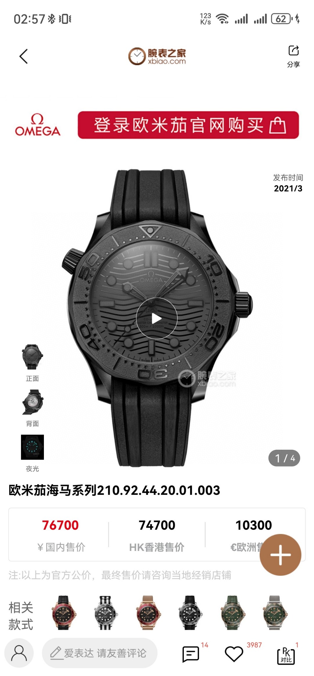 公价76700欧米茄海马系列 型号210.92.44.20.01.003 自动机械 黑色氧化锆 陶瓷 材质43.5mm表径 防磁 功能 单表